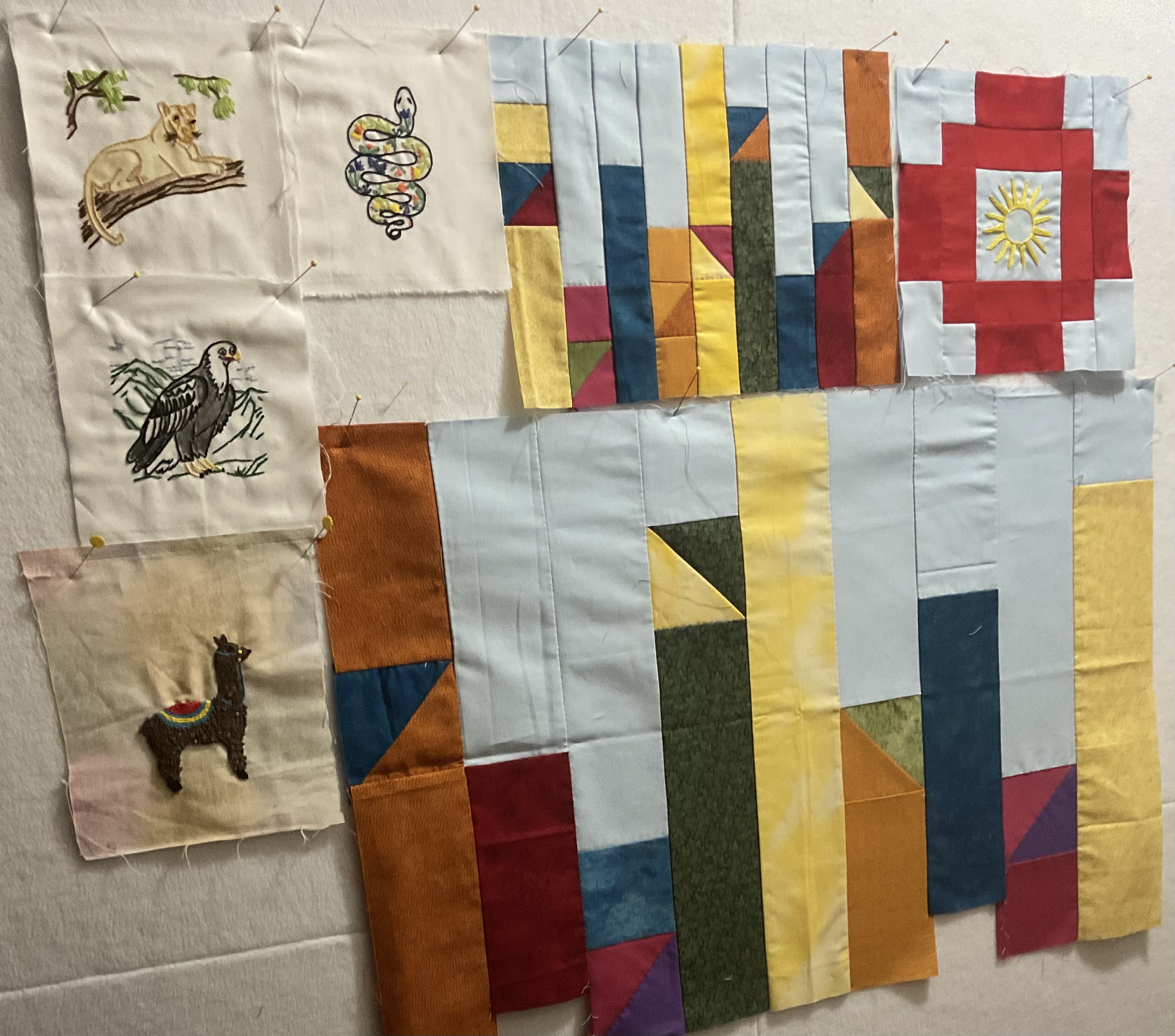 Helen, I have no idea what the quilt is going to look like. The site is Murder Mystery Quilt and this years BOM is Murder at Machu Picchu. The site owner has written a mystery book and we are sent a chapter and one or more blocks to complete each month. If we submit photo of our completed block by months deadline we are sent a clue to solve who the murderer is and have a chance to win some prizes. We are given a couple of options for the blocks, usually a patchwork and a paper pieced. You pick what you want to do so no two quilts are going to be the same. I have opted for embroidery instead of paper piecing. I posted my blocks Jan - May. I’m remaking the large block. I decided to reduce by 50% after making January block. We were given recommended colors to use and yardage needed.