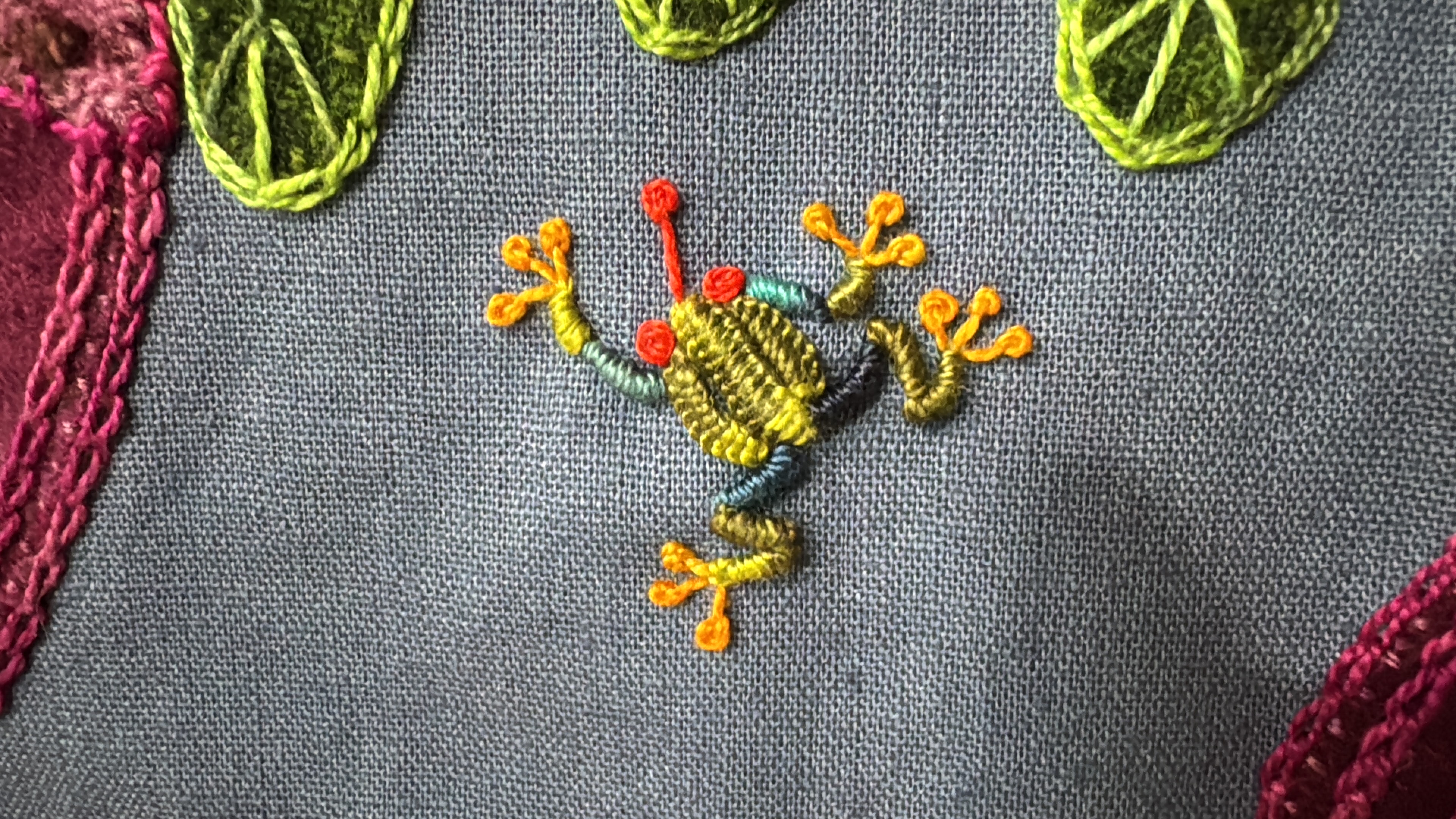 I had planned to participate in this SAL, but other projects have got in the way. Someday I will get this done. In the meantime, I wanted to share a frog I stitched on a quilt I recently finished. Photo is from before longarming. It’s amazing what you can do with just thread! I used bullion knots for legs, double cast-on stitches for body, pistol stitches for feet and tongue and french knots for eyes.Carole Berry