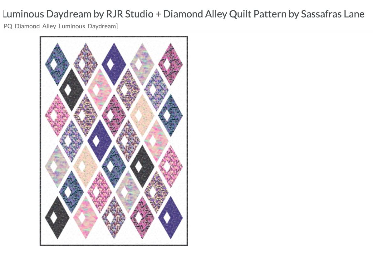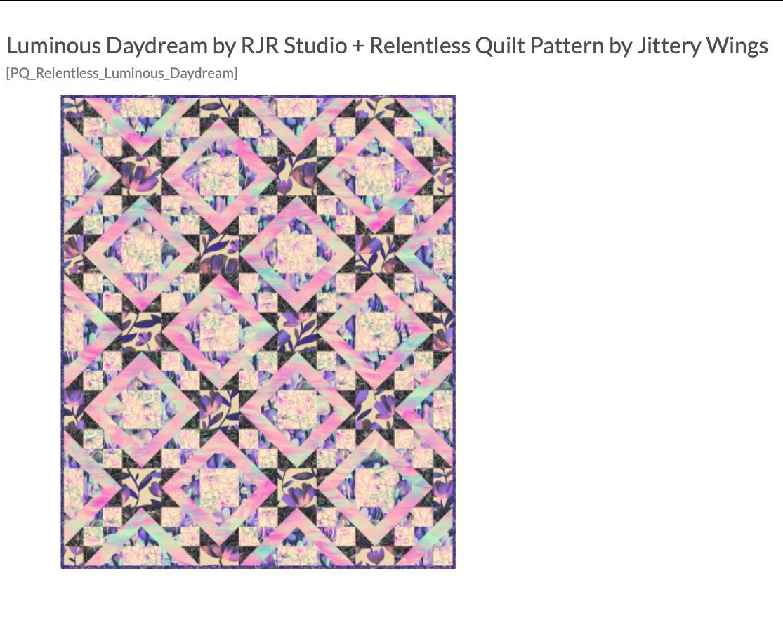 Penny, I went to the RJR website and they had a couple pictures of quilts using that fabric line. I also drew up another idea in EQ8. HelenWOriginally posted by [email protected] View PostI recently purchased fabric from Quilt Show store - Luminous Daydream by RJR with no particular quilt in mind. Now I am trying to figure out a pattern to use. I went out of my comfort zone when I purchased. It is absolutely beautiful fabric but trying to figure what quilt pattern would be suitable. Open to suggestions.HelenW