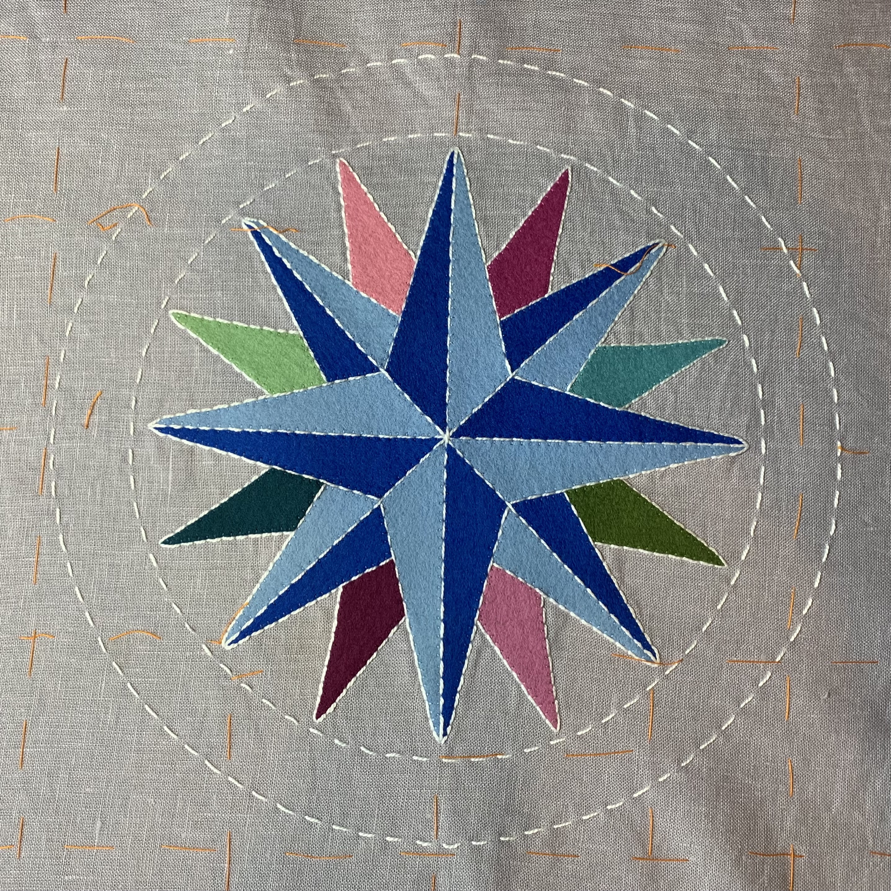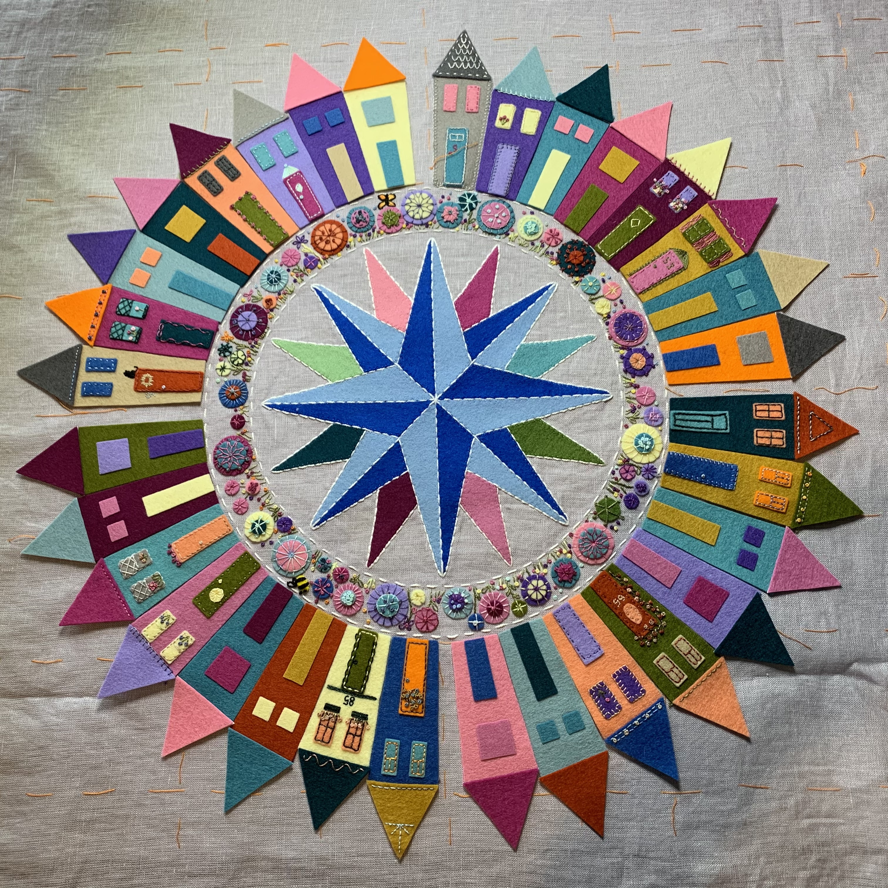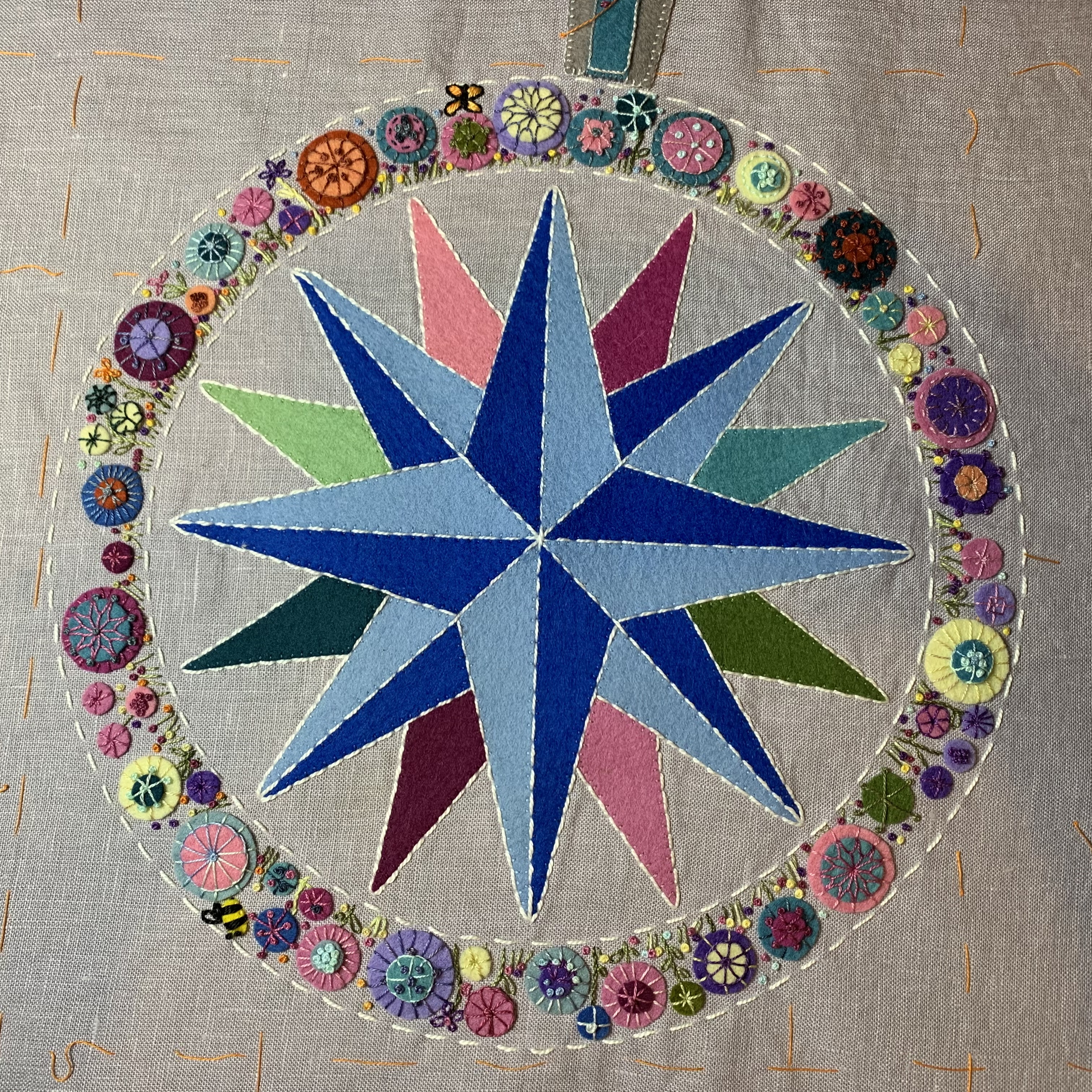 I’ve been working hard on my quilt while the website has been down and have made lots of progress. This is my finished compass in wool and outlined in pearl cotton. I decided to plant a garden in the inner circle rather than a road. Pleased with how this turned out. I’m now jumping ahead and working on small houses 3 and 4. Once those are done, I’ll attach all 32 houses to my wholecloth linen background. Loving this project! Thank you TQS for making this wonderful Wendy Williams pattern available!