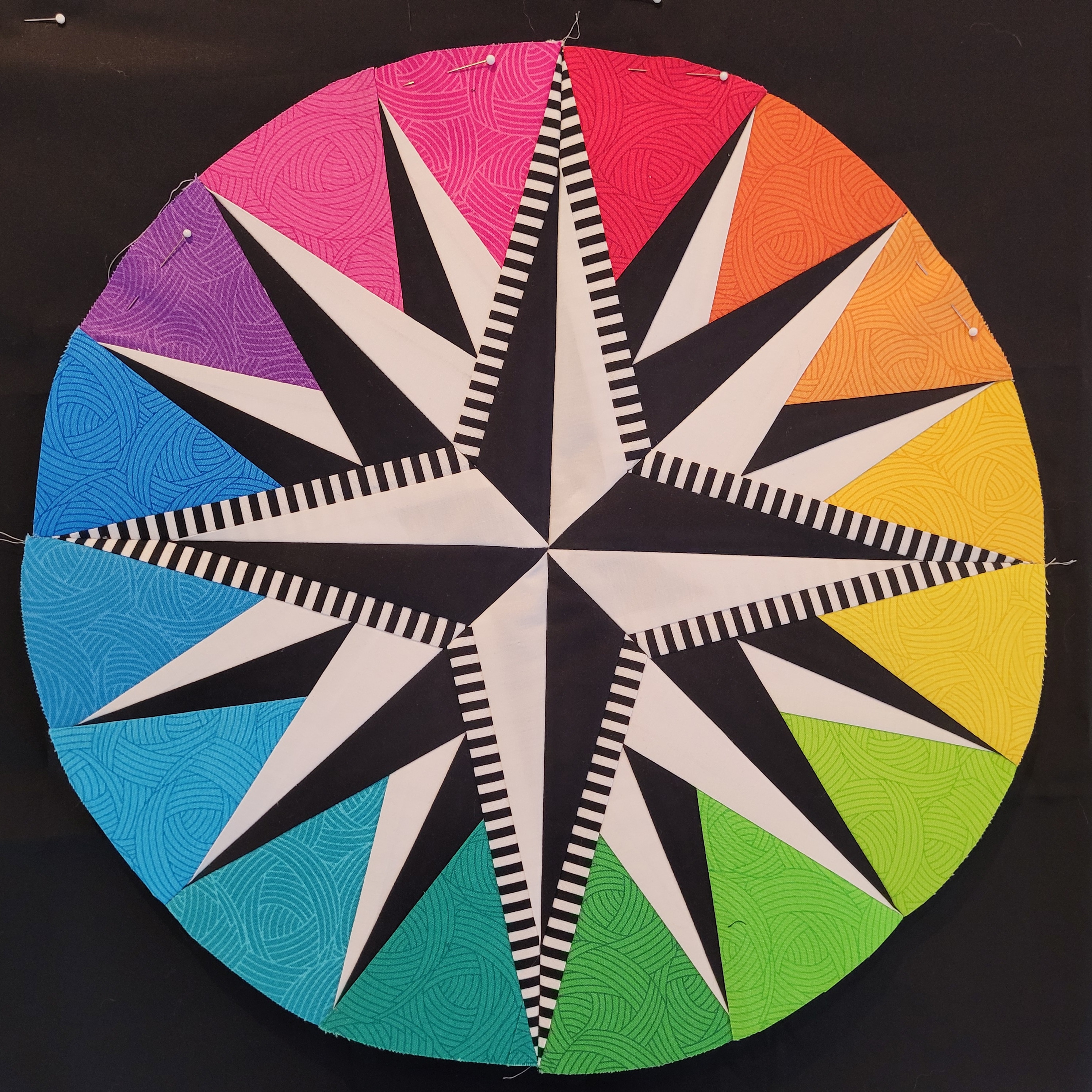 The compass was not appliques but pieced in the same way as piecing with paper or freezer paper. The pattern is created in software and then lines of stitching and tackdown are are digitized. A different color selection for each stitching line stops the sew out and the next piece of fabric is placed and sewn just as one would for traditional paper piecing. I use a light tearaway stabilizer and a lightweight mesh to back the design. Yes, the compass is broken down into quadrants. Only one pattern has to be digitized and then it is duplicated as many times as needed and then the pattern is mirrored to create 4 exact copies of each.Originally posted by "TrueColors" post=154610This is Awesome! So, if it was in the hoop, does this mean the compass was appliqued down, or is this just a screenshot? And it will be done in the hoop in wedges? I admire your knowledge & creativity in being able to do this. I'm using Tim Holtz's fabric for my roads (looks like what you used in wedges). Thx.Originally posted by "Libbi" post=154594This is my second Mariner's Compass that I digitized in my Bernina embroidery software and pieced in the hoop--just to see if I remembered how to do it. It still has to be done in wedges and then sewn together. Now I'm not sure which one I will use.