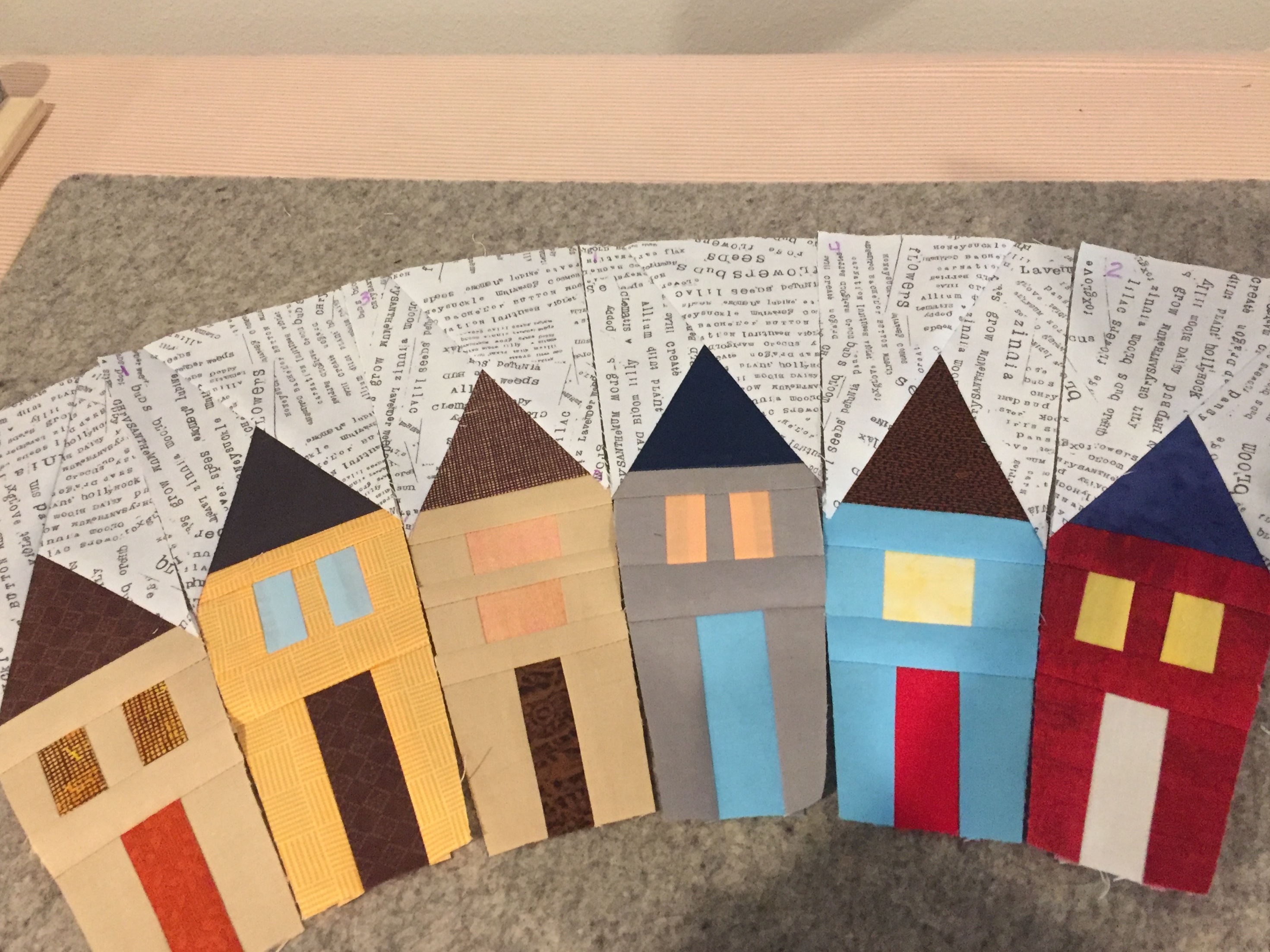 a little trick to keep track of the order of the house layout, use some of the freezer paper off cuts to make numbers which you can then iron on to each house to make sure the stay in the correct order.