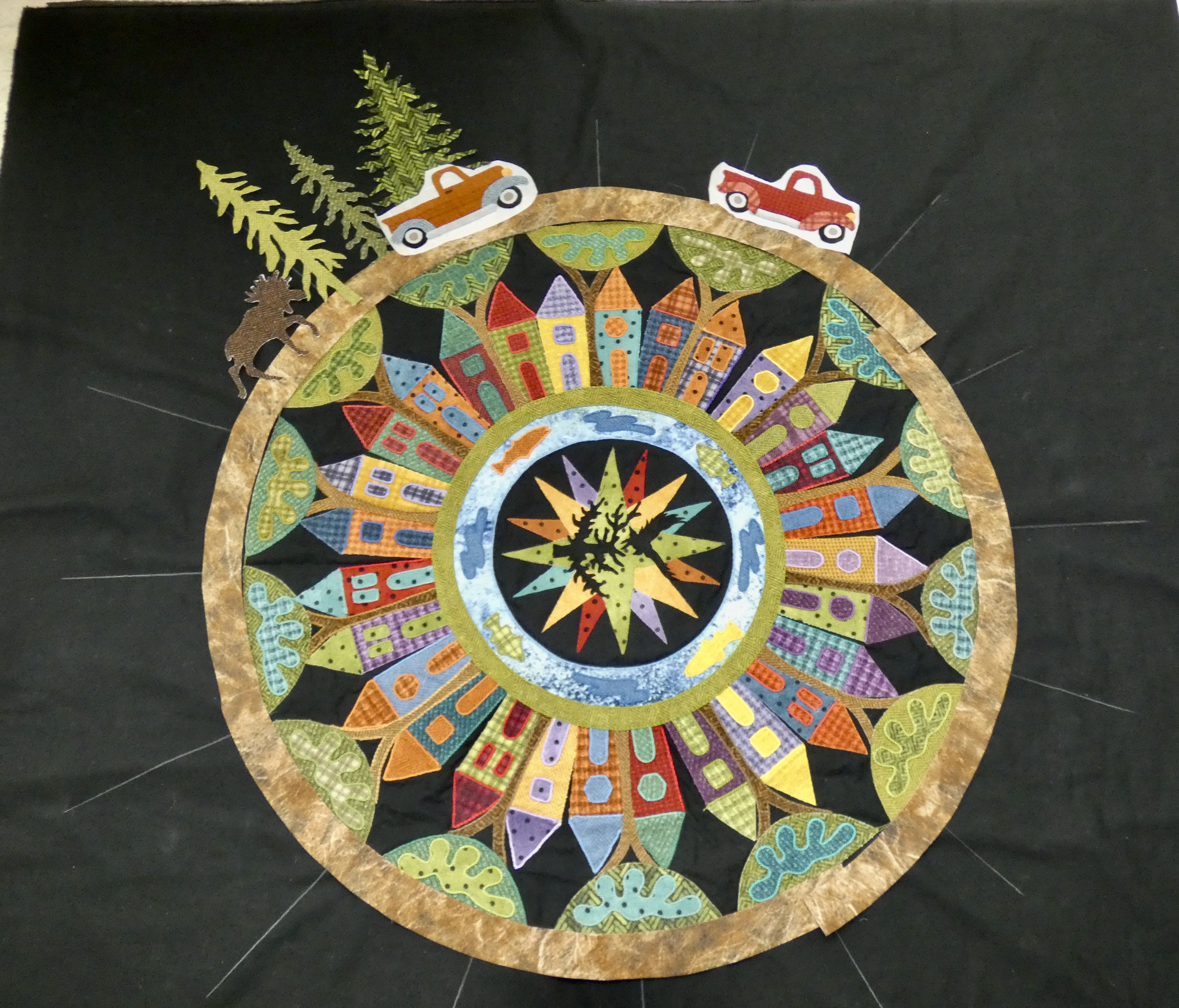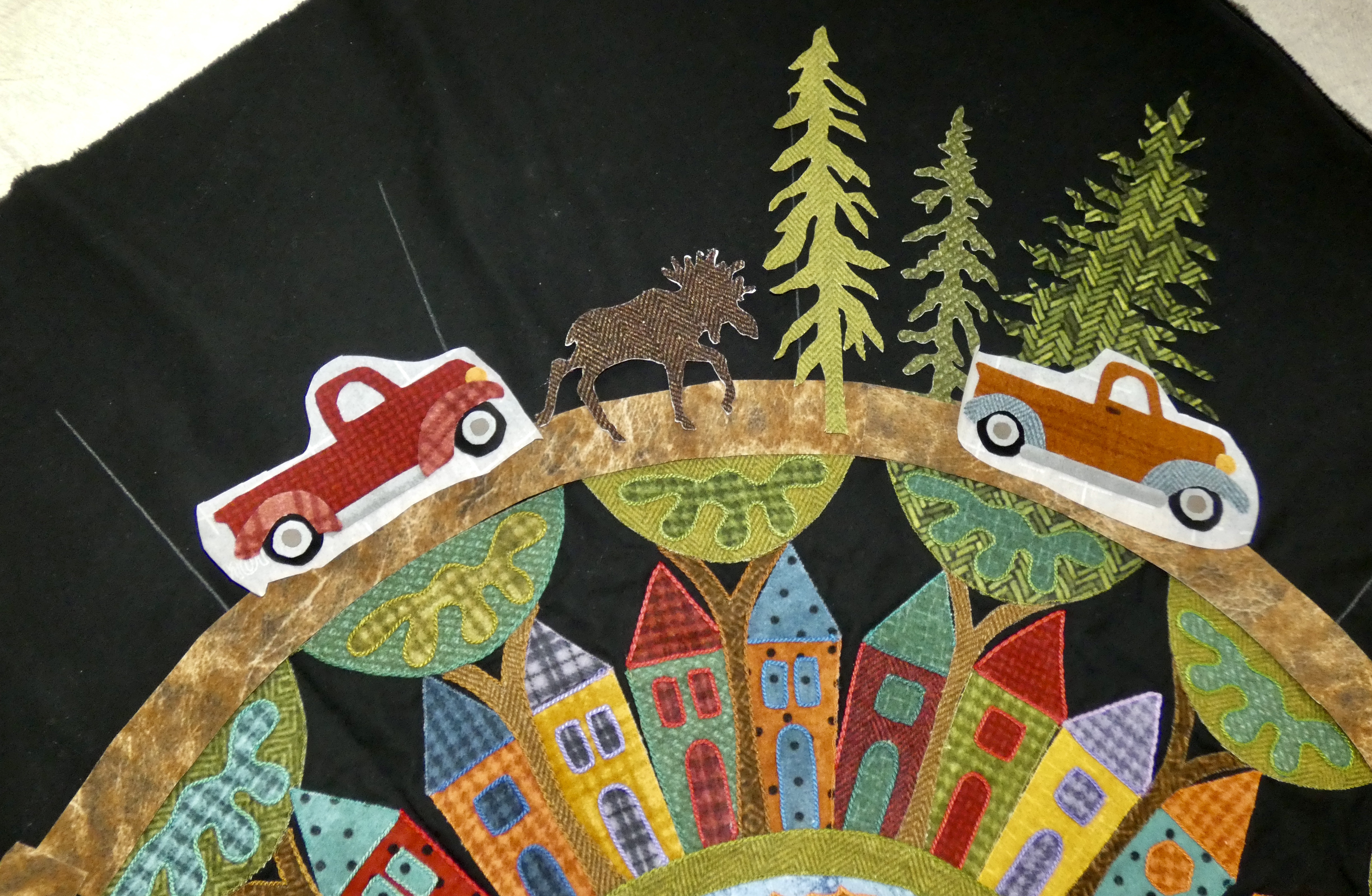 The road is dirt brown flannel. The trees are the many evergreens in this area. I just let my ideas evolve as I go. I don't try to