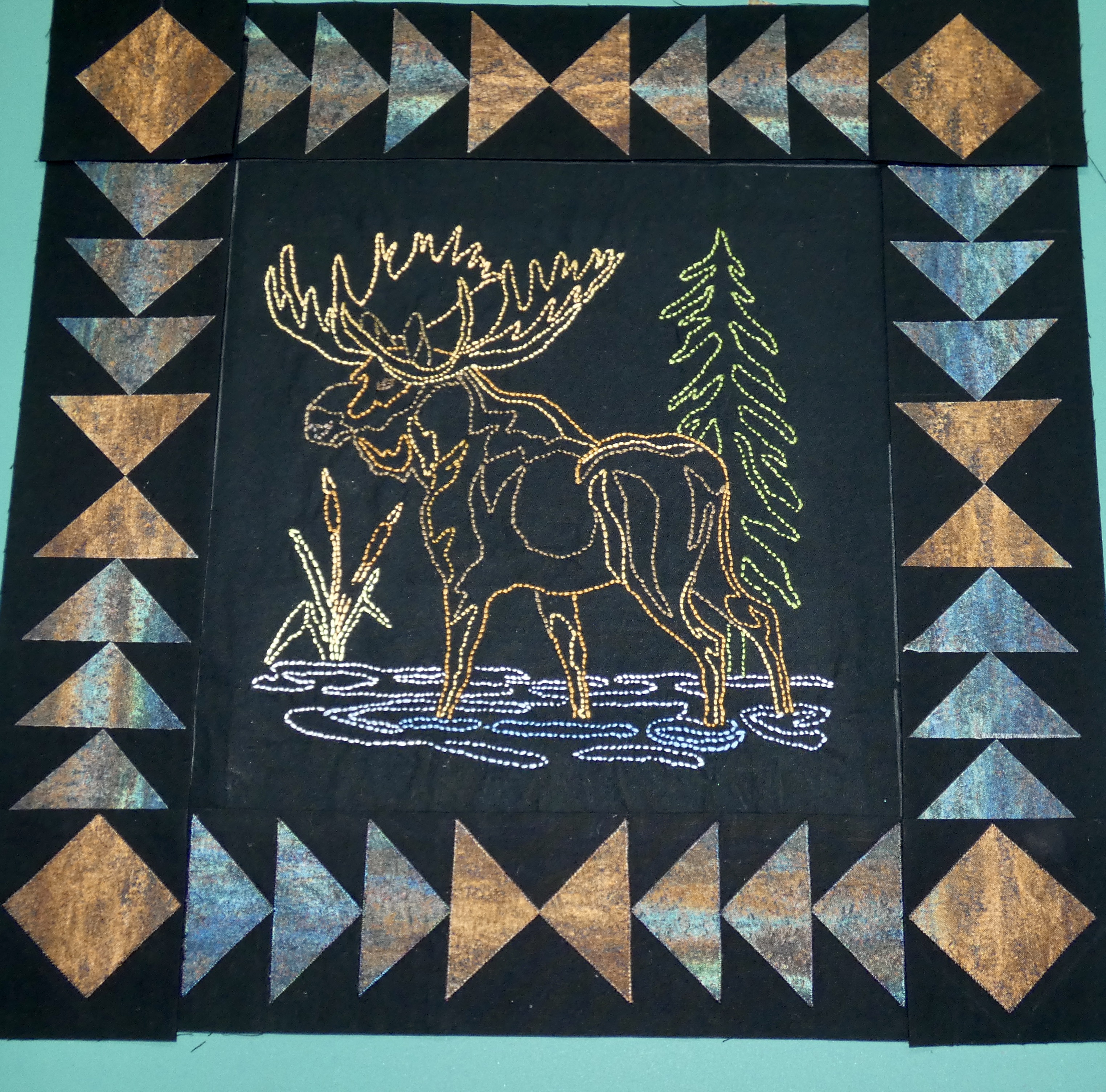 Carole B. I traced the moose on white fusible stabilizer and fused it to the back side. I drew in the tree and cat tails also on the stabilizer. I look at the back side when I stitch then the right side to butt the stitch up. Slow but it works.