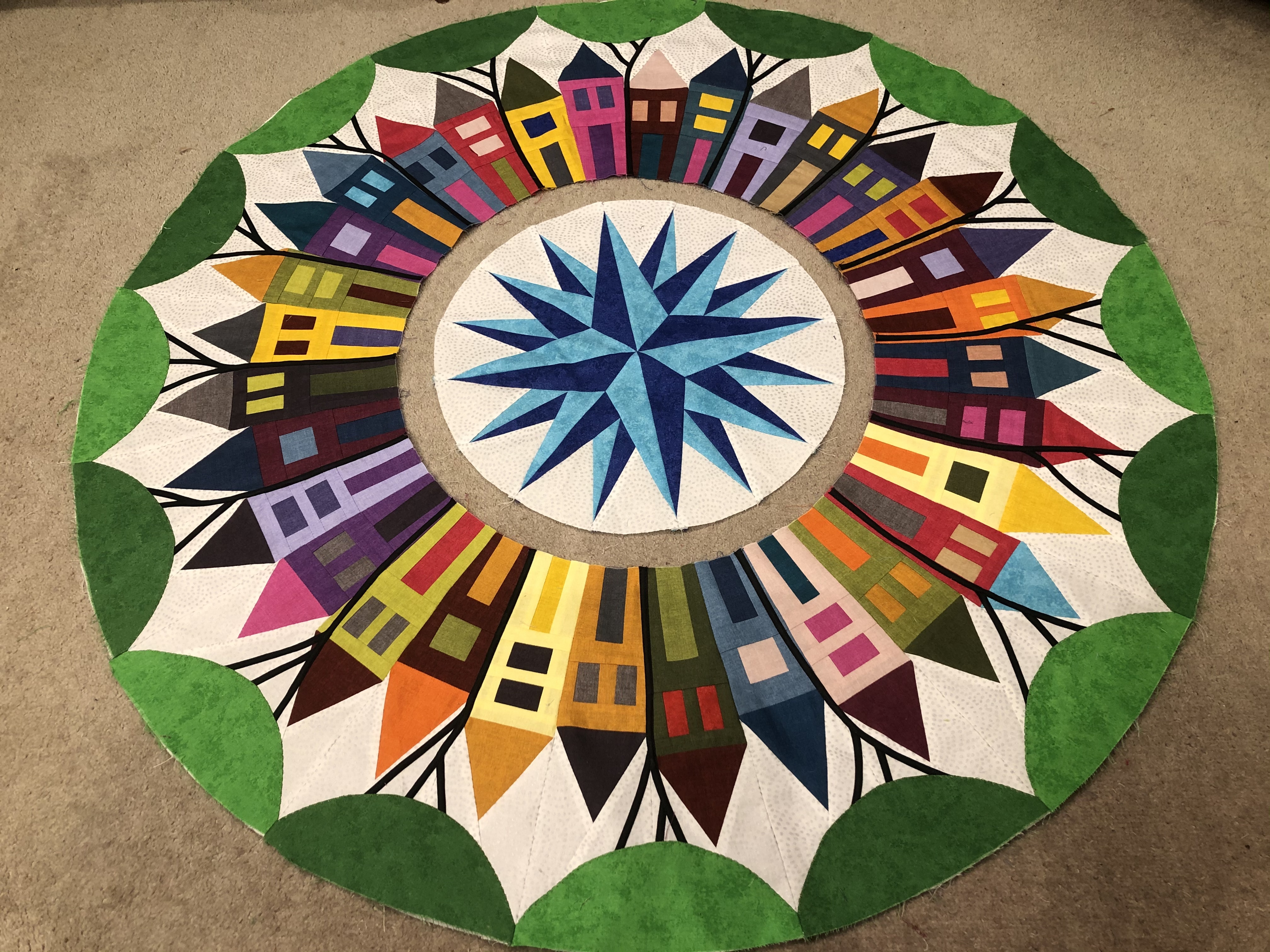 When I joined my house blocks, despite me using 1/4” seams, the houses would not lie flat. I unpicked my seams. I calculated the angle for each house block (minus seam allowances) needed to be 22.5 degrees. I discovered the tree template width provided this angle, although the height didn’t match my blocks. So I made a new template and added 1/4” seam allowances to the sides. This enabled me to carefully trim my tree/house blocks and restitch my seams. I got there in the end thank goodness! I’m hoping the height of my blocks will still work when I come to attach the roads.