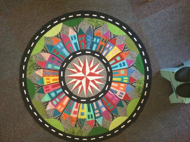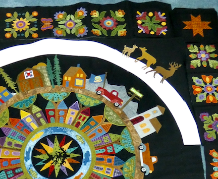 is not fused down yet. Playing around. The brown dirt road leads to the country in my quilt. Sure having fun.
