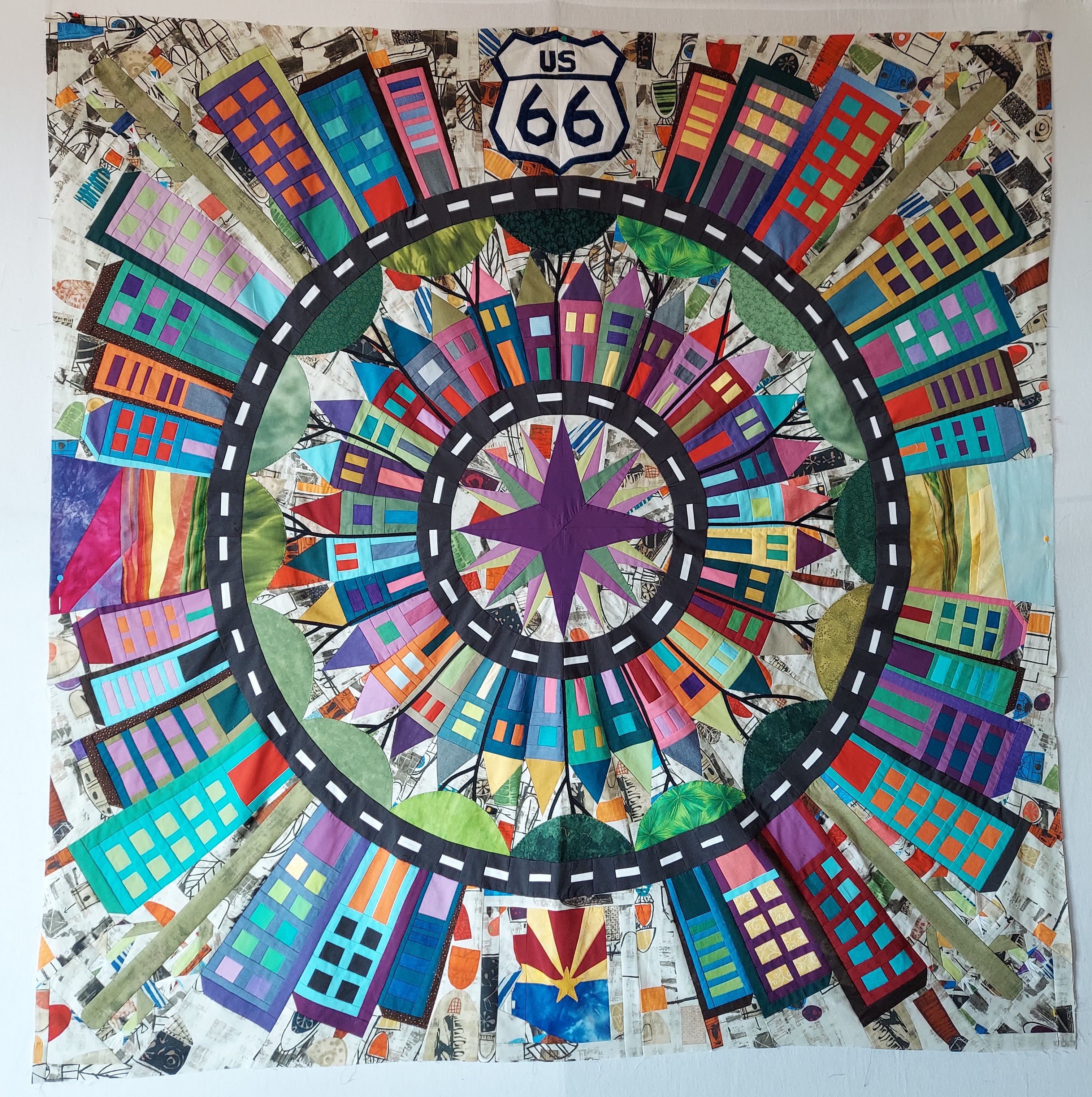 (This could be long, so skip if desired.) Never thought I would have a quilt with a story other than it is pretty. I started this with many in January. Had no idea as to our path the next 6 months. We've been winter/snowbirds in Quartzsite, AZ for a couple years. This year in early February we decided on a whim to go to Kingman, AZ. We decided to look for a home here. Liked the community, wanted to stay, and we were not looking forward to returning to Salt Lake City, Found our forever home!!!!!! Bought and returned home to sell everything. I do mean everything (for me 2 older long arms and frames, 3 sewing machines, fabric-oh my, art supplies supplies and equipment, looms etc. I will stop, You get the picture). Hubby went through the same with tools, music items..........Any way here we are, Loving every minute. When Barbra posted the sky scraper parameters I became intrigued. The she posted the small houses/city and I knew what I wanted to do. This was our journey. So we live about 15 miles north of Kingman off Route 66. Arizona is known for its sunset to the west, but the sunrises can be very gentle and soothing to the east. I decided to include the AZ state flag. That made thins directional NSEW. I didn't want to be signal distress/disrespect by having the flag upside down. Then came the sunset and sunset which, that set the east and west. I have so enjoyed this journey. By the way we bought a 1968 Corvette Convertible that he is restoring, so I know the 70's are the beginning of all great things.Tags: None