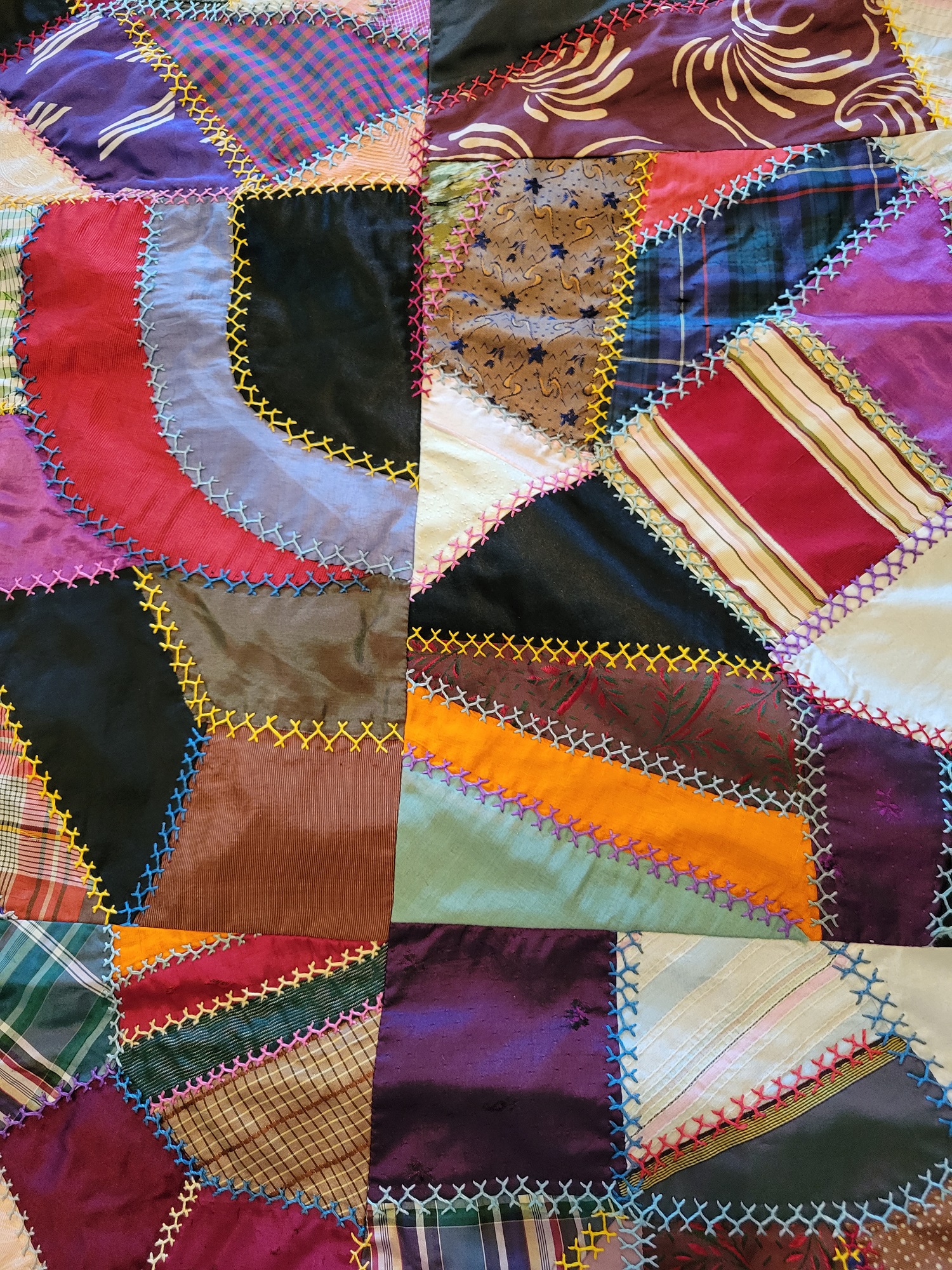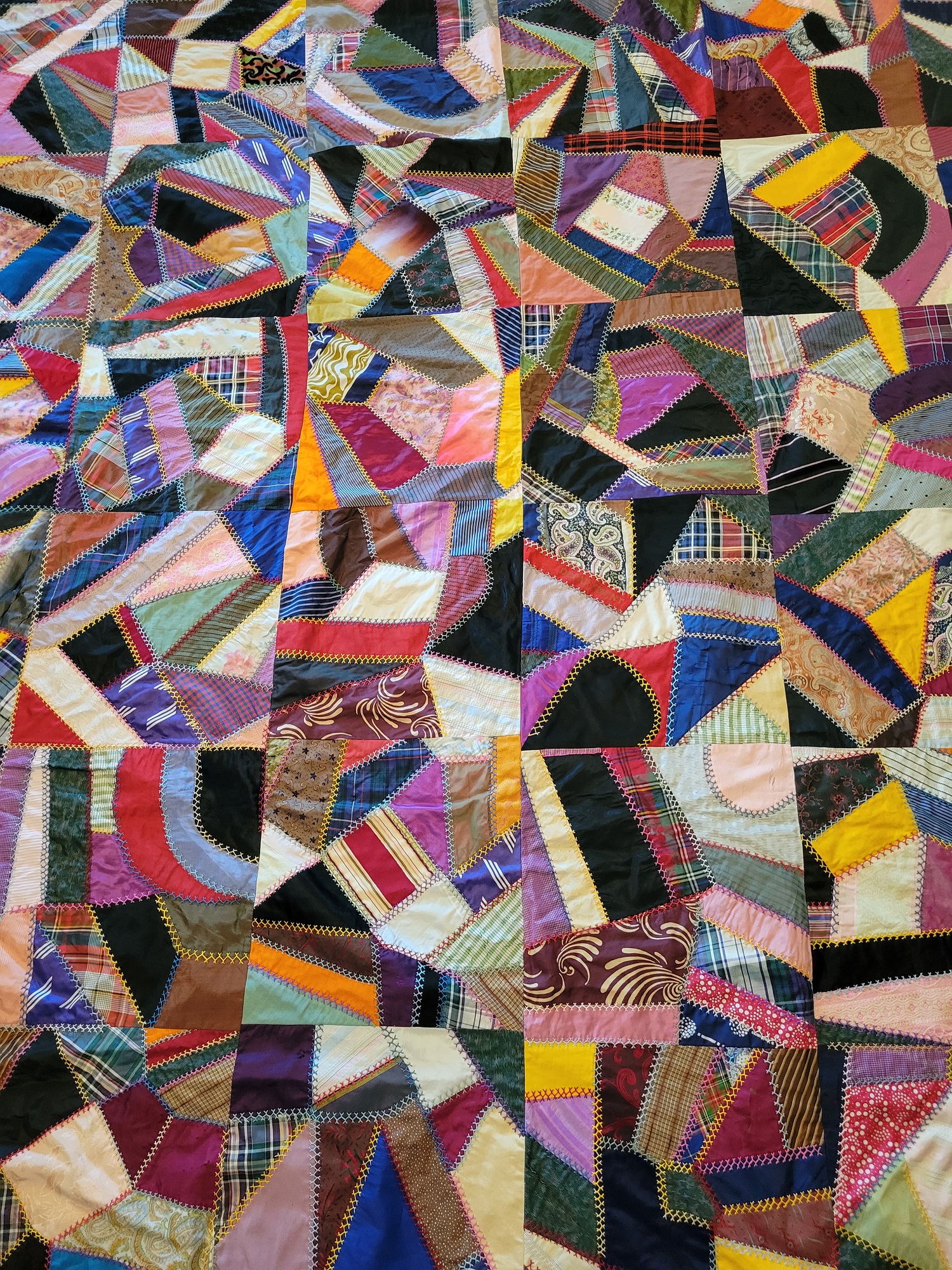 I come from a family of quilters. My great-great aunt was a milliner and in approximately 1905, she made this crazy quilt from the scraps left from the hats she made. She gave it to my grandmother, her niece, who was also a quilter. There was also a pillow topper to go with it, and my aunt got the quilt and my mom got the pillow topper. Both my mom and my aunt were quilters as well and my mom had a piece of the pillow topper framed and registered with the Minnesota Historical Society. My cousin ended up with the quilt and I got the framed pillow topper. However, in downsizing for a move, my cousin (who didn't do a lot of quilting) gave the quilt to me! I ma by no means an expert quilter, but have done many quilts, ranging from art quilts to traditional quilts, and receiving this old quilt was extraordinary. It's a real treasure!