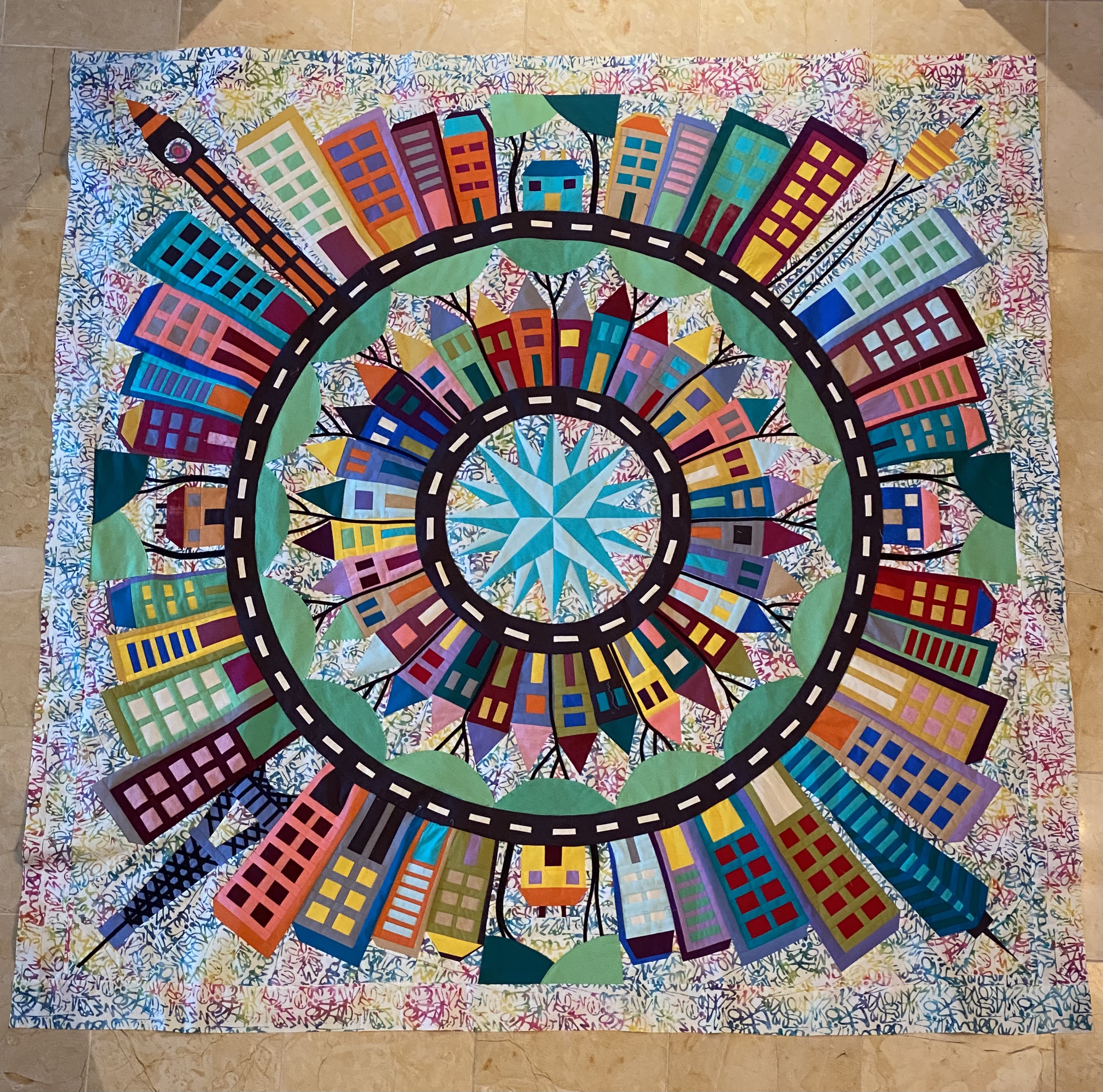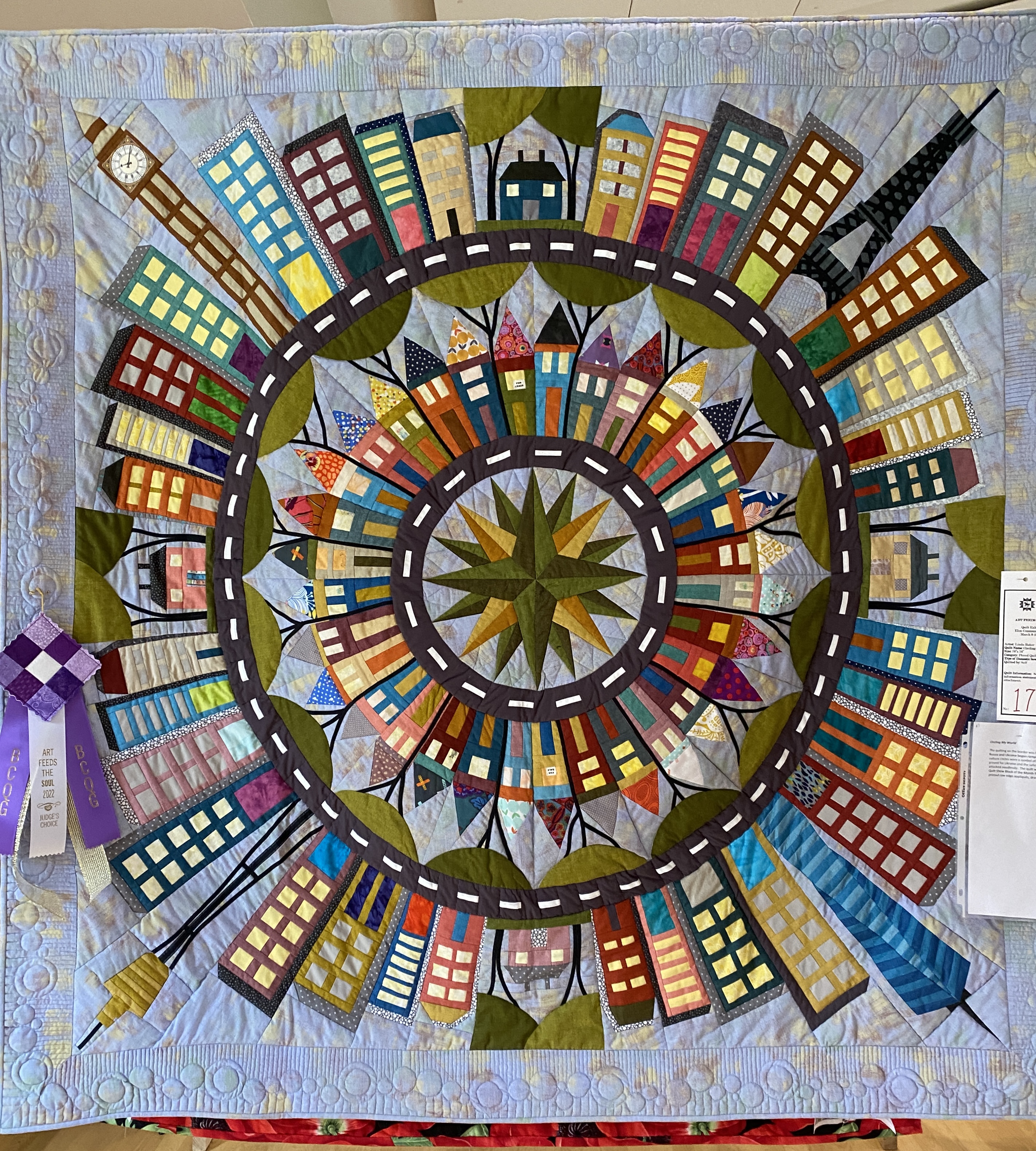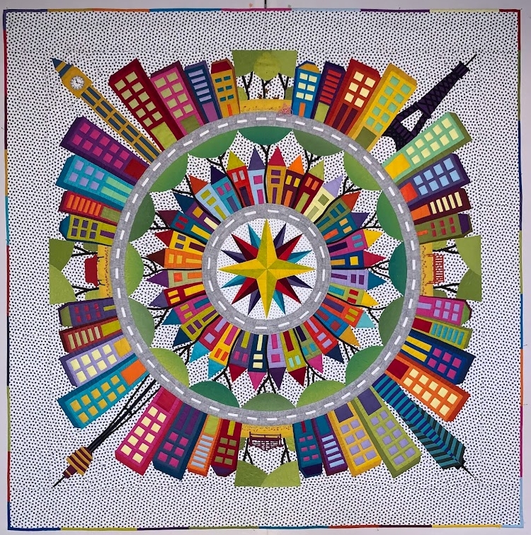 At our local quilt show Art Feeds the Soul Quilt Show it was awarded Judges Choice and at the end of the show it was tied for the Viewers Choice. I renamed the quilt as I began the border. The rumblings of war in the Ukraine were going on and that morning I read that in Chinese culture circles are a symbol of peace and harmony. At that point the name of the quilt became Circling My World. Each circle around the quilt touched another circle and with each stitch came with a prayer for peace.