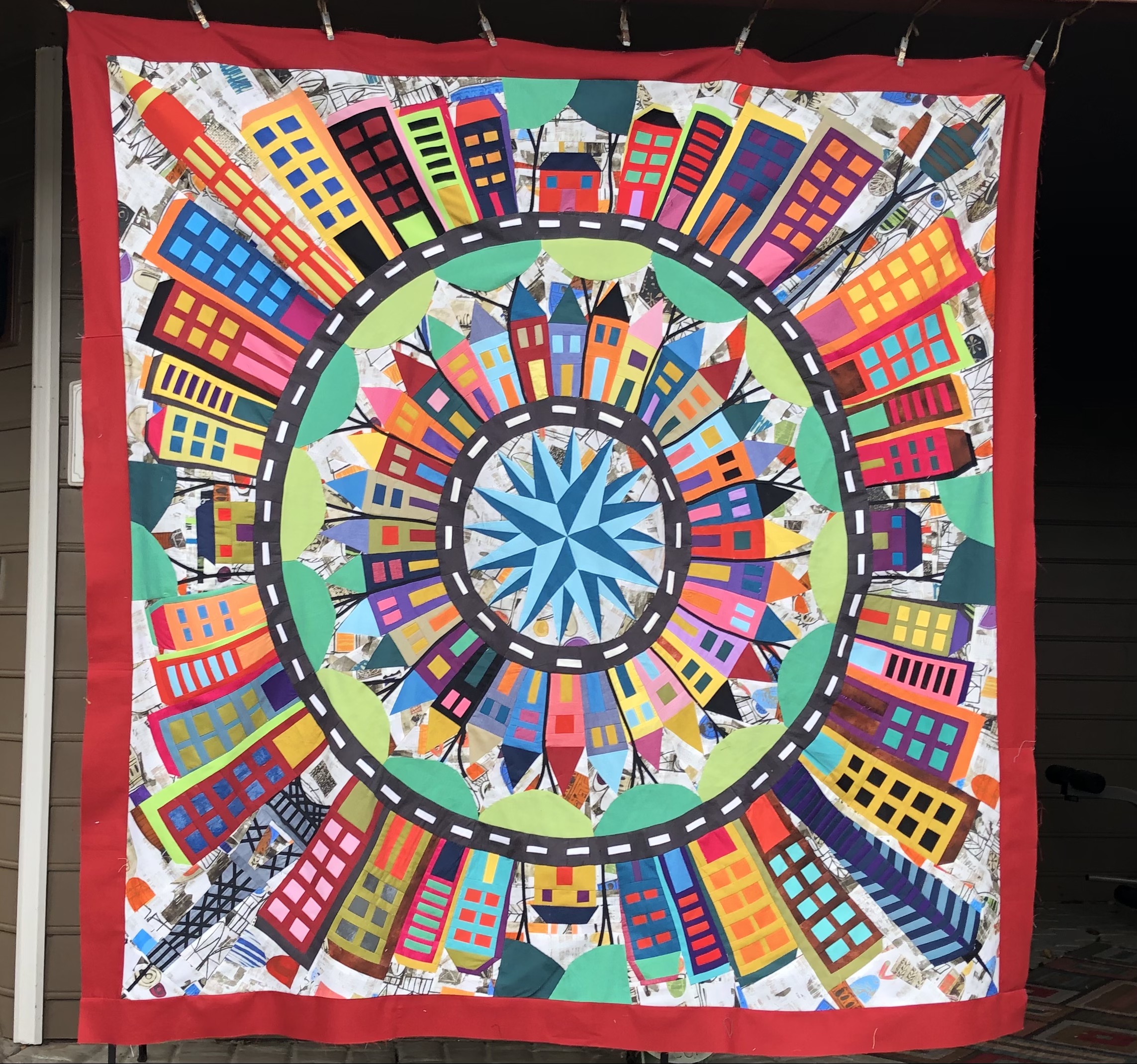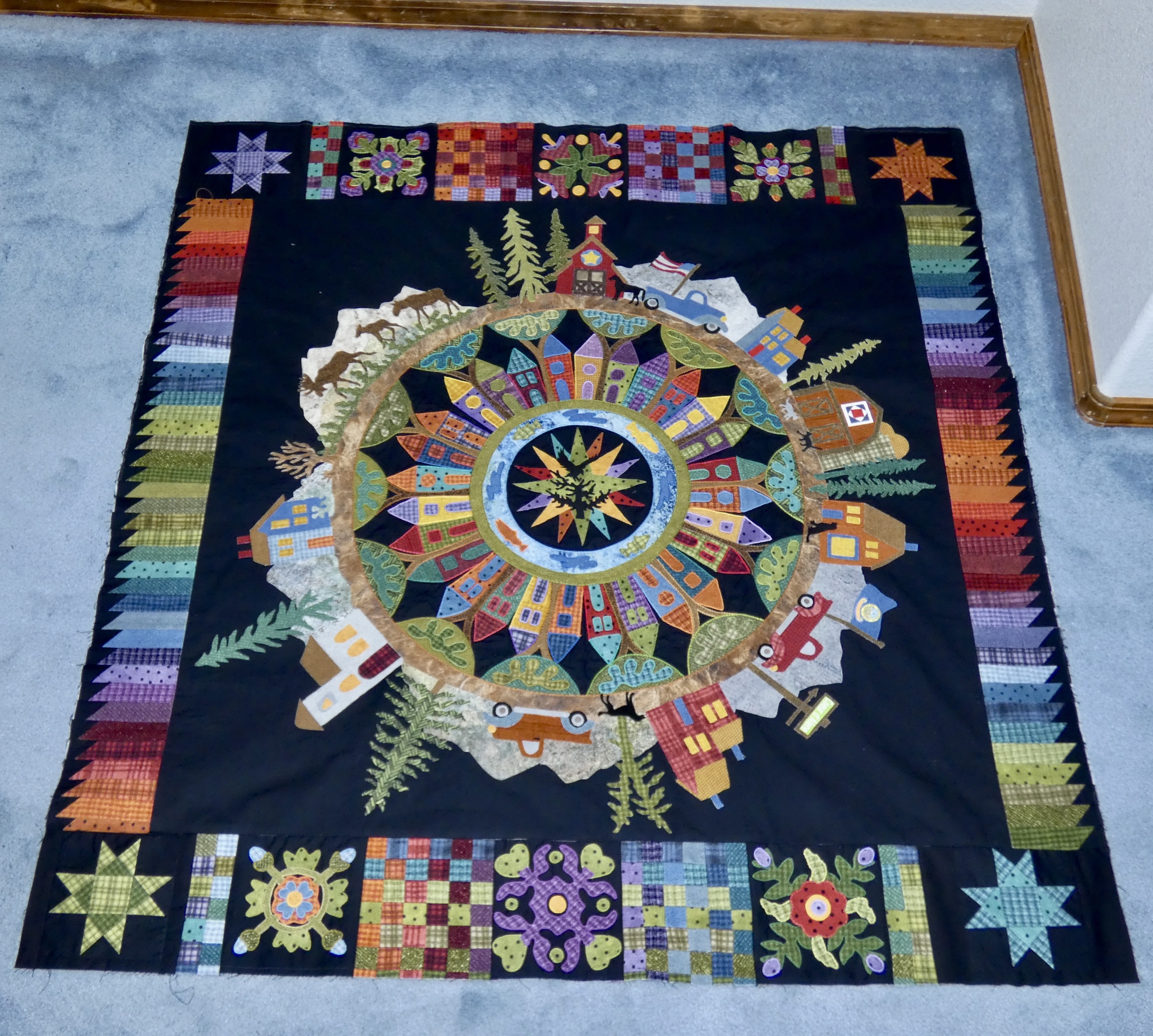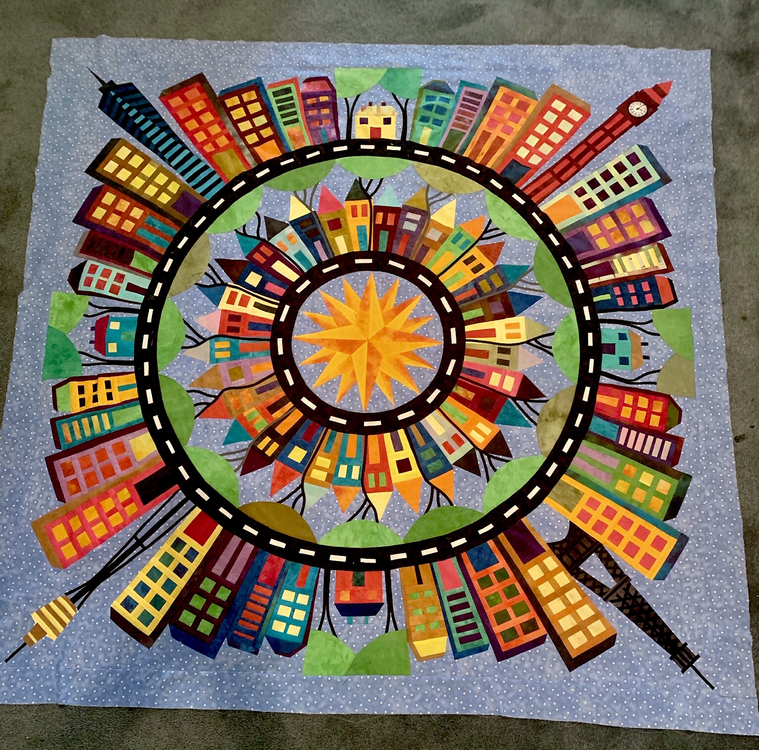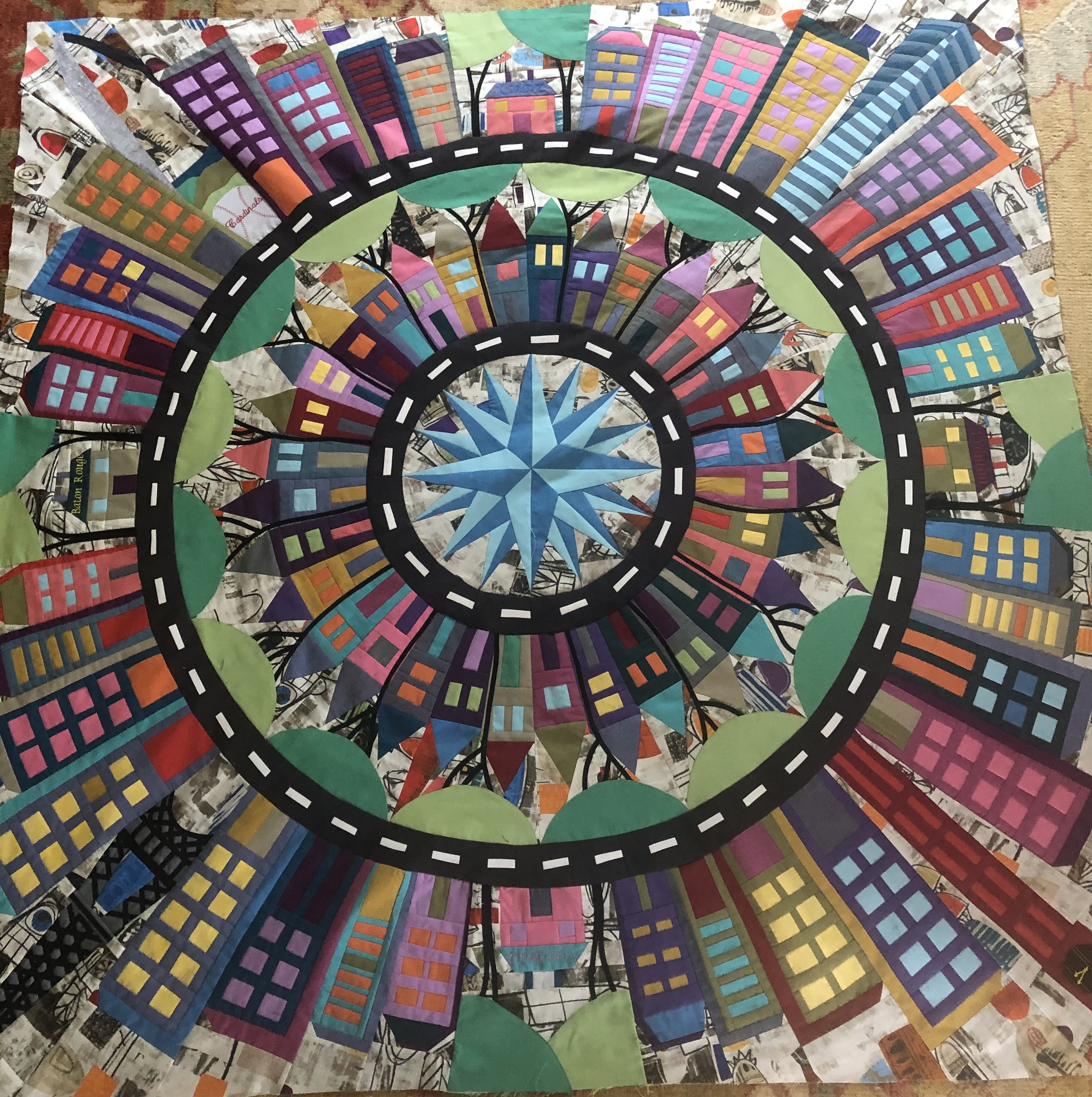 I have finished my quilt top. I love it. I used mostly Ricky Tims’ hand-dyes in this quilt. Of course not for the background, nor the roads. I used scraps that I had on hand but occasionally had to break into my precious “Ricky stash”. I am going to take my time deciding how I want to quilt it and probably won’t start the quilting until the new year. Thank you Barbara for all you have done to lead us thru the making of this quilt. I have been a star member since the beginning and this is the first “The Quilt Show” BOM that I have made. This one immediately spoke to me. I didn’t think I could do it when I first saw the quilt but because of Barbara’s encouragement I gave it a try. What a great journey it has been. I have really enjoyed the process and seeing the progress month to month. The photo doesn’t do it justice but it is the best I could do.