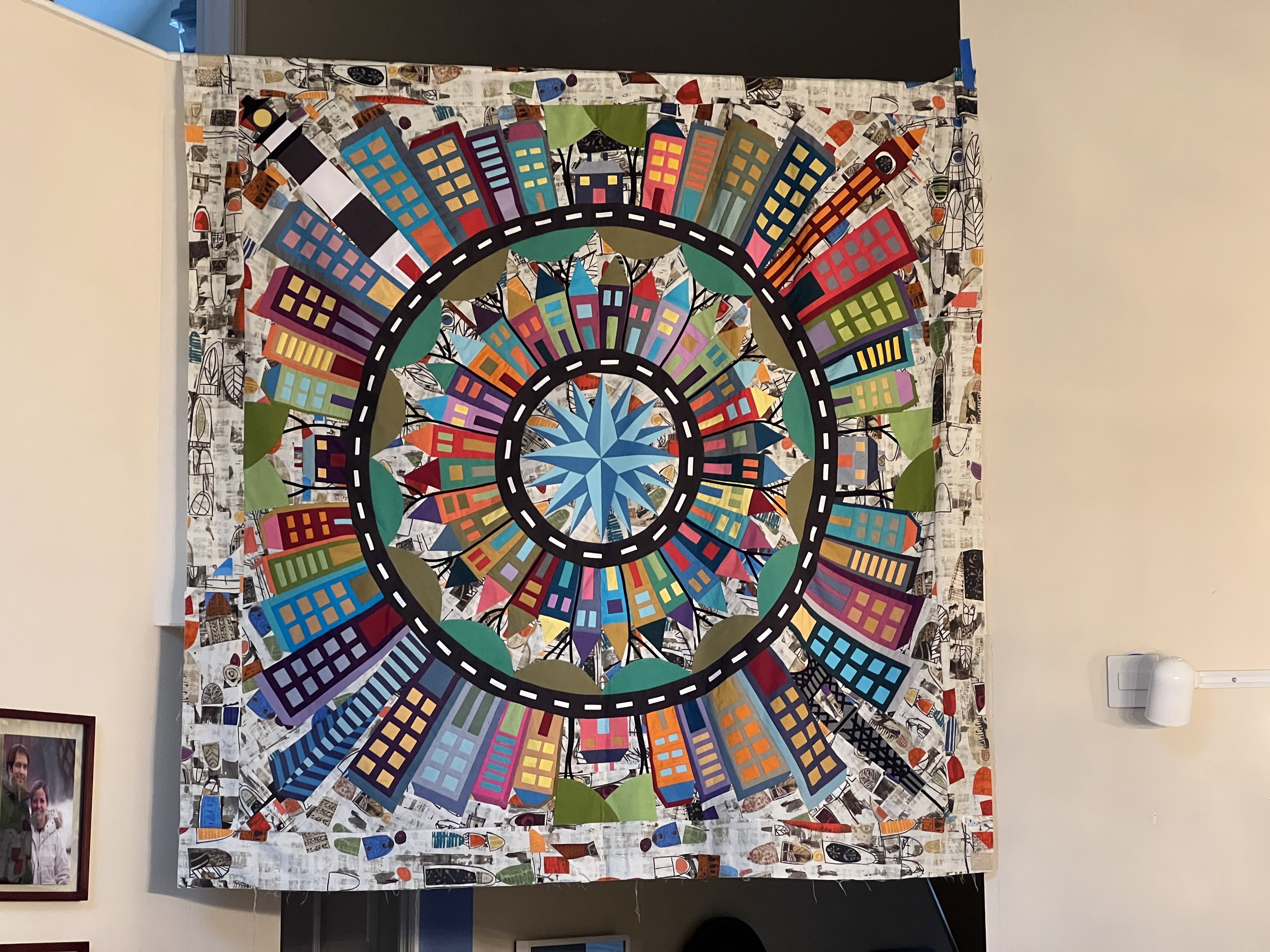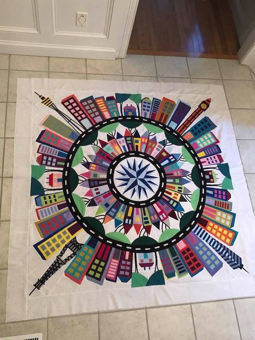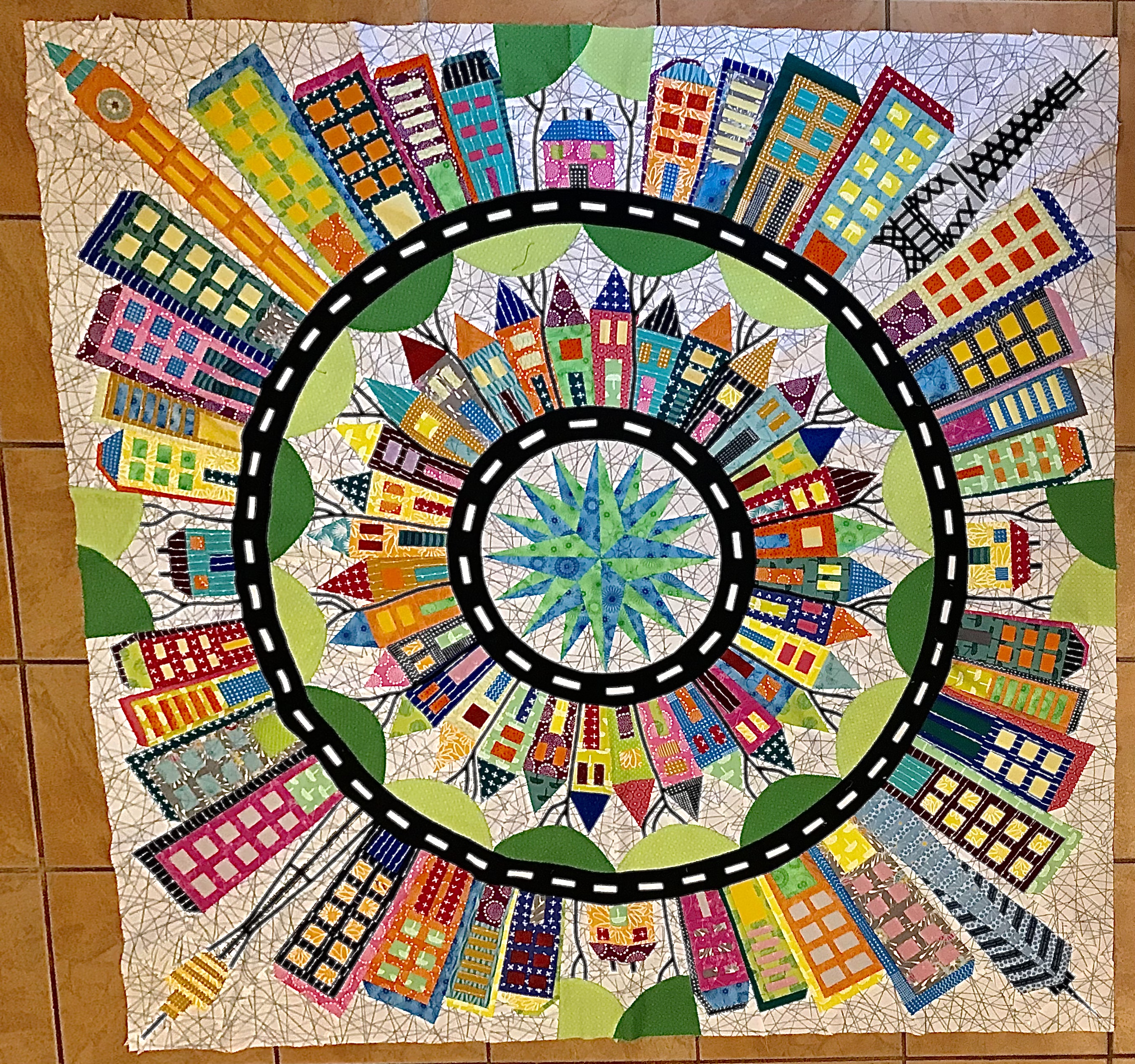 Carole, you deserve all the recognition for your beautiful work. You took a great design and adapted it in a way few of us could or would. I encourage you to enter the finished quilt in a variety of judged shows so many more will see it.Originally posted by nhbaskets View PostPushing the topic a tad with this post. I finished my outer circle of buildings, houses in the city and skyscrapers over the weekend. Today I started attaching these to my wholecloth linen background and adding the finishing embellishing. First up was city hall in the town I was born and have lived in my entire life. Clock face shows time I was born. Only 31 more to attach! Thank you all for the encouragement you have provided over the past 10 1/2 month! I have learned so much and have made so many amazing quilting friends. You are all the best!