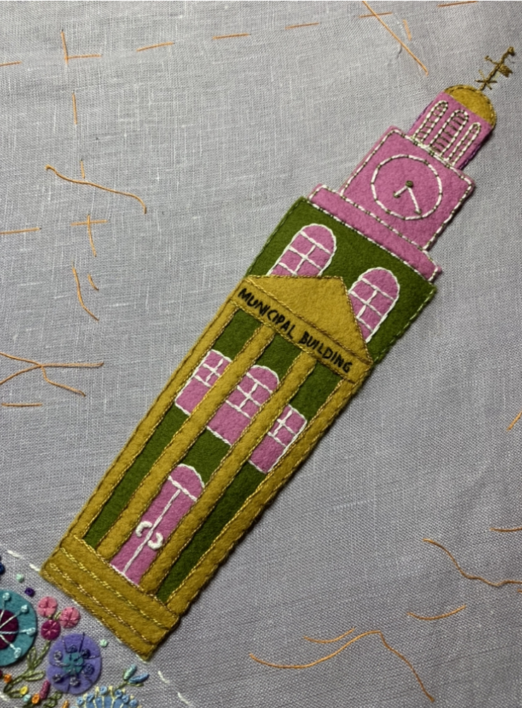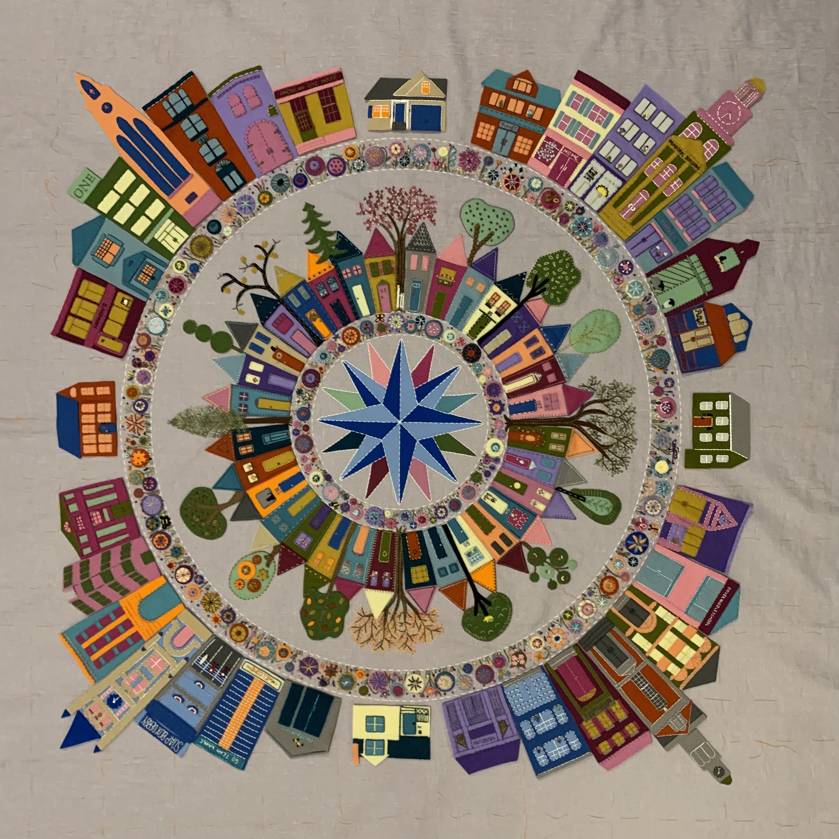 Pushing the topic a tad with this post. I finished my outer circle of buildings, houses in the city and skyscrapers over the weekend. Today I started attaching these to my wholecloth linen background and adding the finishing embellishing. First up was city hall in the town I was born and have lived in my entire life. Clock face shows time I was born. Only 31 more to attach! Thank you all for the encouragement you have provided over the past 10 1/2 month! I have learned so much and have made so many amazing quilting friends. You are all the best!