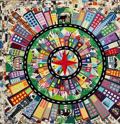 I am most proud of my N, S, E, and West compass point homes, which are paper pieced homes we actually lived in. I taught myself Electric Quilt to create the designs. I am also proud of the World Trade Center which I was able to piece together using very few pieces of fabric. It took some work to get the striped fabric lined up and at the right angle, but it worked. I also added machine embroidery in the right lower quadrant to represent other locations that were meaningful to my family.
