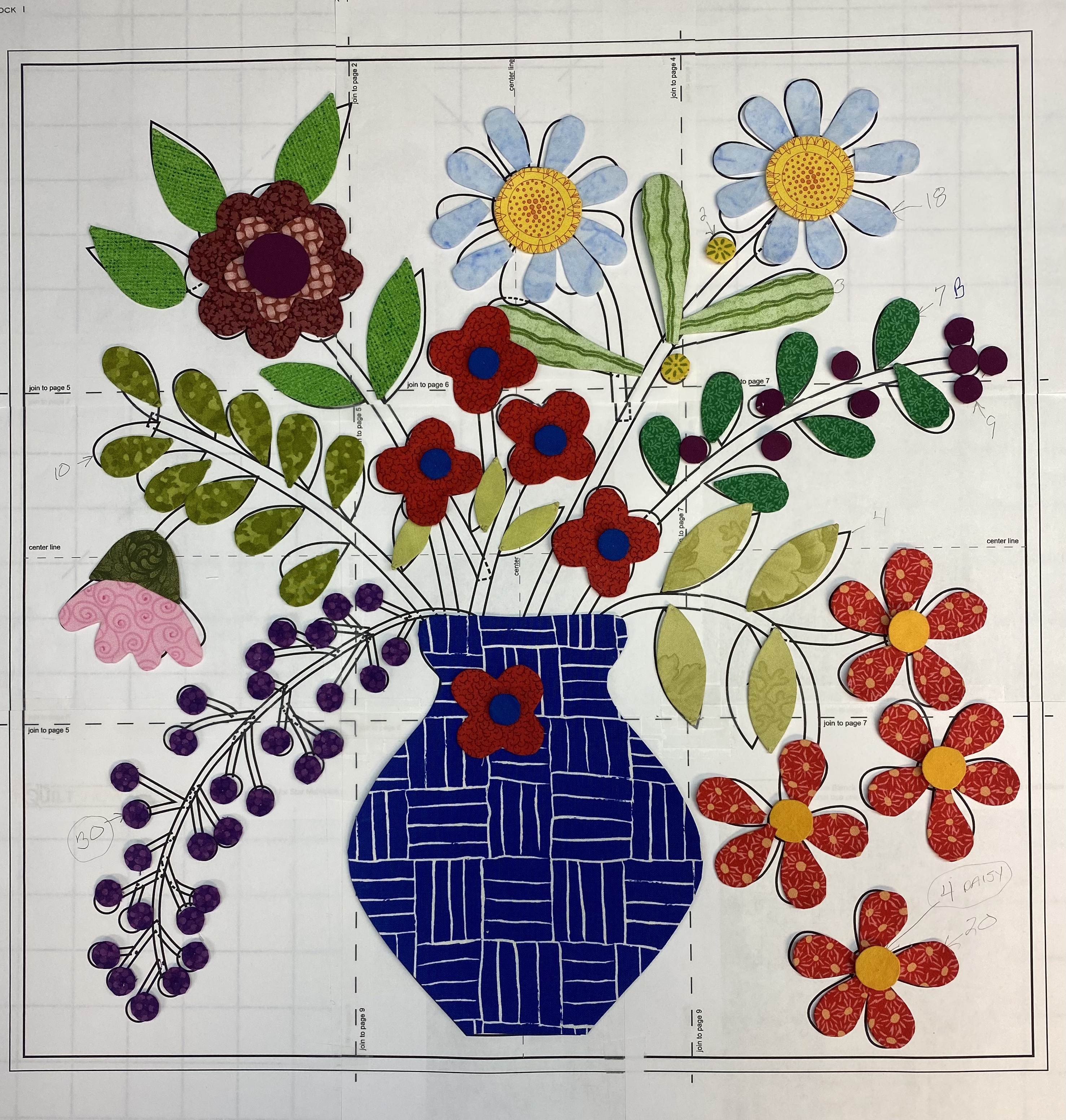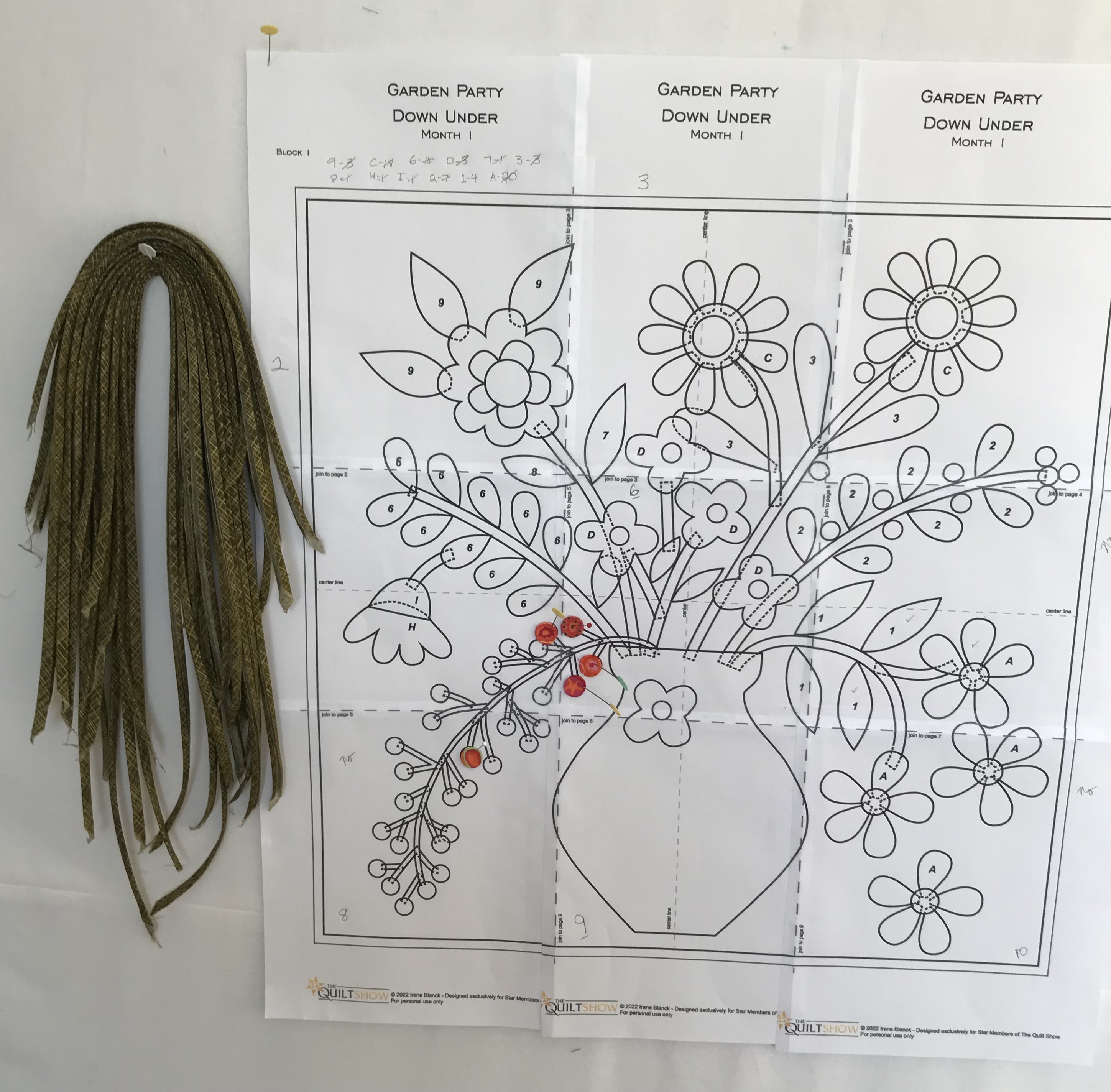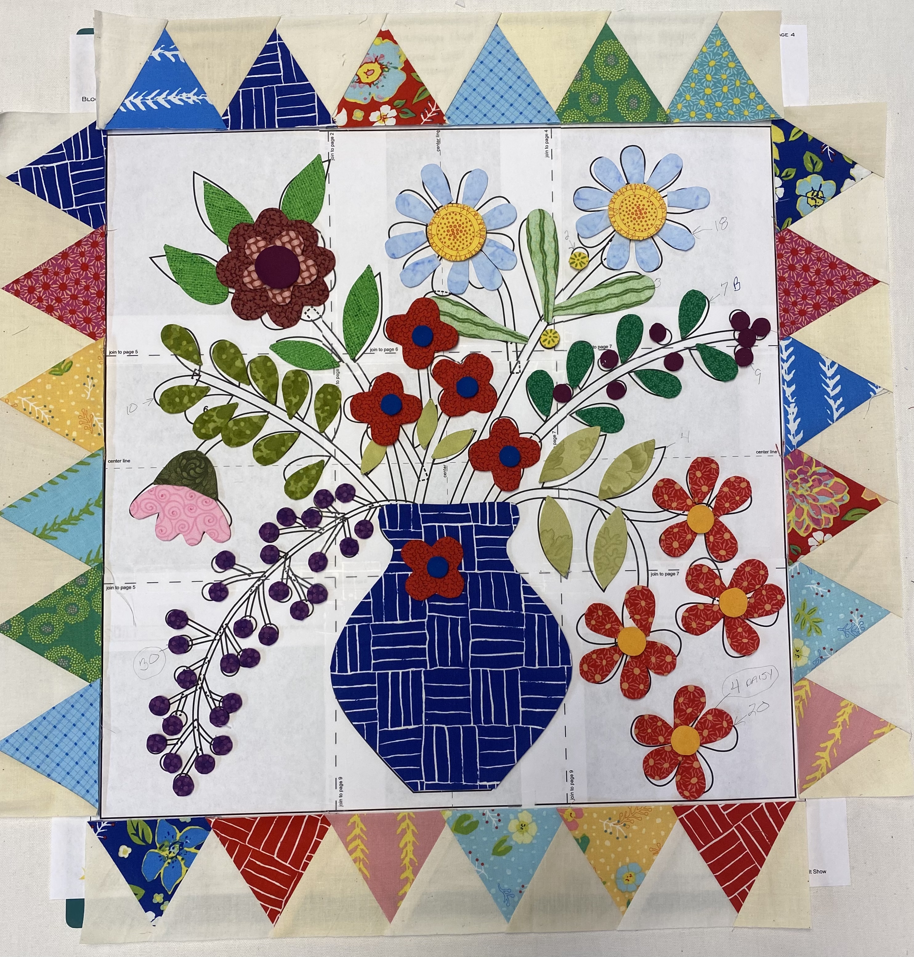 [QUOTE=Margo;n890609]Pretty much following the pattern, but mine will be super scrappy from my stash. Except for the stems, all of the appliqué is prepped with turned edges for machine appliqué. [/QUOTE]