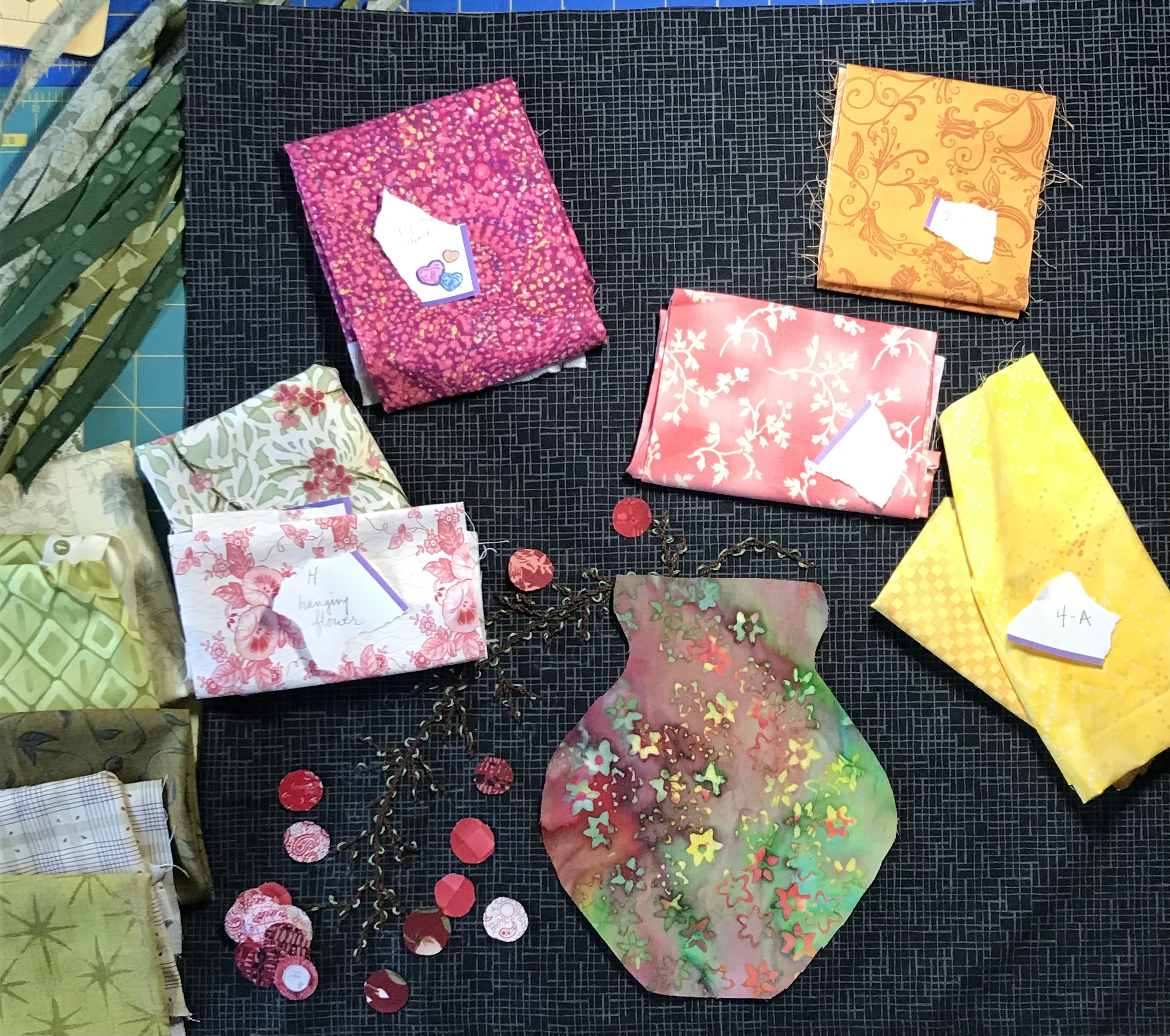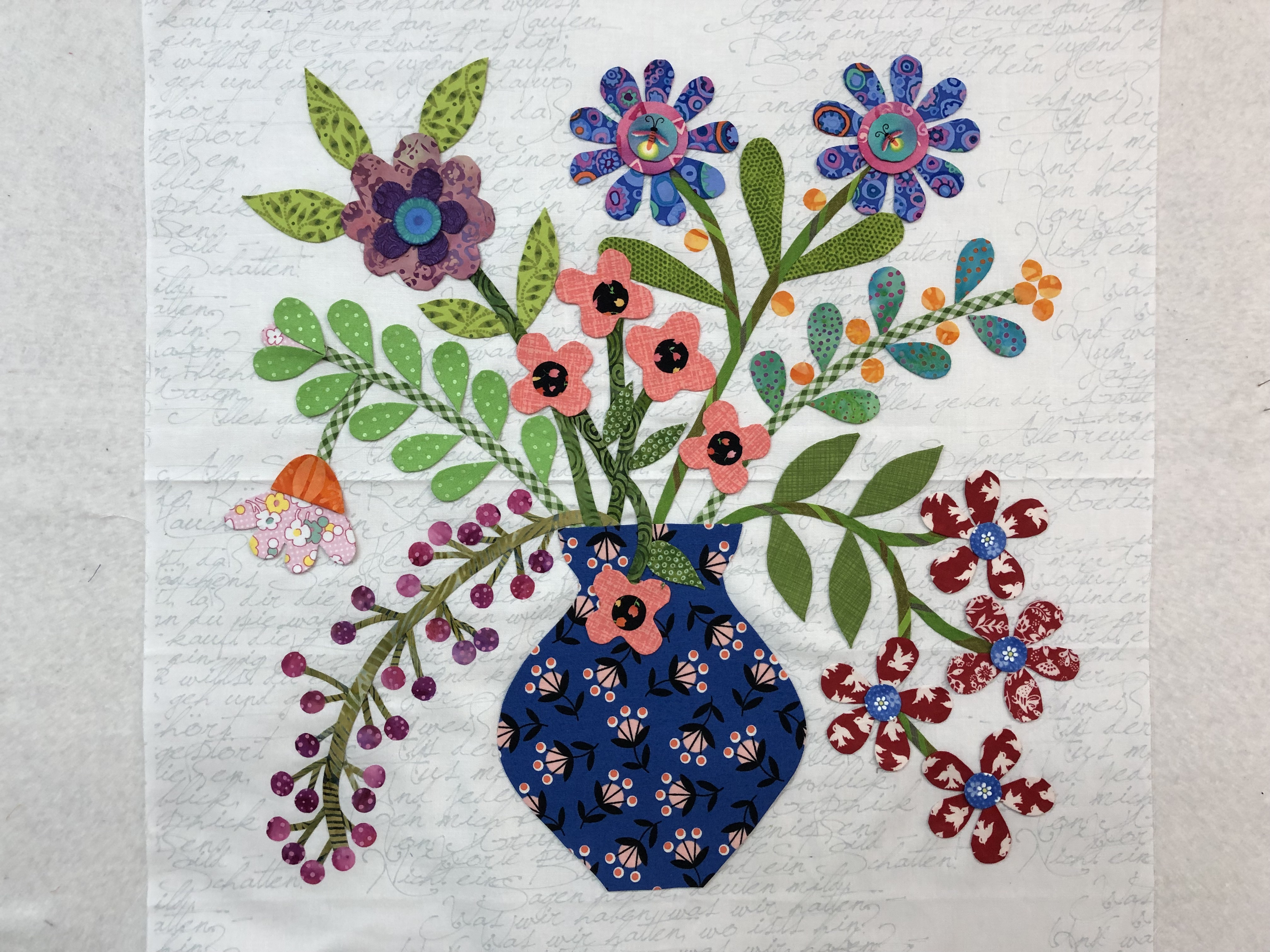 Well, my plan is ready… fabrics chosen for block 1 and some pieces pressed onto freezer paper. I embroidered they berry vine. I love the batik fabric for the vase! For appliqué, I am using the freezer paper/starch technique. For my Rosa’s tools, I use a fondue fork and a flat head screwdriver!