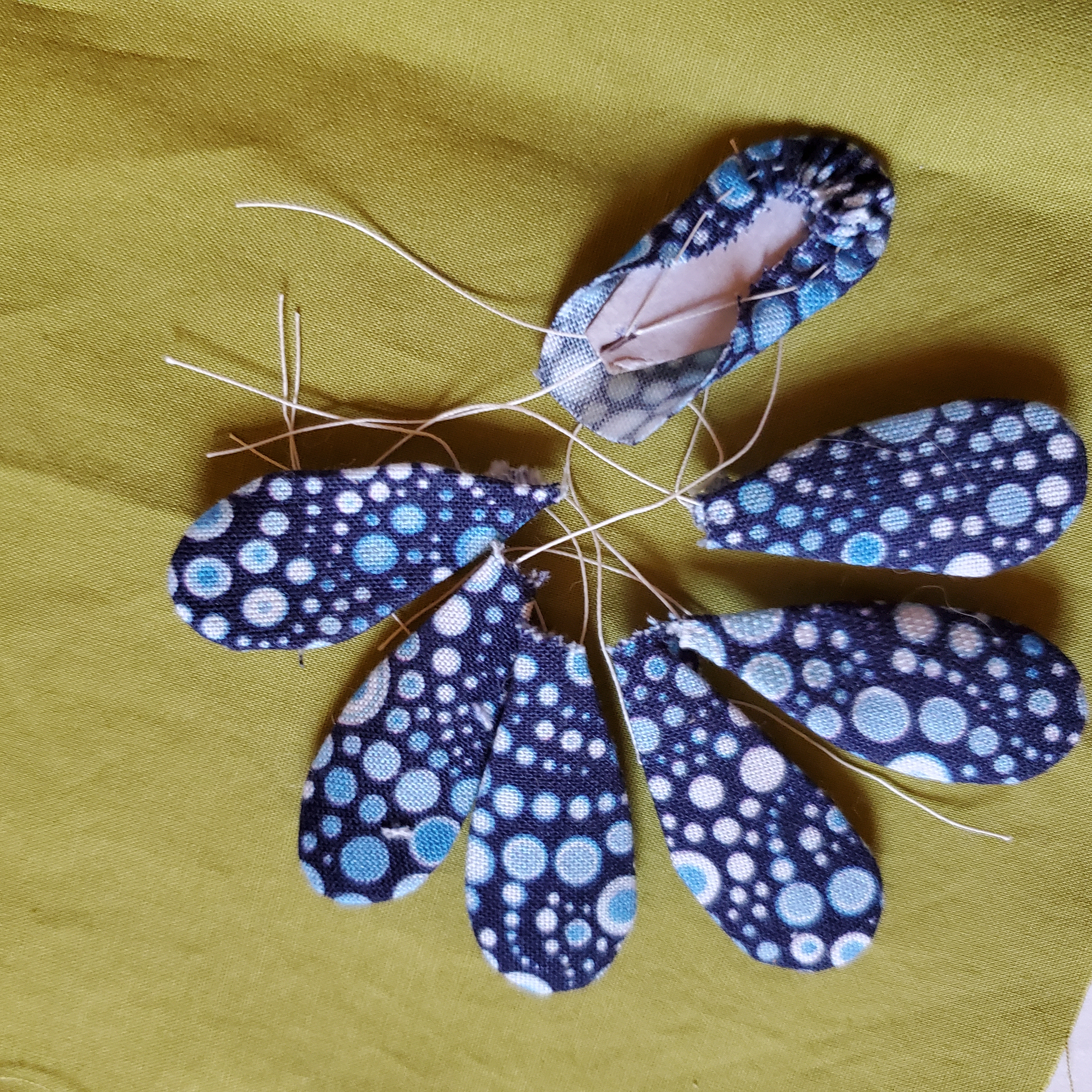 Completely forgot about doing the string draw up technique on petals! I used it on the circles. Thanks for the reminder. I use 3 layers of freezer paper so that might work for Paula S - or add more layers to make really stiff?? I tried making flowers all as one piece but didn't like the look so went back to individual petals. I like the results. Photos soon - sewing down the 30!! grapes first so I don't lose them.