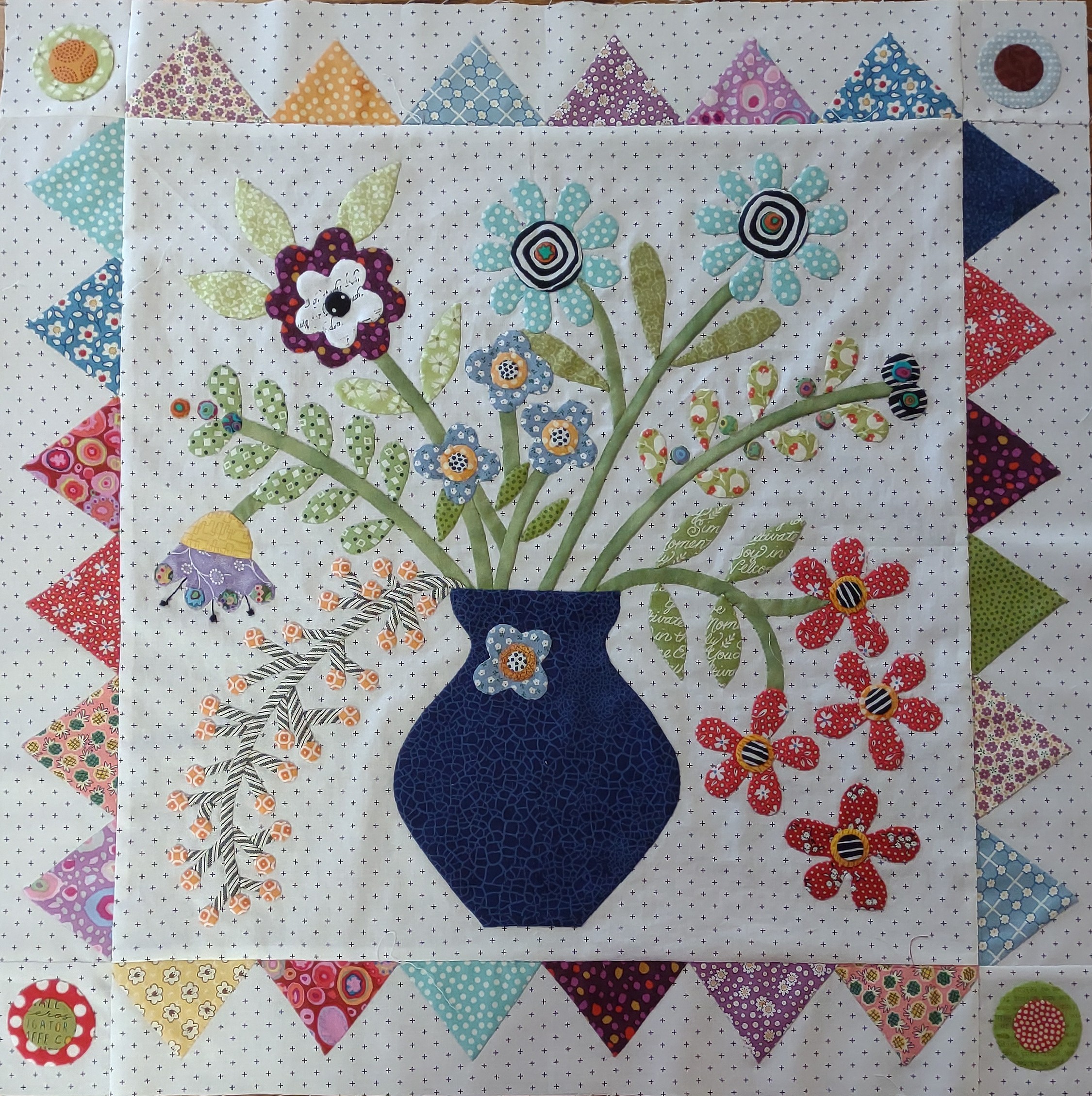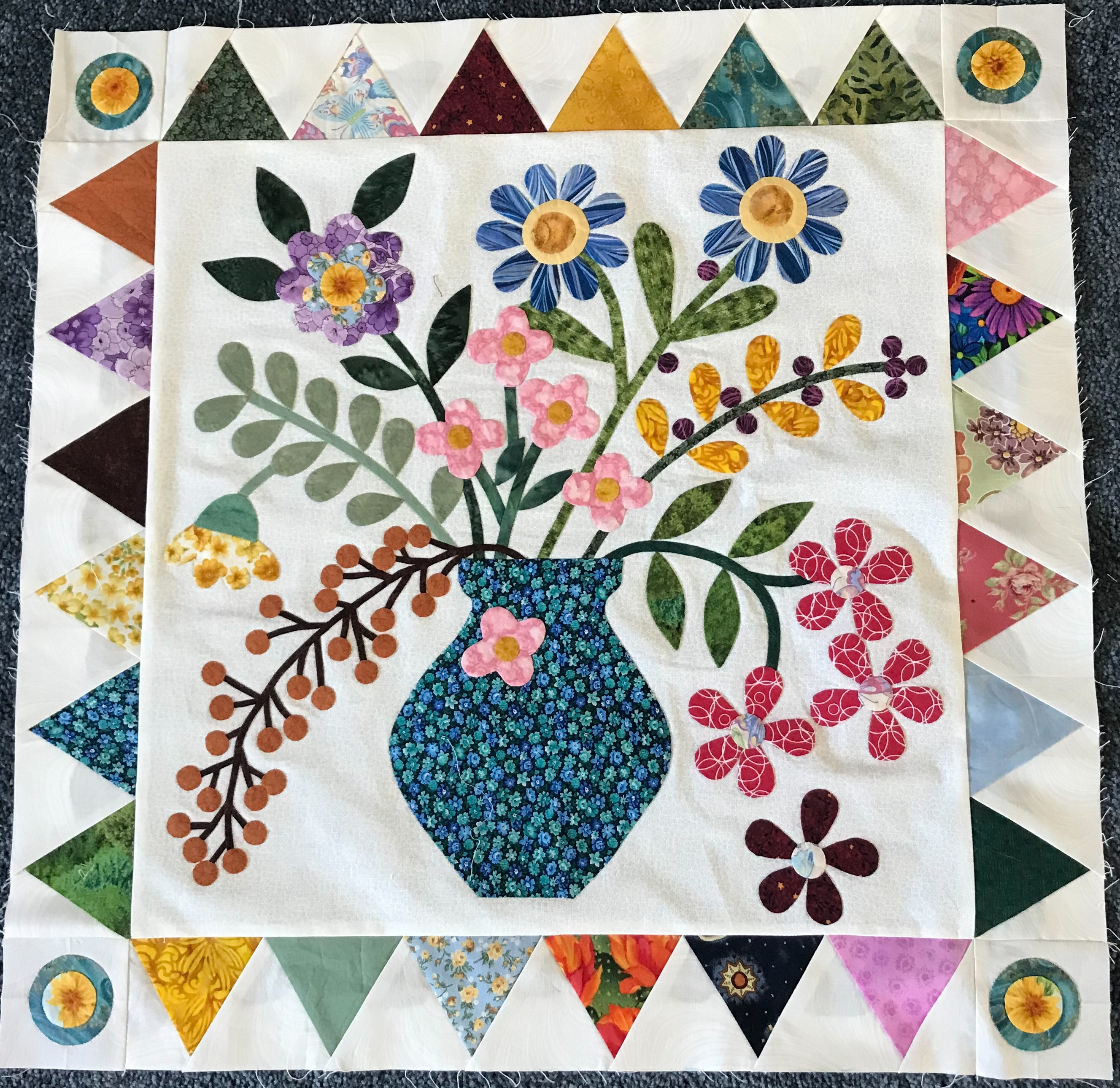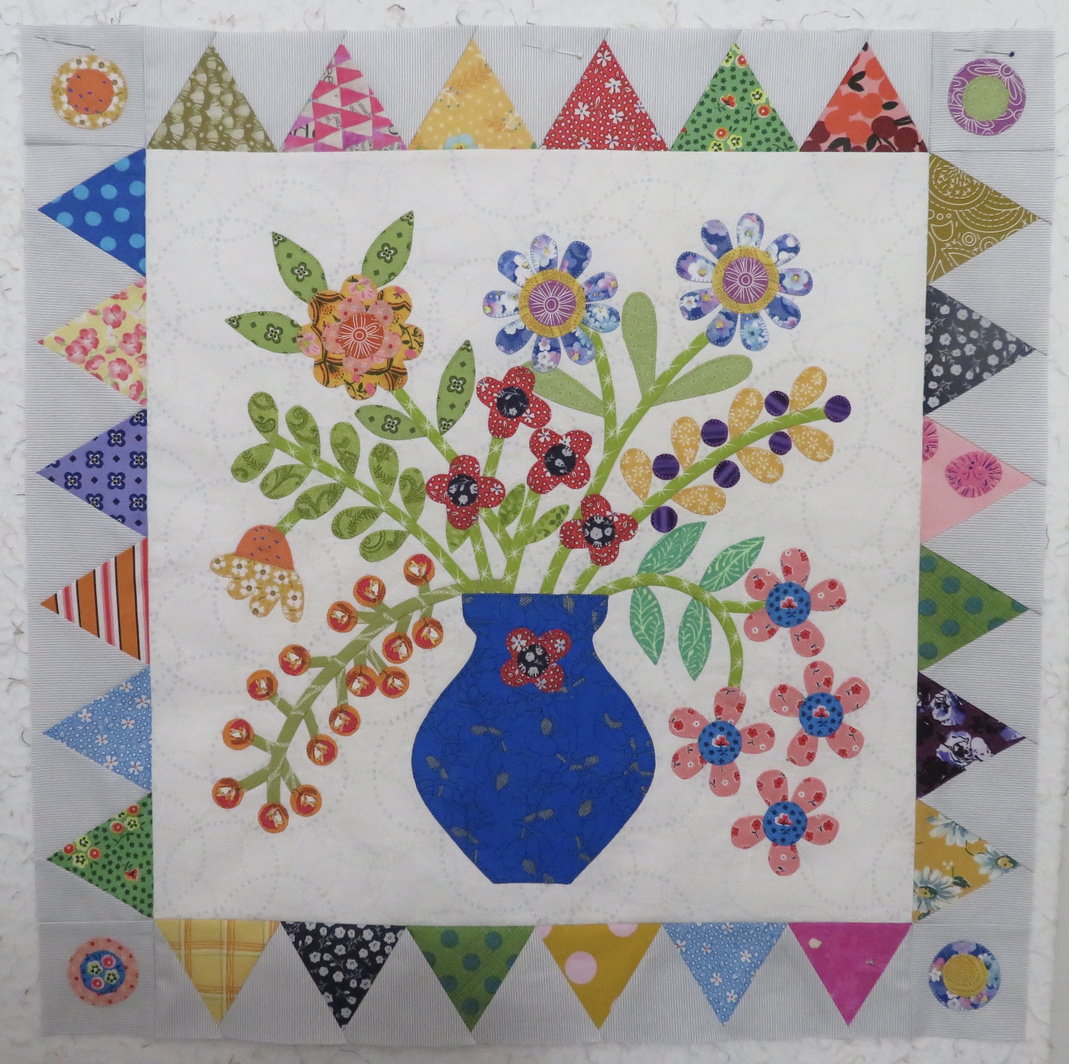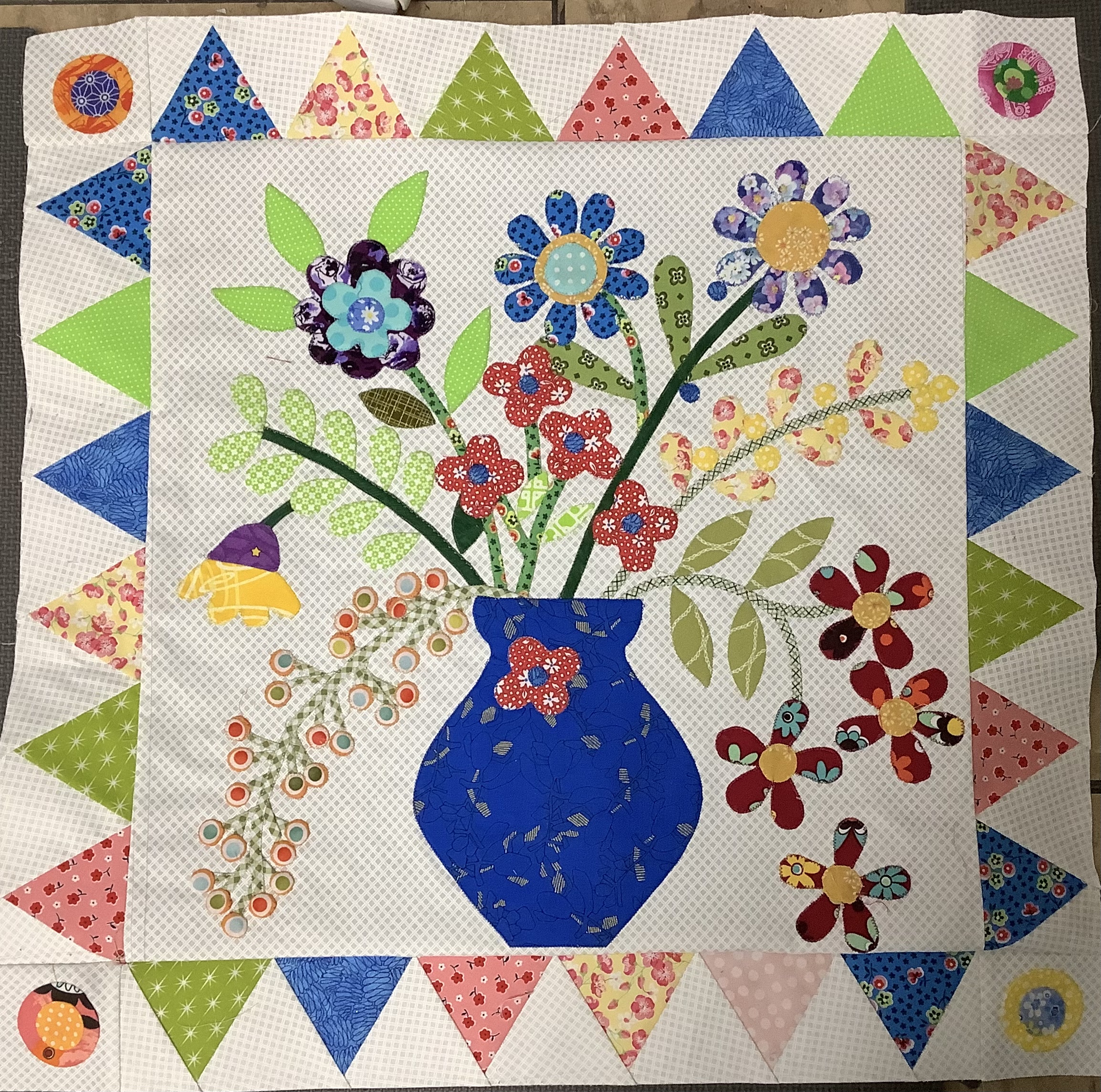 of foundation paper piecing.I did machine stitching with thread matching the fabric using a 1.0 by 1.0 zig zag stitch. I decided to go with a country garden party theme, rather than vases. So I will be having critters,