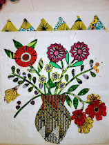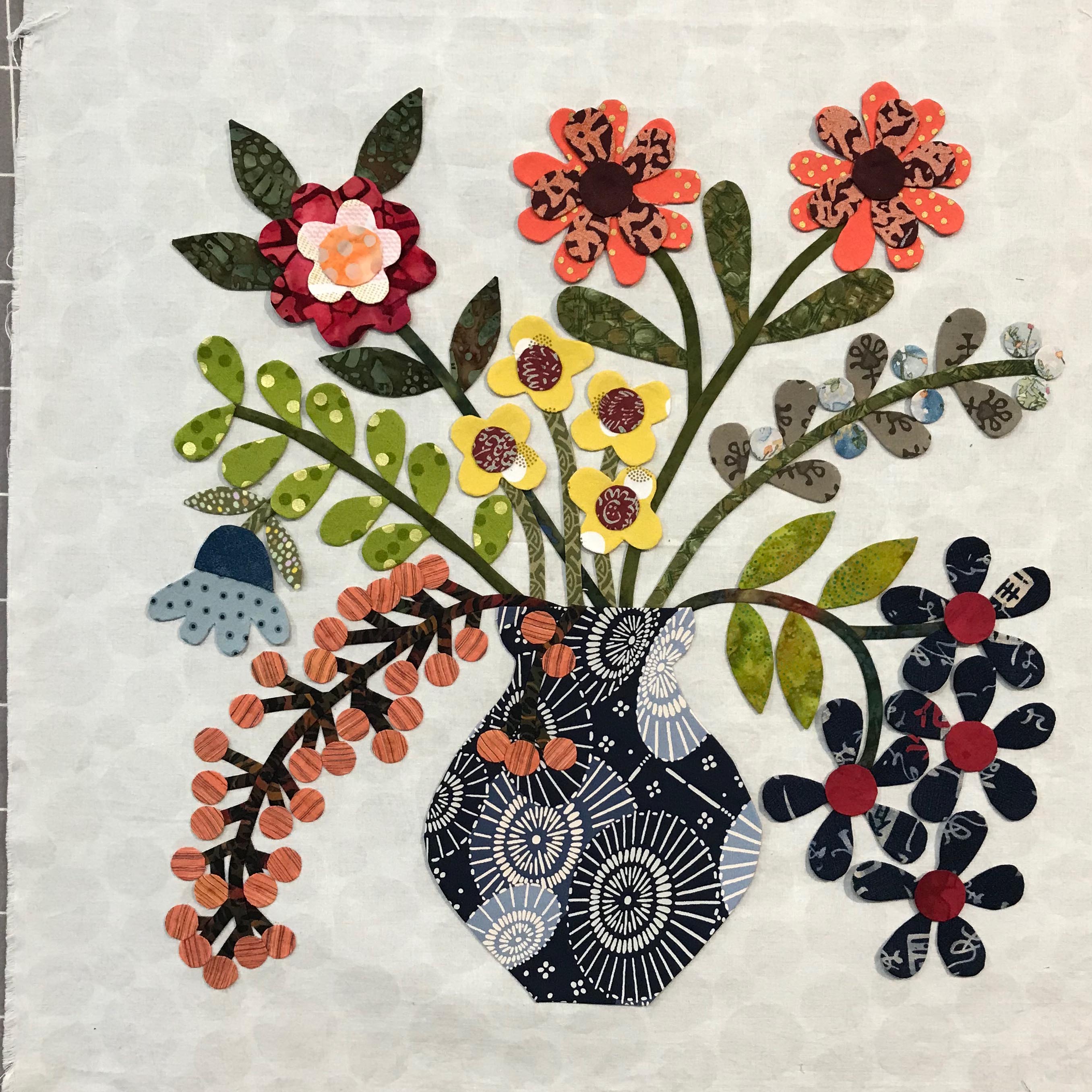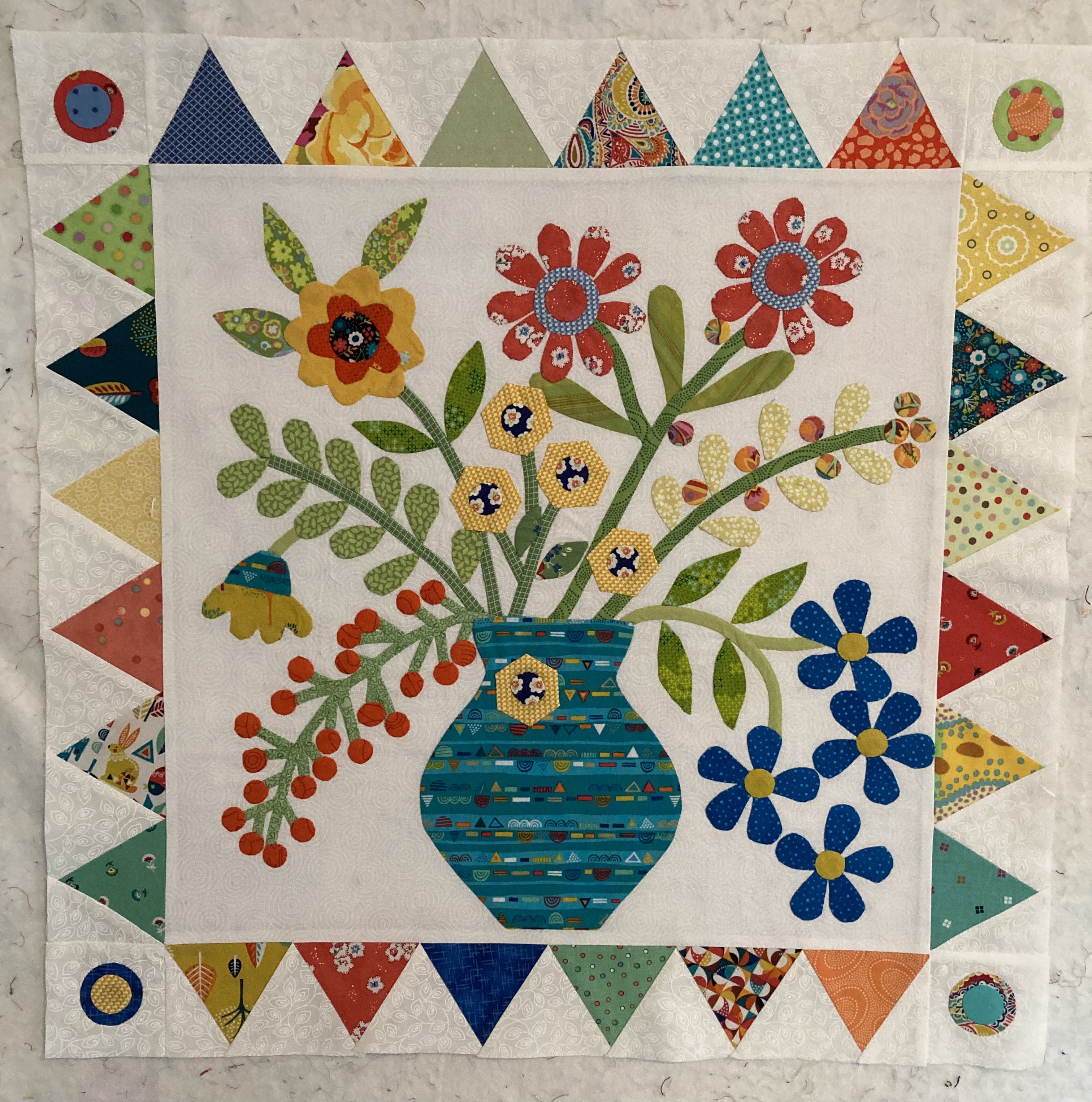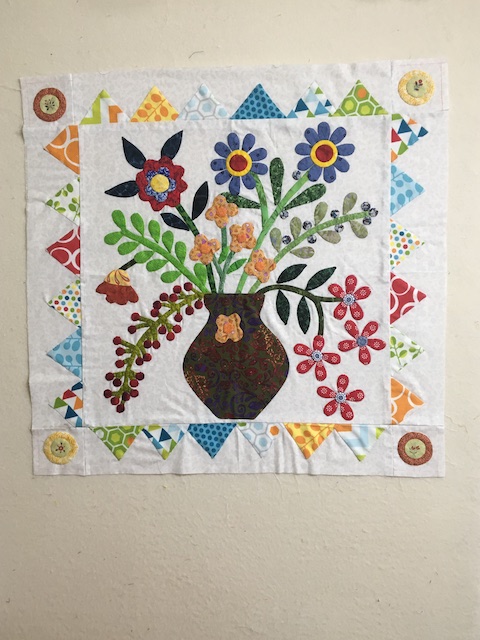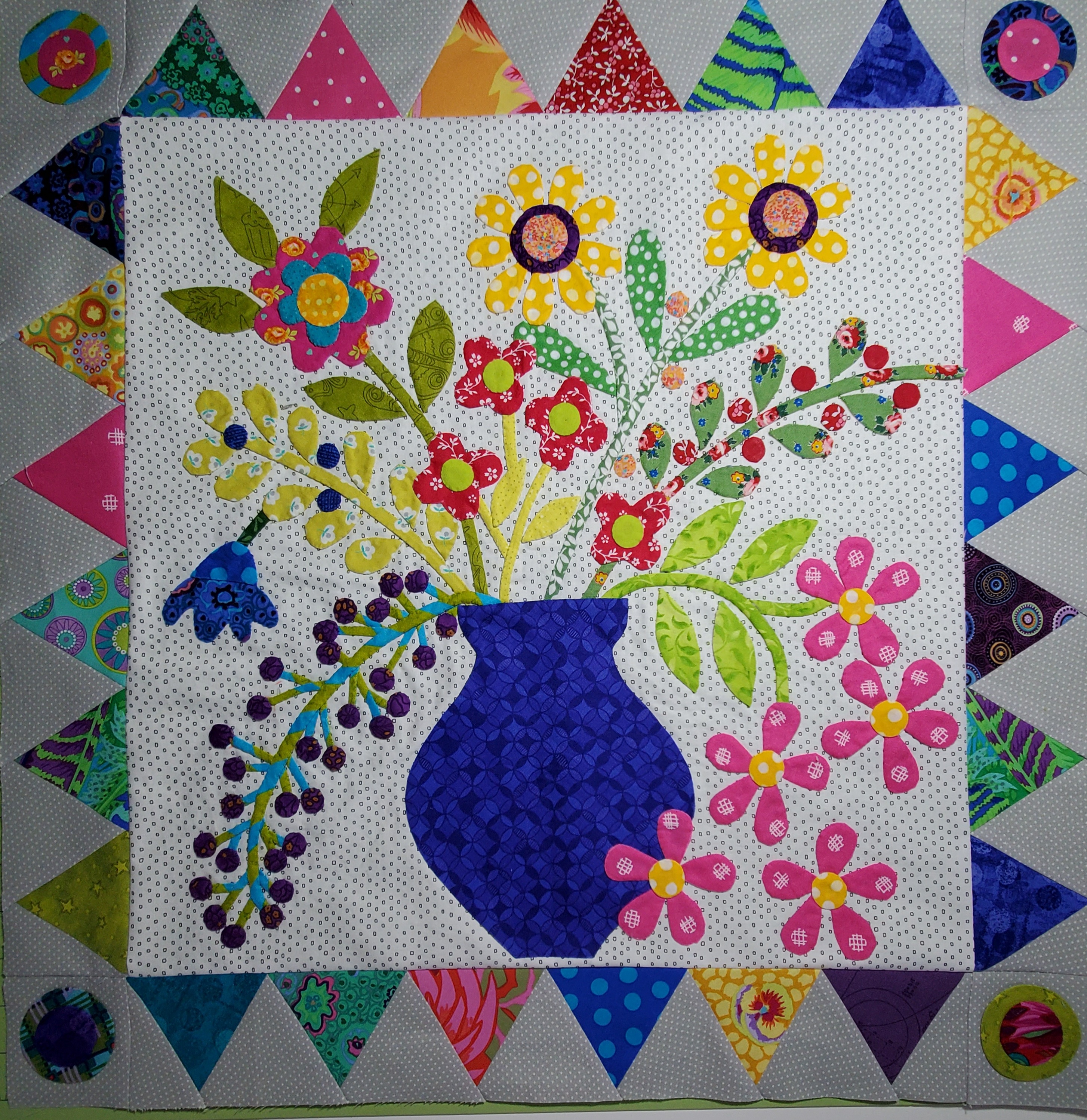 of foundation paper piecing.I did machine stitching with thread matching the fabric using a 1.0 by 1.0 zig zag stitch. I decided to go with a country garden party theme, rather than vases. So I will be having critters,