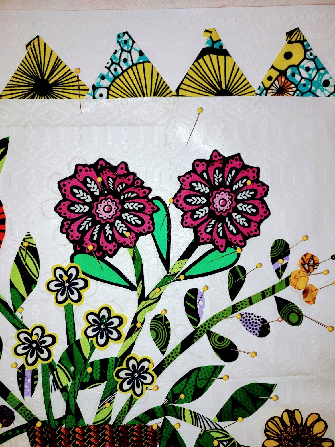 Updated - I will make my fence as if it is the rays of the sun as we live in sub-Sahara Niger where we don't have many lush gardens but we have lots of sun. This is my first time doing needle turn so some of this will be done with that technique and some raw edged applique. Hope to attach the flowers and stems this week. I do not have access to all the supplies here so using what I have to make the stems and apply the leaves and flowers.