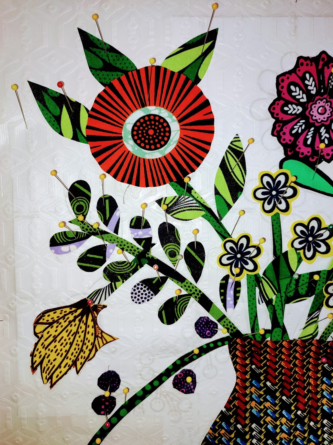 I was easily overwhelmed too because I'm working from my stash. But I progressed in this order focusing on one section at a time: stems (one fabric), vase, flowers and leaves at upper right, lower right flowers and leaves, berries, center flowers, left hanging fushia and the big flower upper left last. Everything is turned under using apliquik method and now I'm machine stitching everything down. I'm waiting to pick out border fabrics after the center is done. This is the first applique project I have done in 15 years! Yikes. I won't post a photo until the very end.