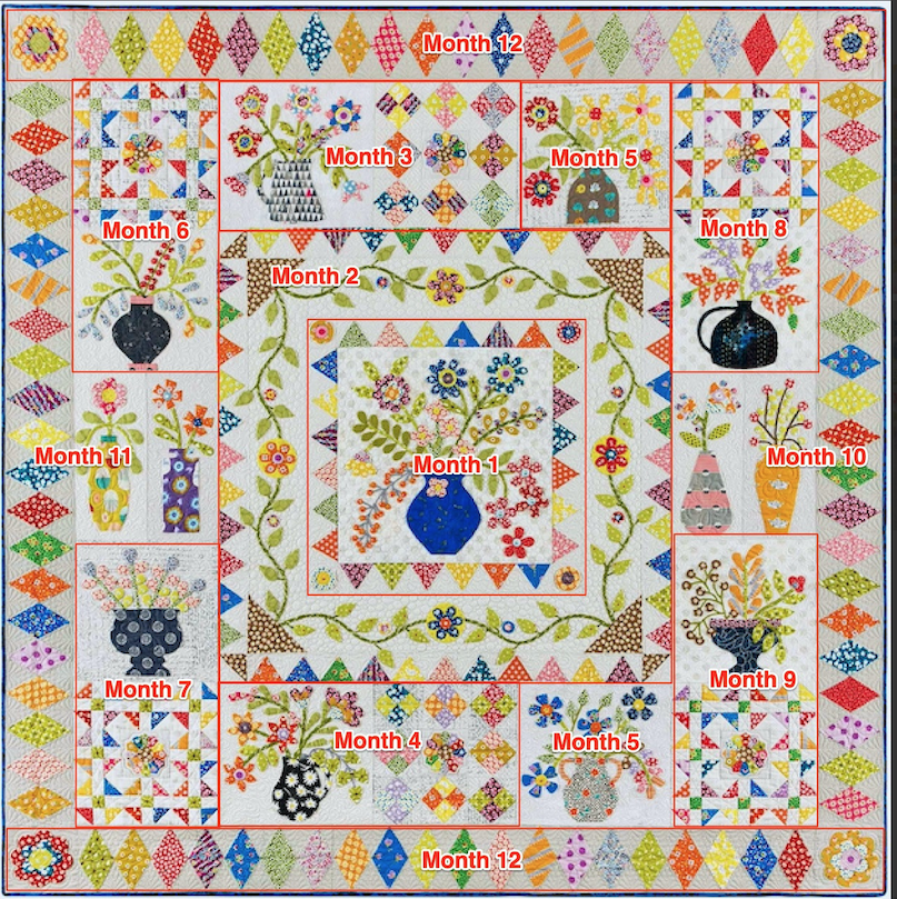 Also loving the "Year at a Glance" photos- this is helping me do some balancing of fabrics and colors as I look ahead to future months now that I know what squares will be next to other parts. The TQS team is so responsive to requests and suggestions but I think we need to remember to figure some things out for ourselves - like counting how many leaves and circles to make. I colored in the full-sized pattern and counted each section as I did. Not hard, and gave me time to "get to know the pattern" as Barbara suggested.