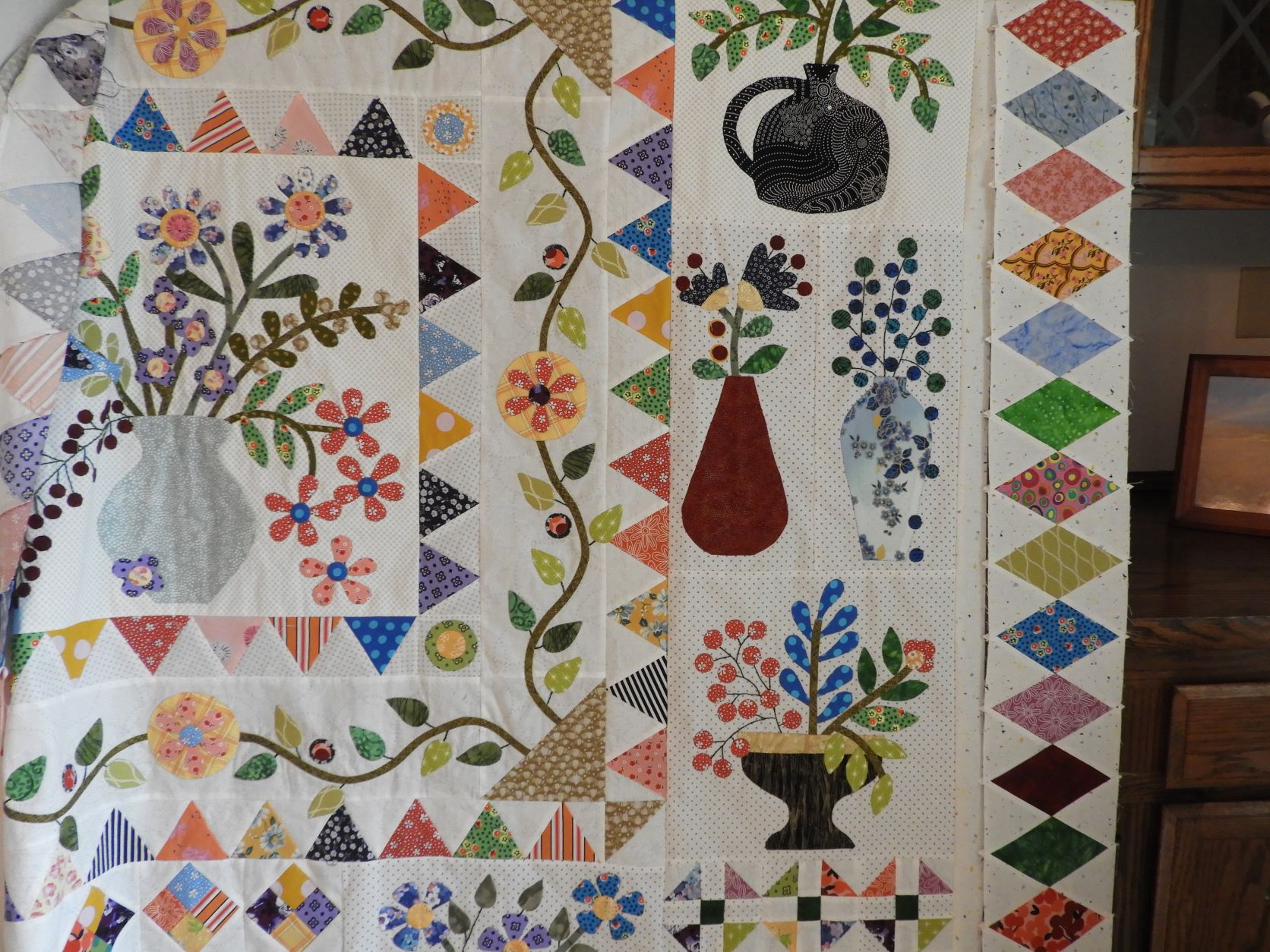 ICenter with top and bottom blocks and left side blocks are sewn together. They have fit together perfectly. I paper pieced the border diamonds using the printed triangle strips from the pattern. Have already chosen flower, leaf and vase fabric for November blocks. I can hardly wait to get the printouts. This has been fun.