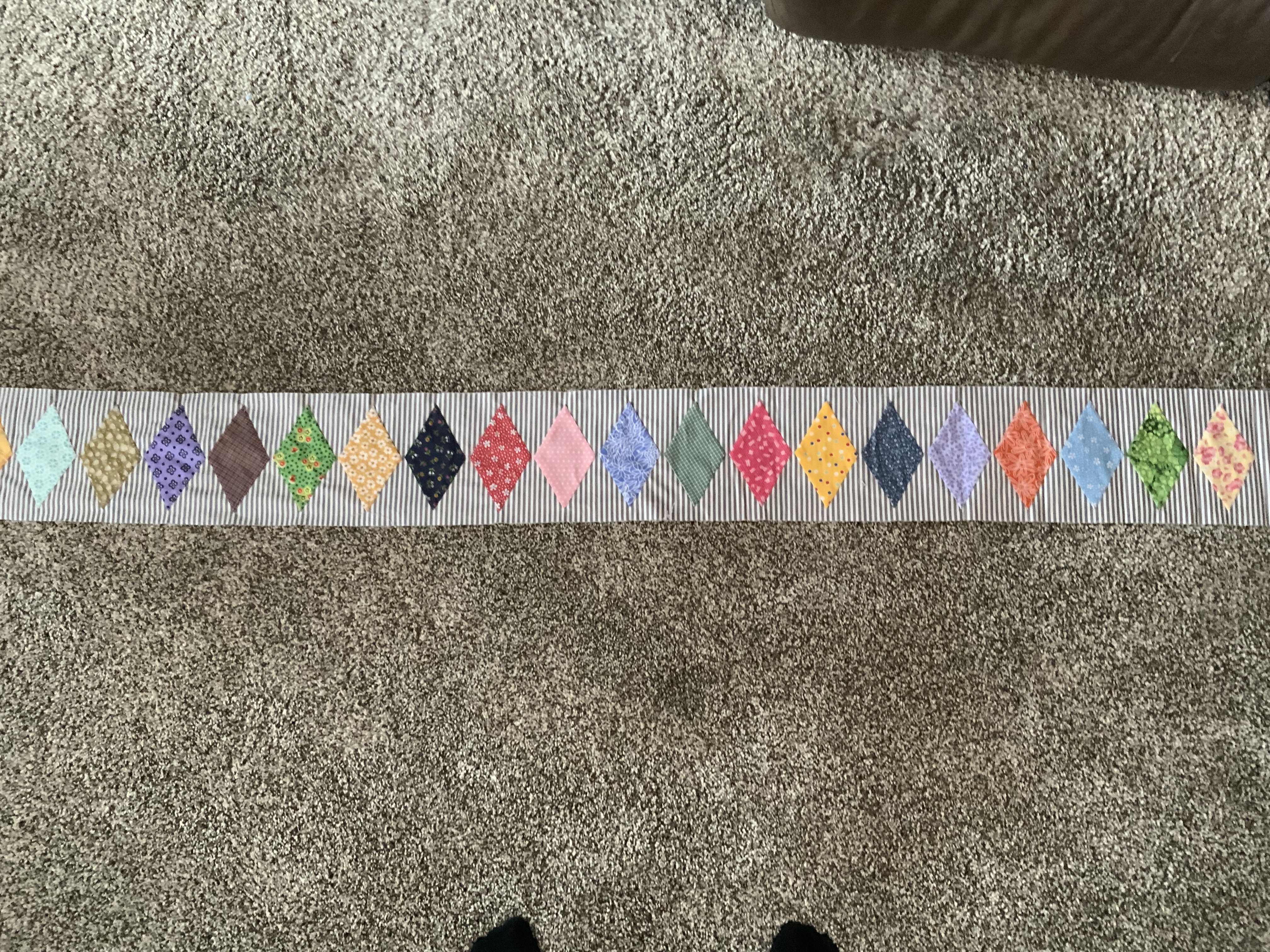 [QUOTE=LizAnderson;n894217]Getting prepared for the borders. I decided to change the direction of the stripe. Cannot see the seam at all! I wish now I had used “fuse and press for the diamonds and I wouldn’t have to remove the backing. [/QUOTE]