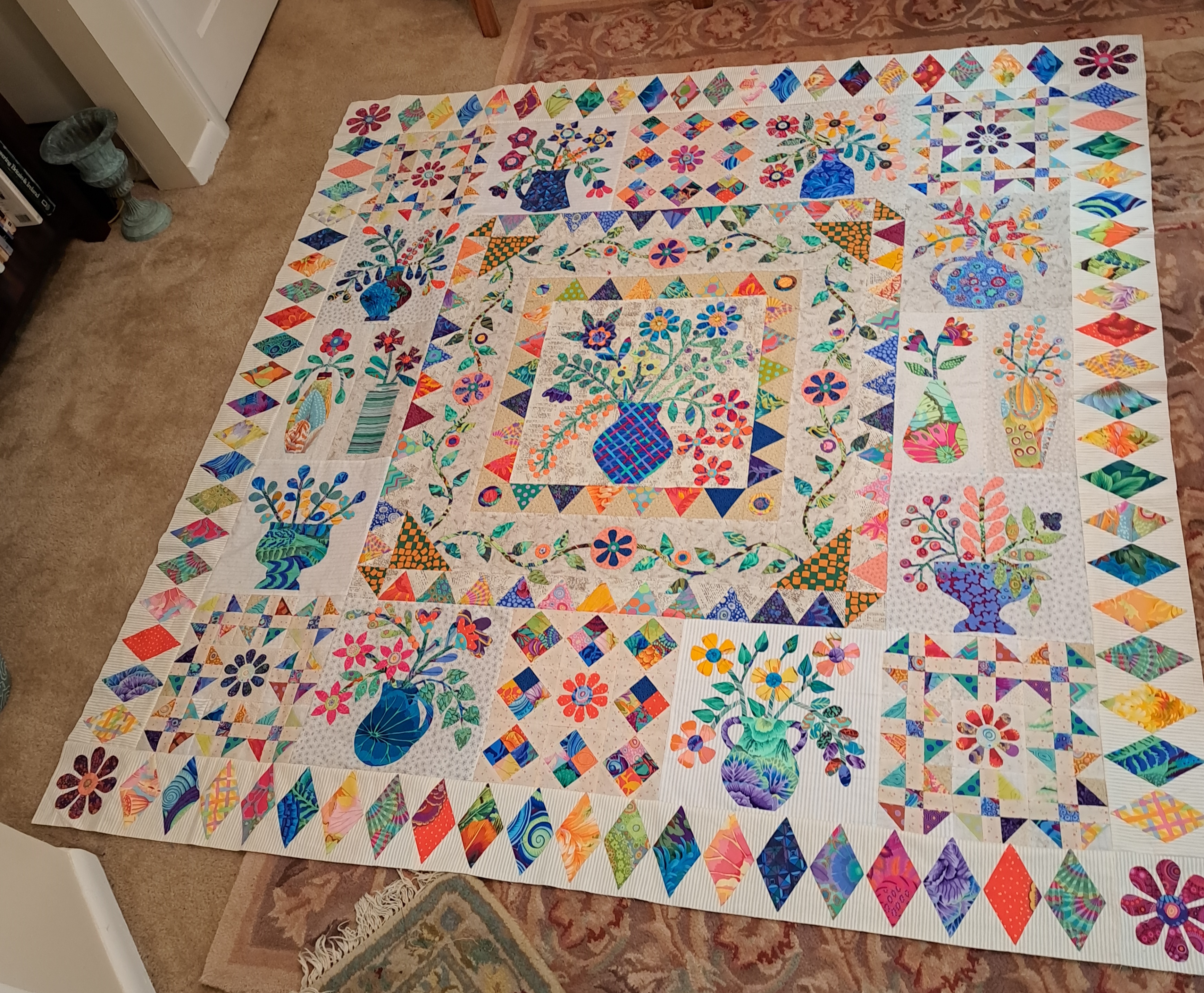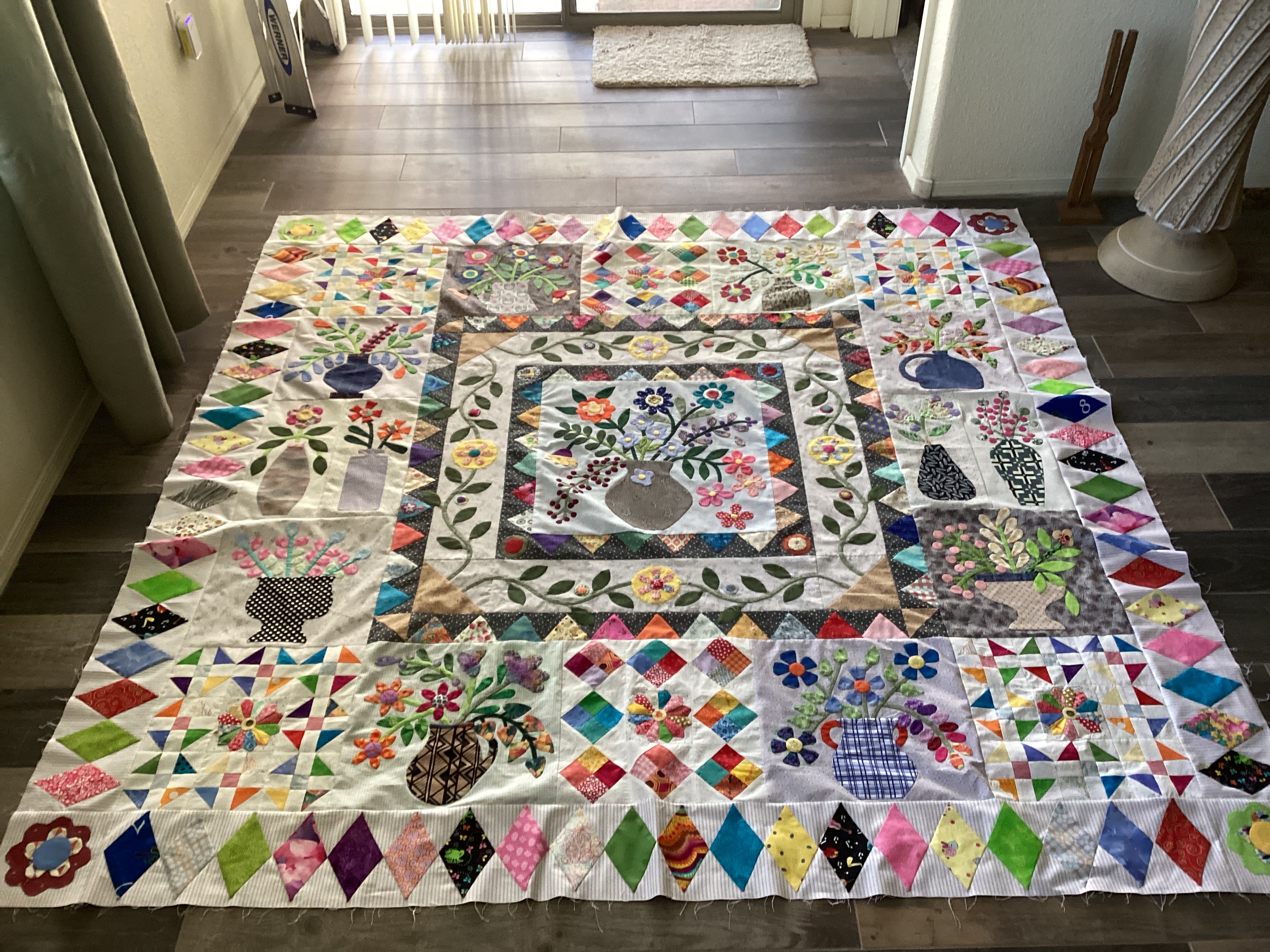 Completed to top this weekend. All fit together without issue. Thanks for all the help with this BOM. When I look at the top the majority is needle turned appliqué. I think I have mastered the tips of the diamonds. Looks like next BOM is circles! Today piecing some fabric for backing, Nice to take a bit of a break, but we all have some of those UFO’s or start a Christmas project.