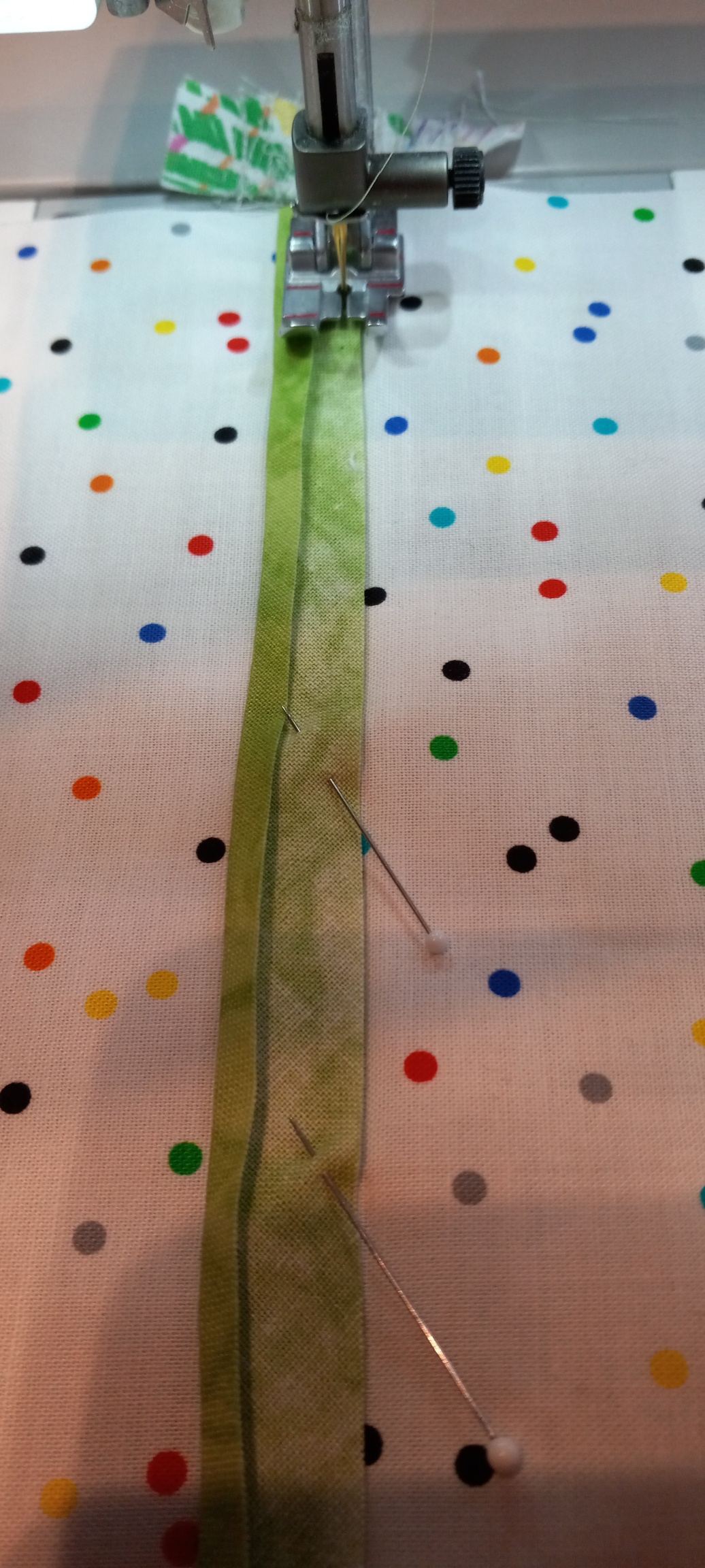 I machined appliqued my month 1 stems. I folded 1 side over. Then stitched the raw edge down on my fabric. Then I folded it and machine stitched the folded edge, using a spool of 100 wt thread I had on hand . I have not done much applique, but I could swear Alex mentioned during 1 of her Live projectsCarol in SW Michigan