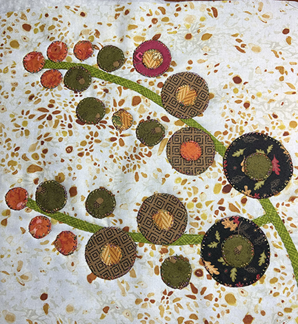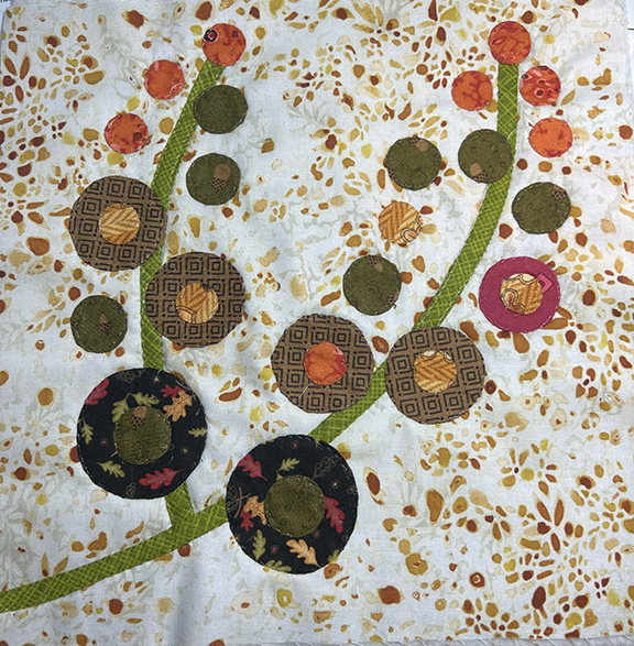 I machine appliqued my stems, using 100 wt thread I have in my stash. These 2 circles are also machine applique. I'm not sure if I'll continue that or attempt hand applique.