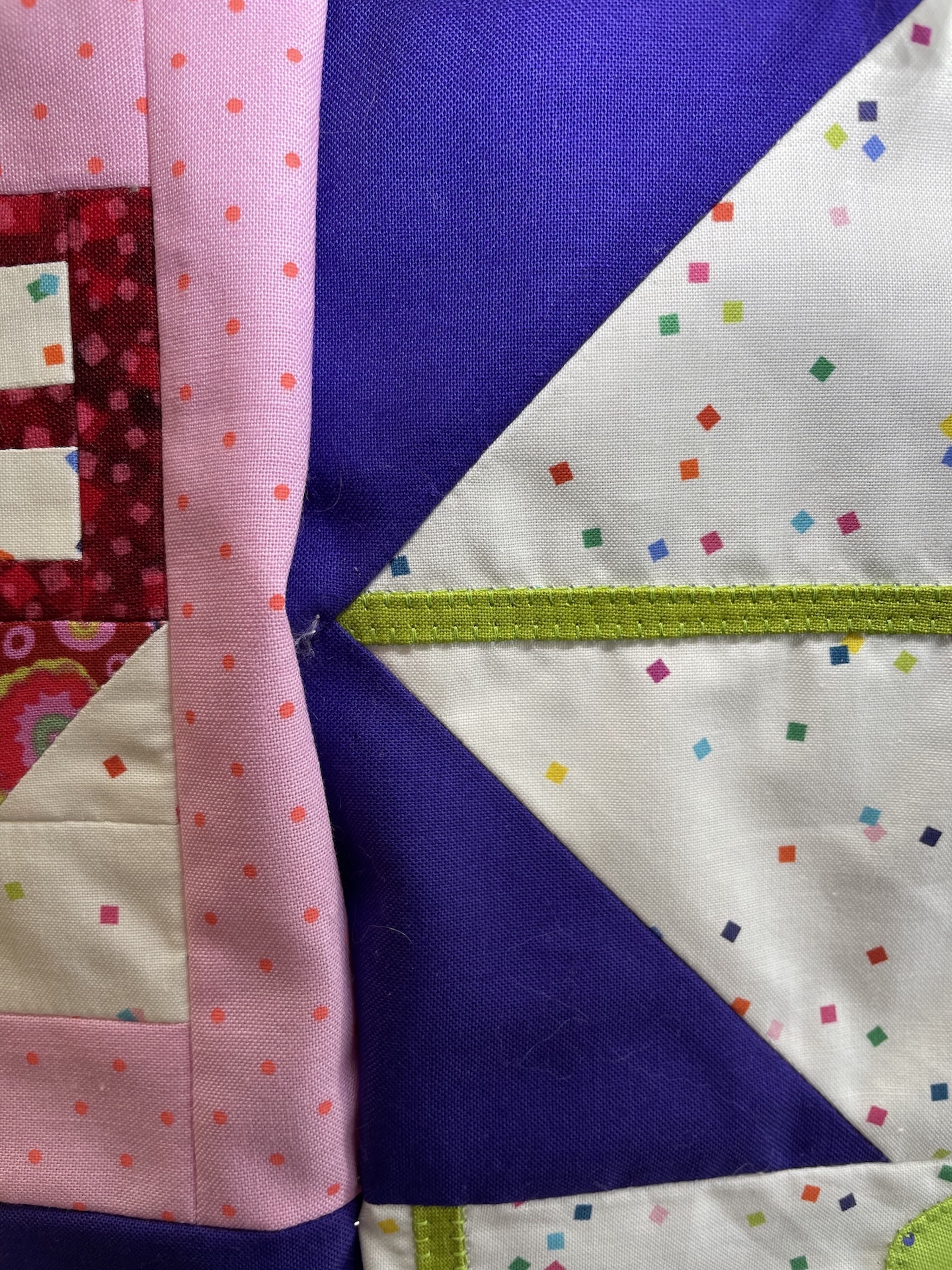I know the seam needs to be adjusted from 1/4 to less than that to be just right, but that isn't the issue. I just can't get my machine to sew through the stem where it meets the purple star angle. I am worried that I will continue to have this problem with other stem sections joined with other pieces. Maybe smaller applique stitches contributed to the thickness? I haven't done machine applique before.