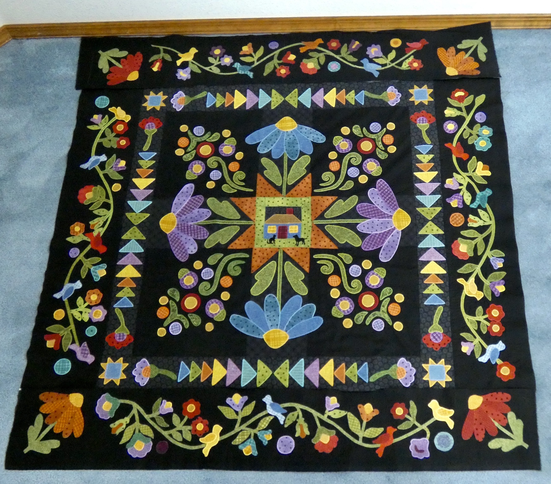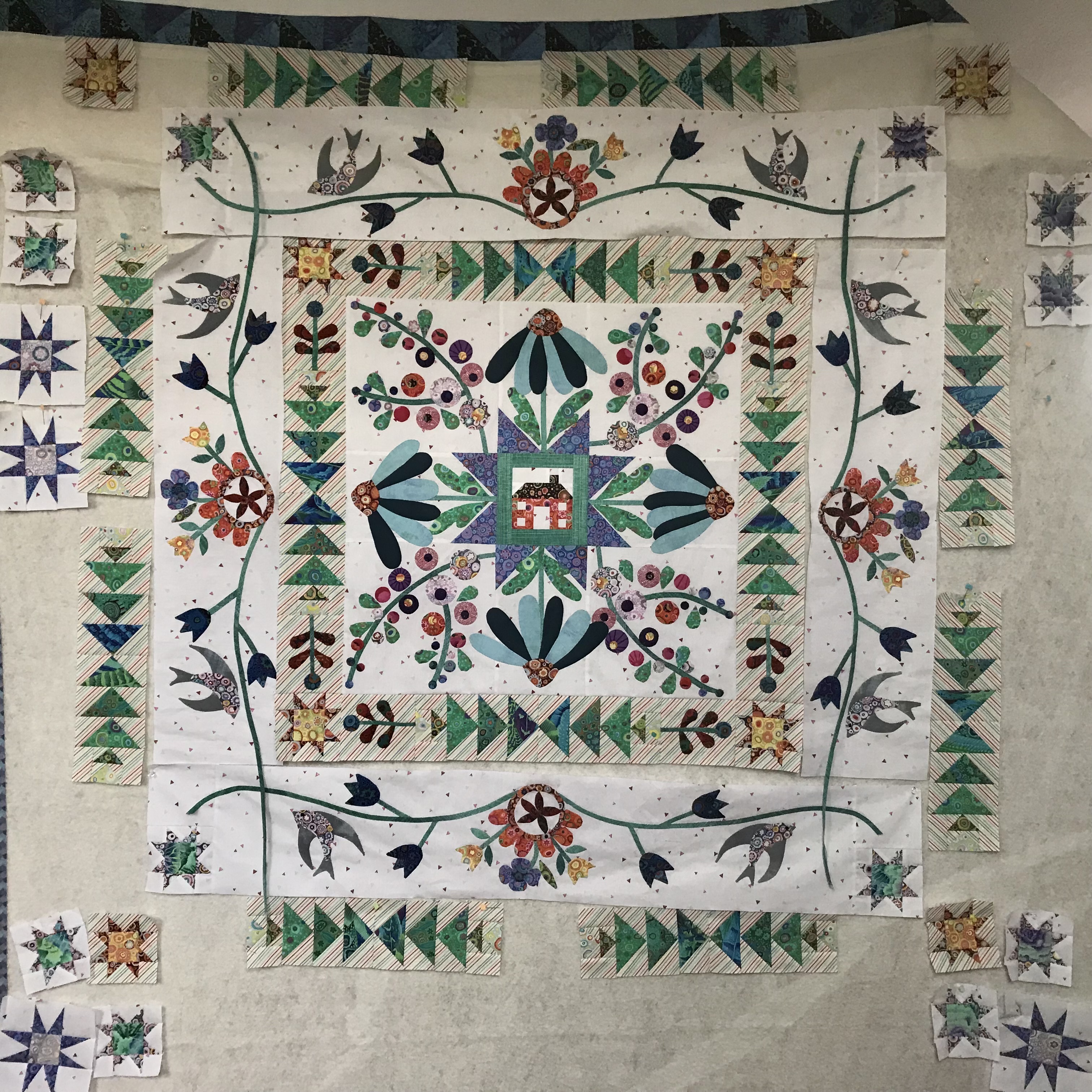 instead of sawtooth stars. Birds are small and on the vines. Border is a from a Lori Smith pattern called Aunt