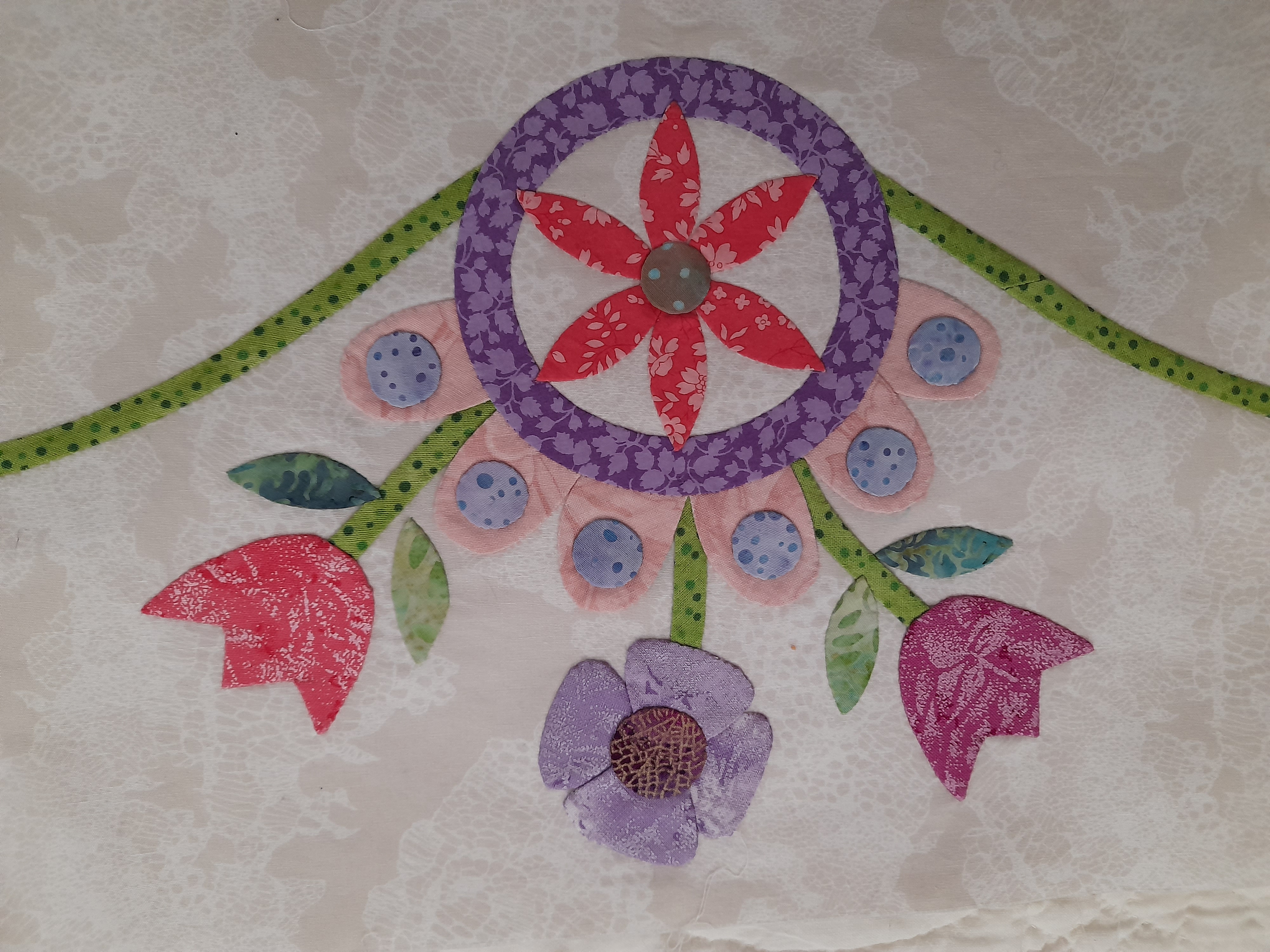 I can't believe I am caught up! This has been the hardest thing I have ever tried. It's my first try at need turn appliqué and sorry to say but I don't like doing this. I find the process frustrating as my work doesn't look neat. There are so many mistakes that I have made with this quilt but I am learning what not to do the next time I attempt something like this. For instance, I mistakenly used my grey marker for sewing placement, then had to move things around and now the grey line is visible. I don't know how to remove it. Should have used a chalk pencil. Oh well, I guess lesson learned. I also decided to do the large vine flowers using Karen Kay Buckley's method and heat resistant template plastic and I am so much happier with the results than my terrible needle turned appliquéd tulip flowers. I feel like I am cheating by doing it this way but it is less frustrating for me. . Only wish I had seen the cleaver way to do the petal flower ; I redid one 4 times and it still looks wonky!