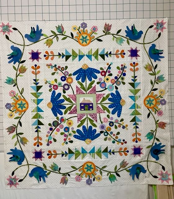 I'm really enjoying this project. I just couldn't wait to get those birds on so jumped ahead a bit. Placing those twisted vines was hard. I'm trying to stop myself/wait for the pattern by just fusing the vines & pinning the birds on. I used accuquilt cutter to cut flower shapes. It's fun to see everyone's design changes, thanks ya'll for posting
