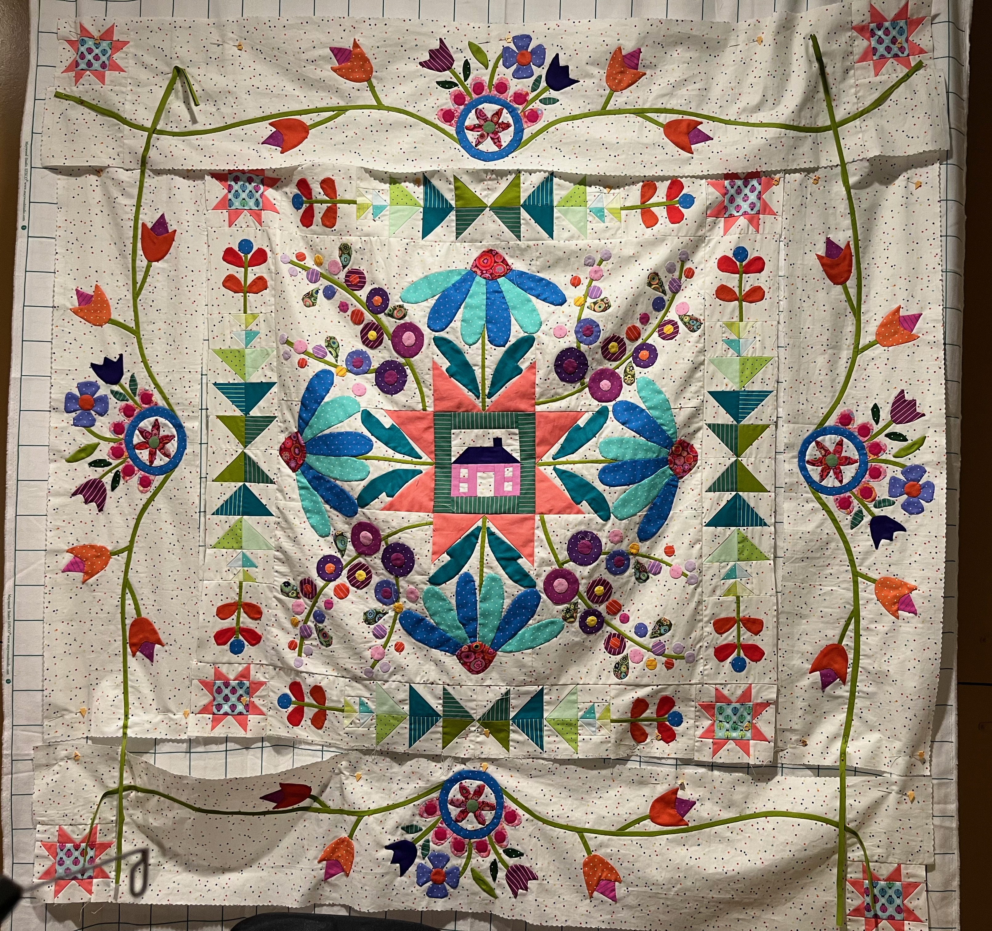 So I ripped out the sewn appliques, sewed more stems, cut another border piece and reapplied the appliqués. Quilters are not quitters...we roll with the punches!!