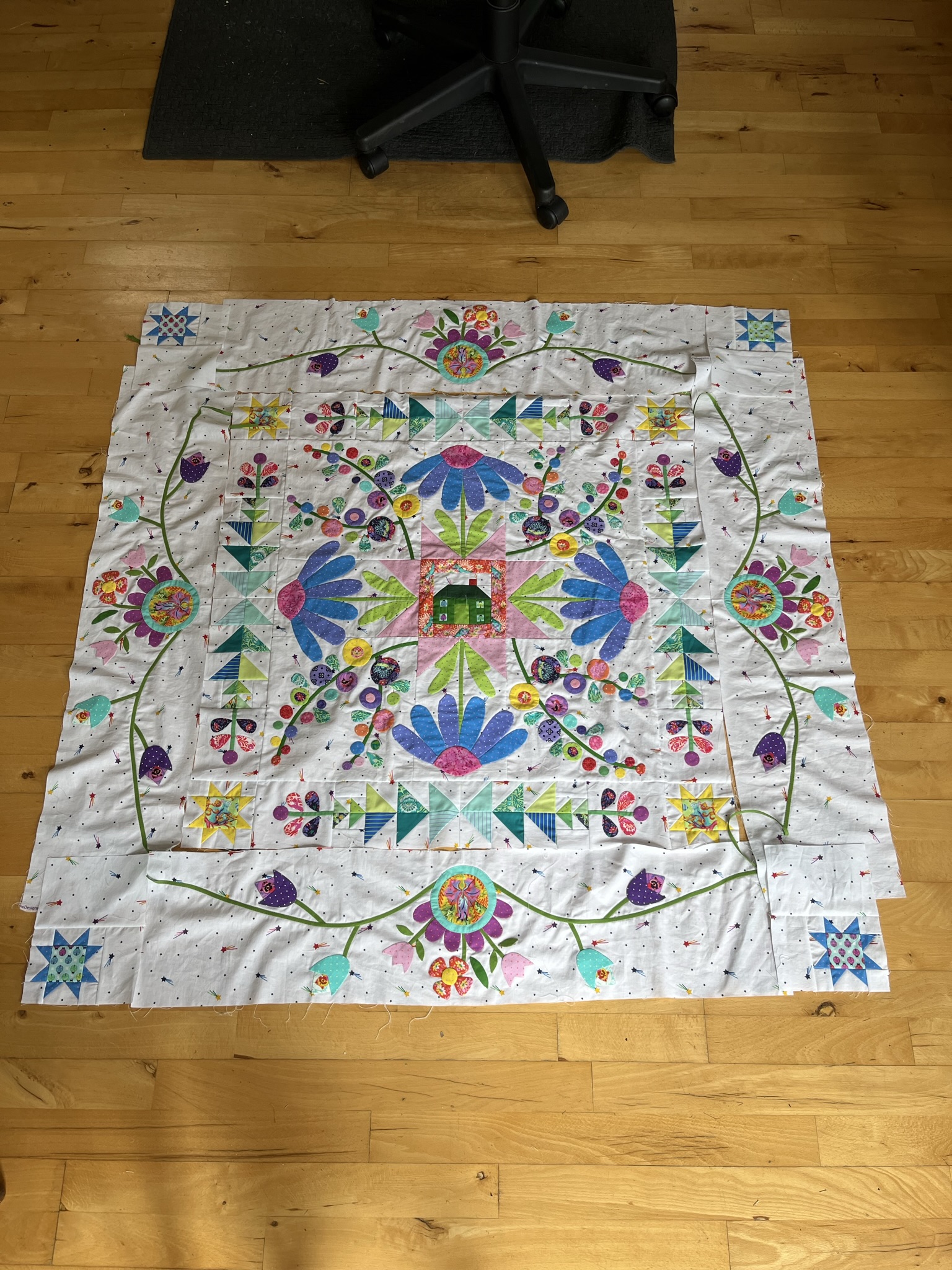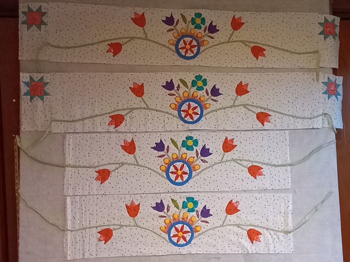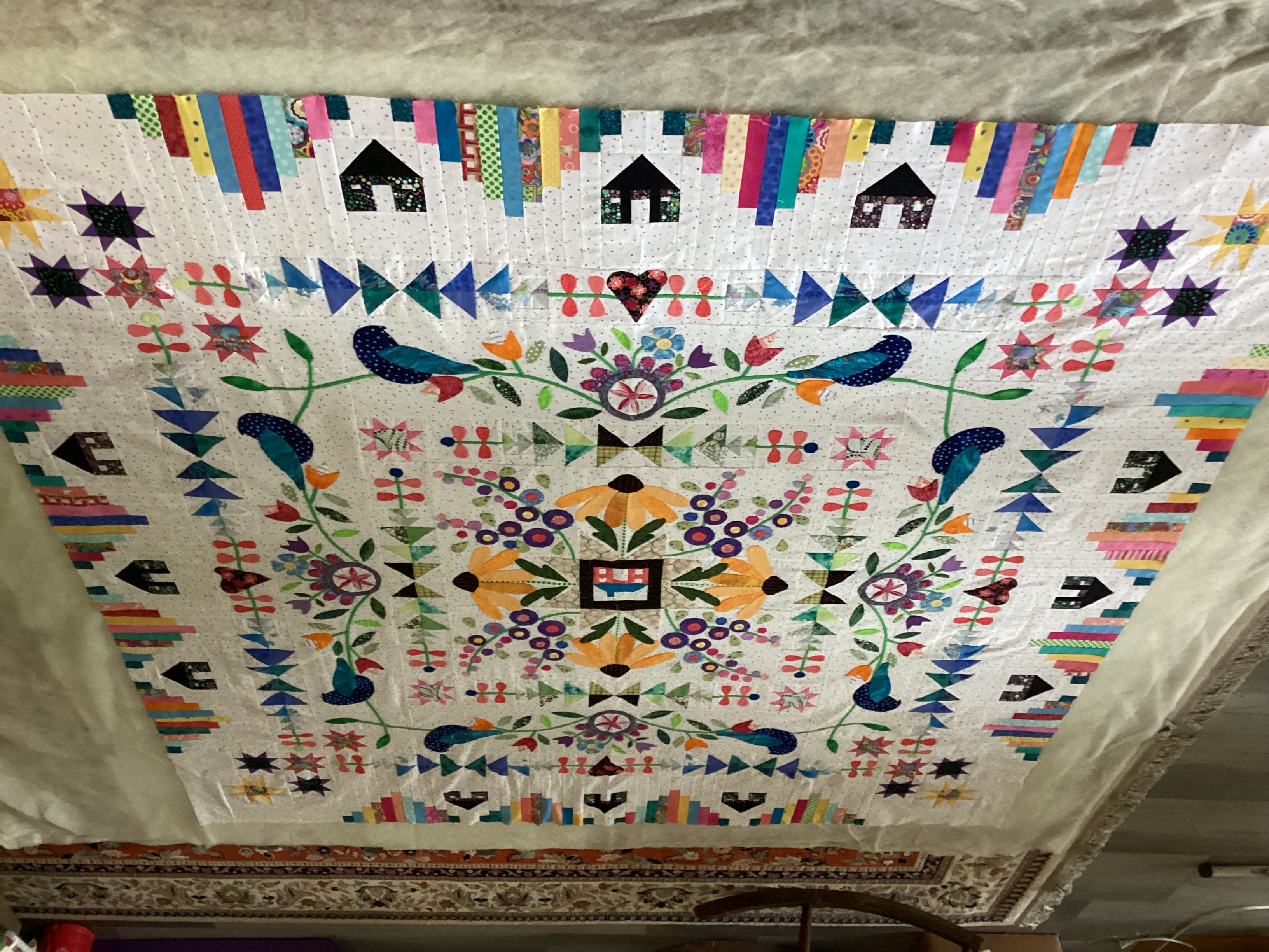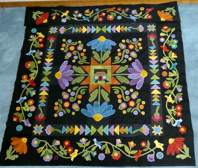 I changed out the birds, and used slightly different leaves so I could continue border appliqué. I was also able to figure out the final border and increased size from 6.5 to 9.5. I will quilt some kind of trees under the houses on the border. I am very pleased with the final outcome.