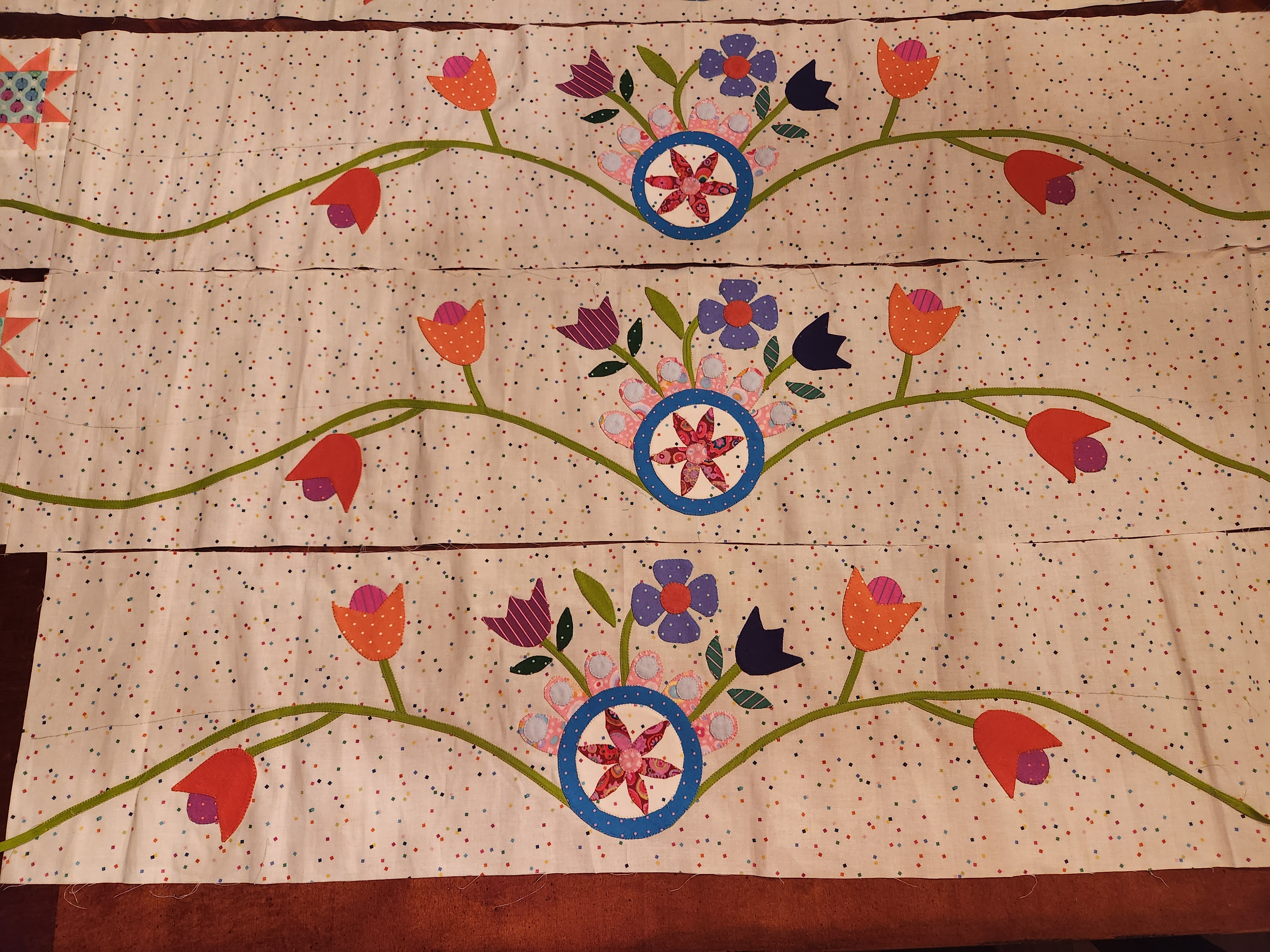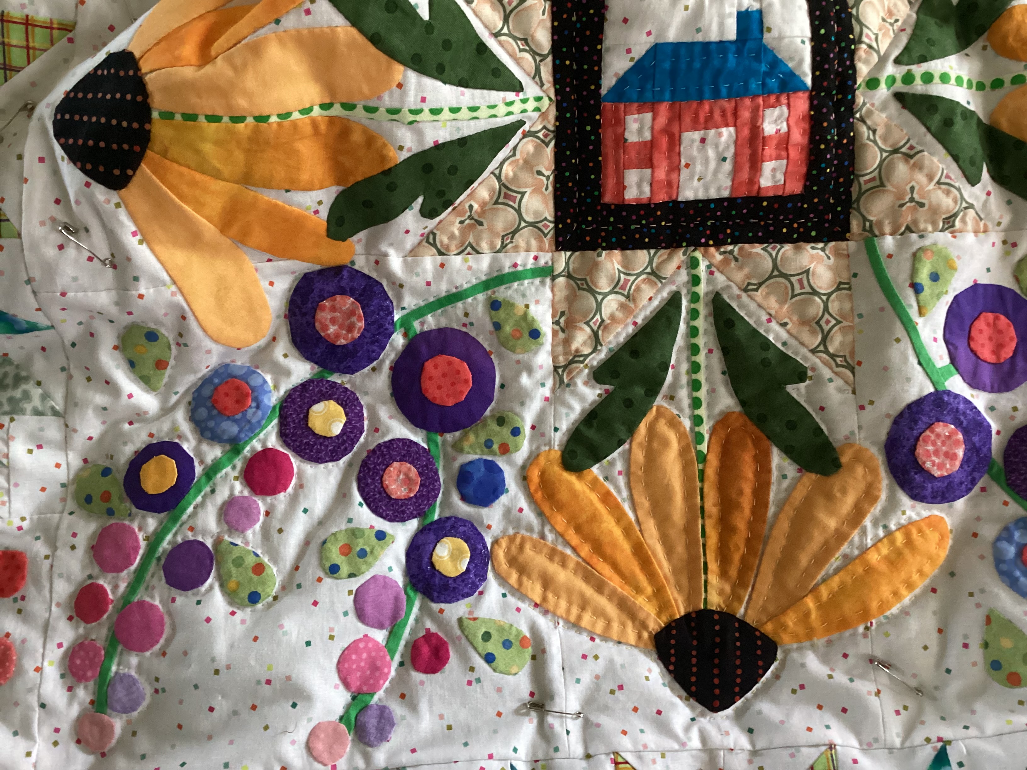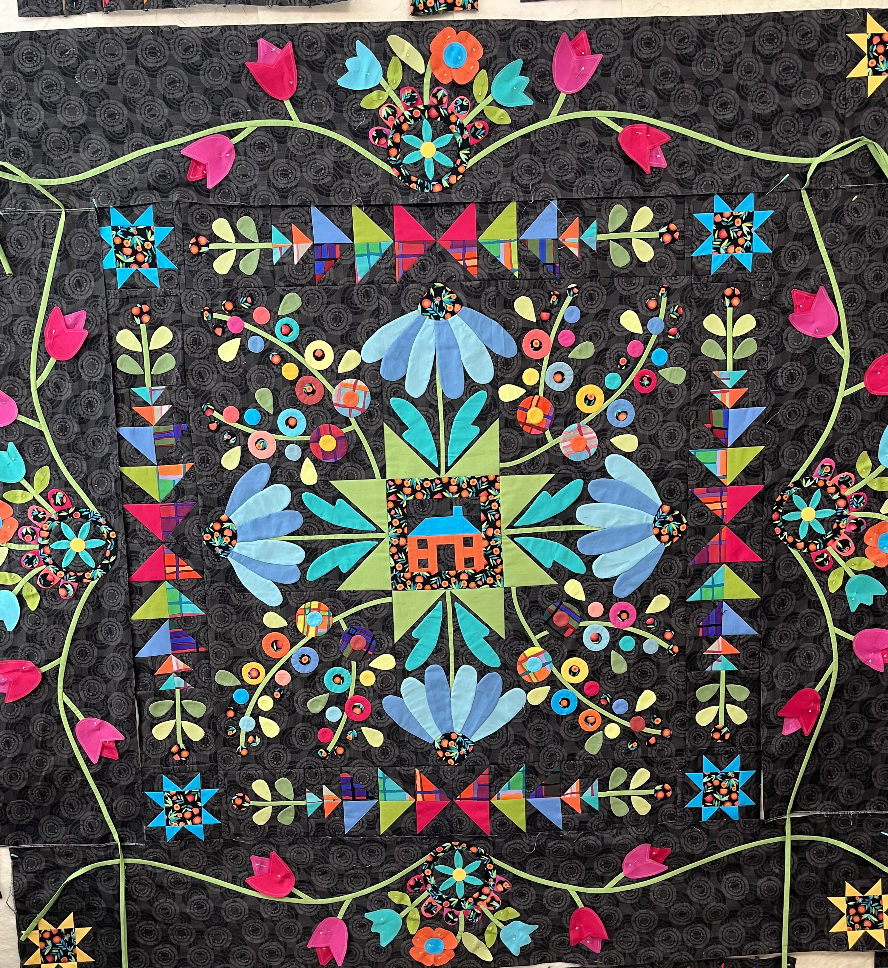 I changed out the birds, and used slightly different leaves so I could continue border appliqué. I was also able to figure out the final border and increased size from 6.5 to 9.5. I will quilt some kind of trees under the houses on the border. I am very pleased with the final outcome.