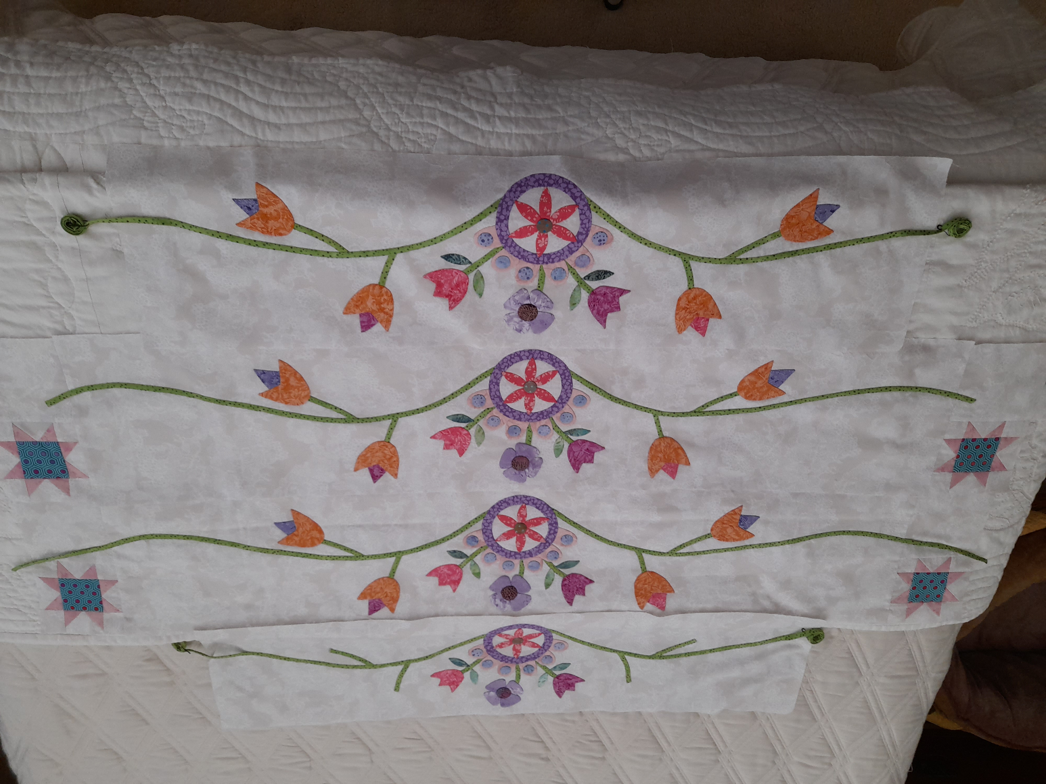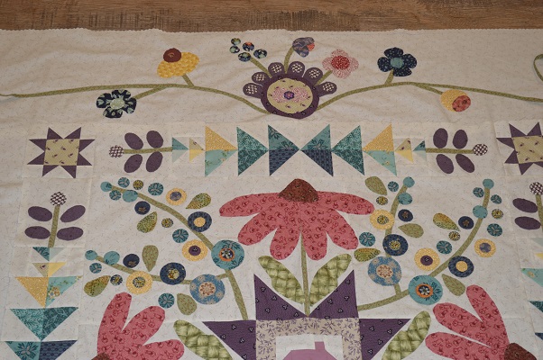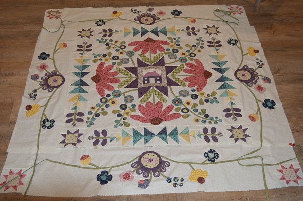 I have stitched the center, one big flower and the smaller circle flowers. I love the tread. The needles are longer and so quilting it a bit different and I have used a thimble and not used one. I am stitching about 1/8 away from appliqué edge as the stitching and colors can been seen better.