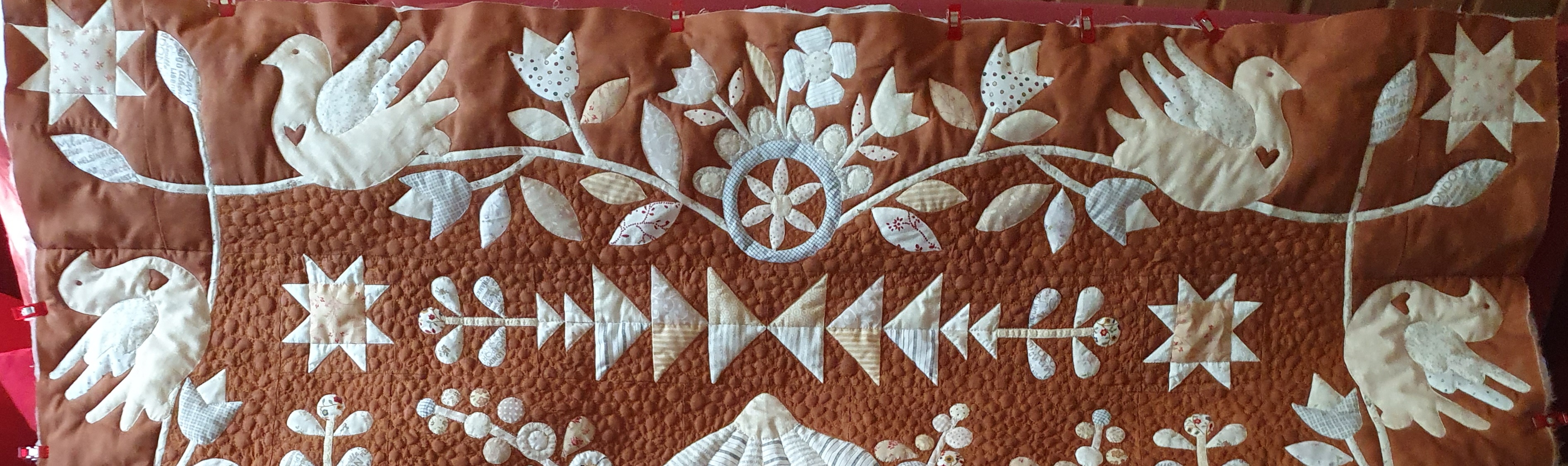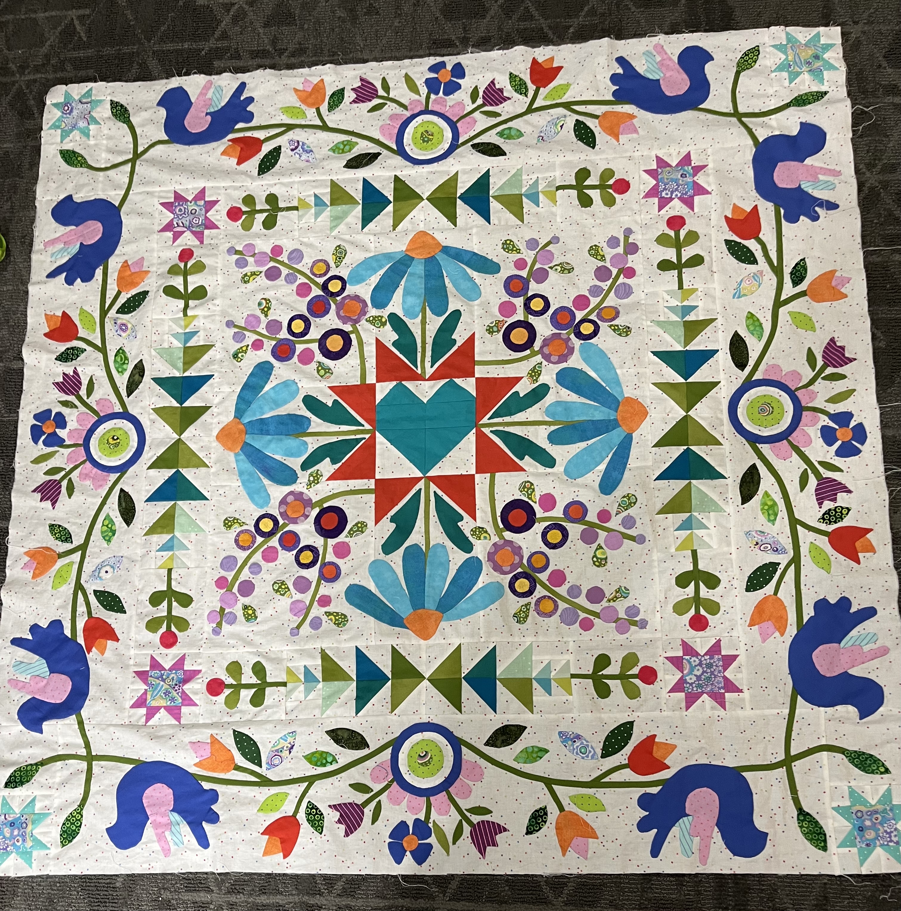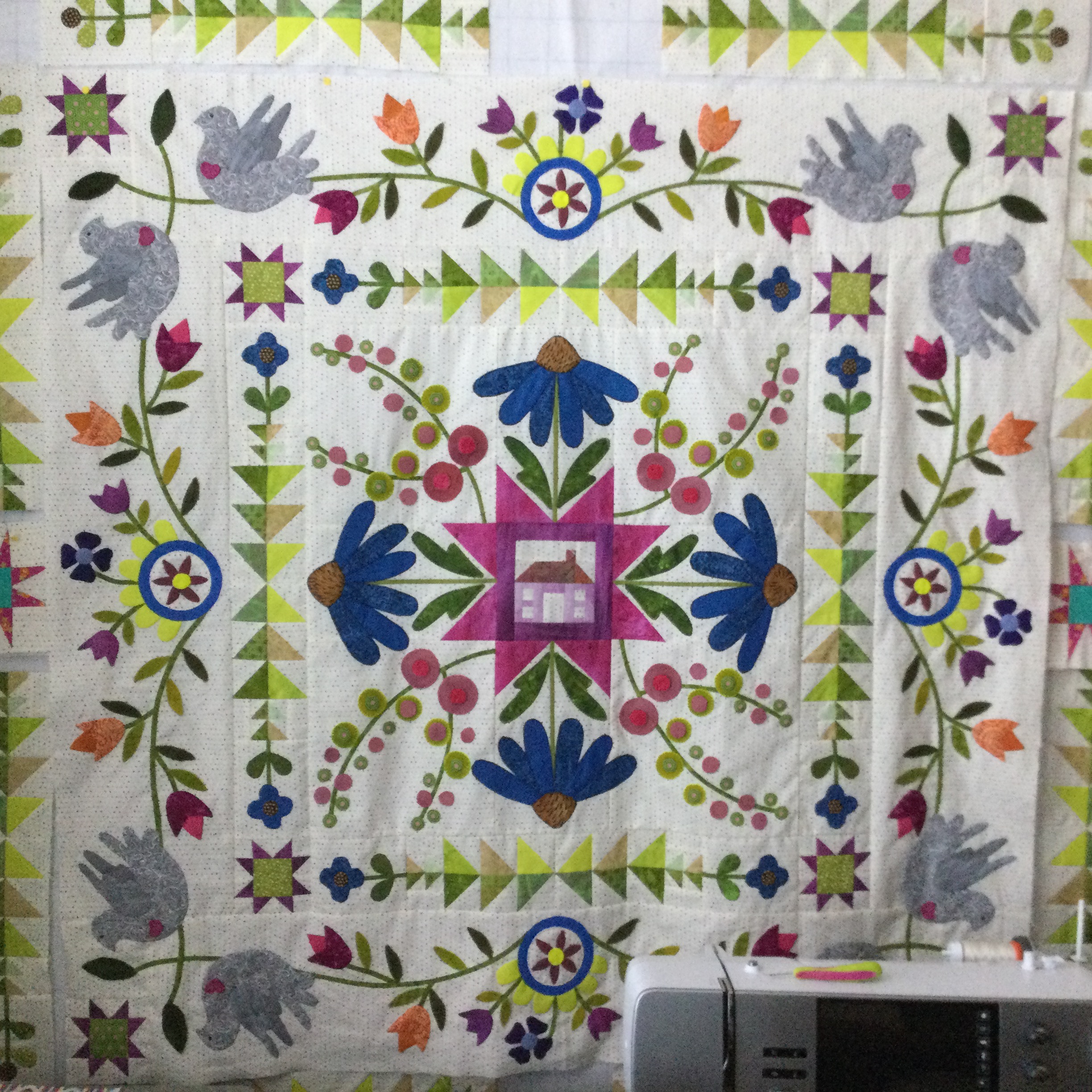 This was a challenging month. Lots and lots of leaves. The placement of all the parts was a challenge and then appliqueing the birds, vines and final leaves on the side borders after sewing the borders on was interesting. I used 2 of the specialty stitches on my machine to make the doves eyes and heart. I sewed them on the doves before appliqueing them on the border. I liked the way that turned out. I am looking forward to the piecing we will do next month!