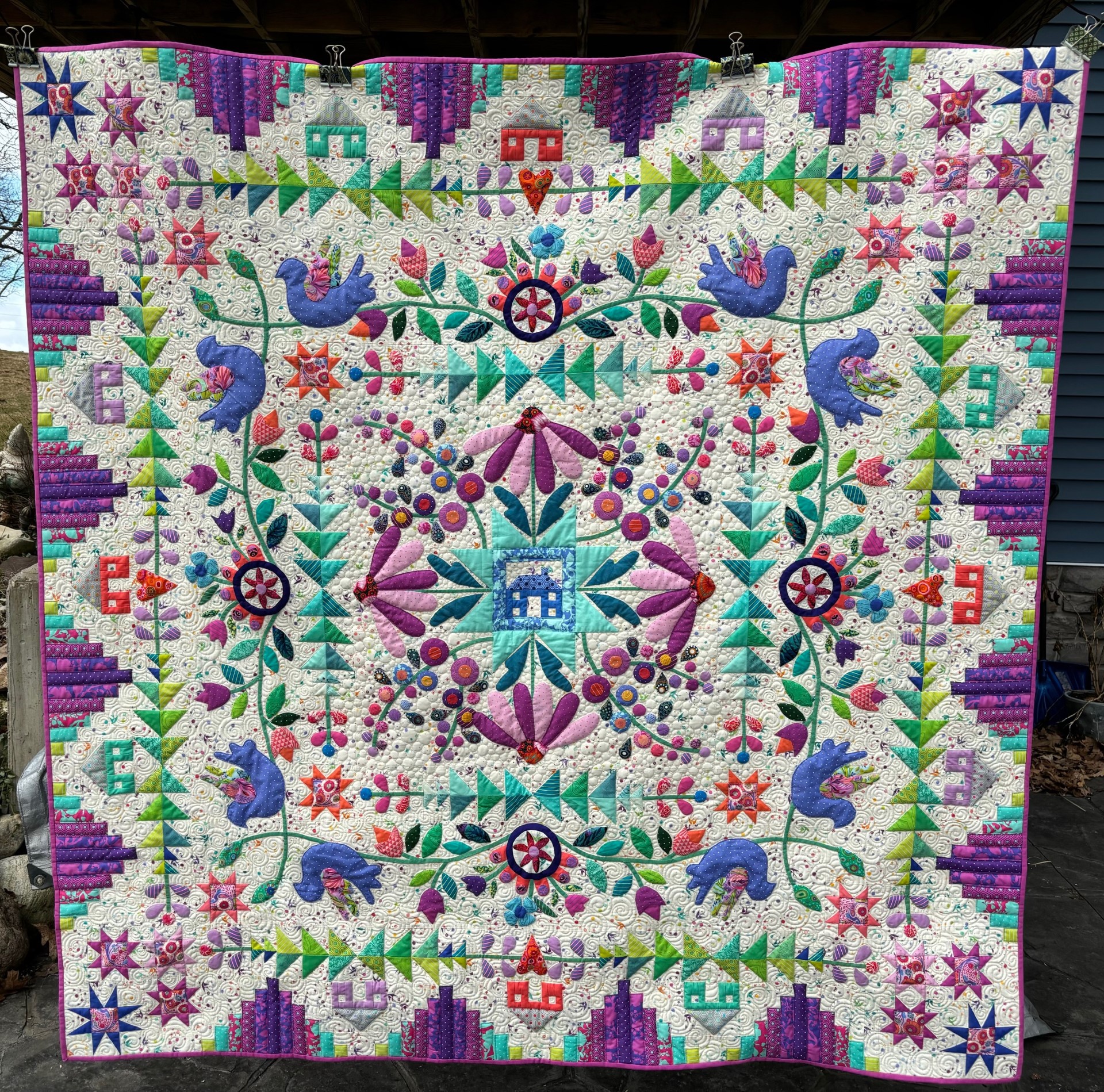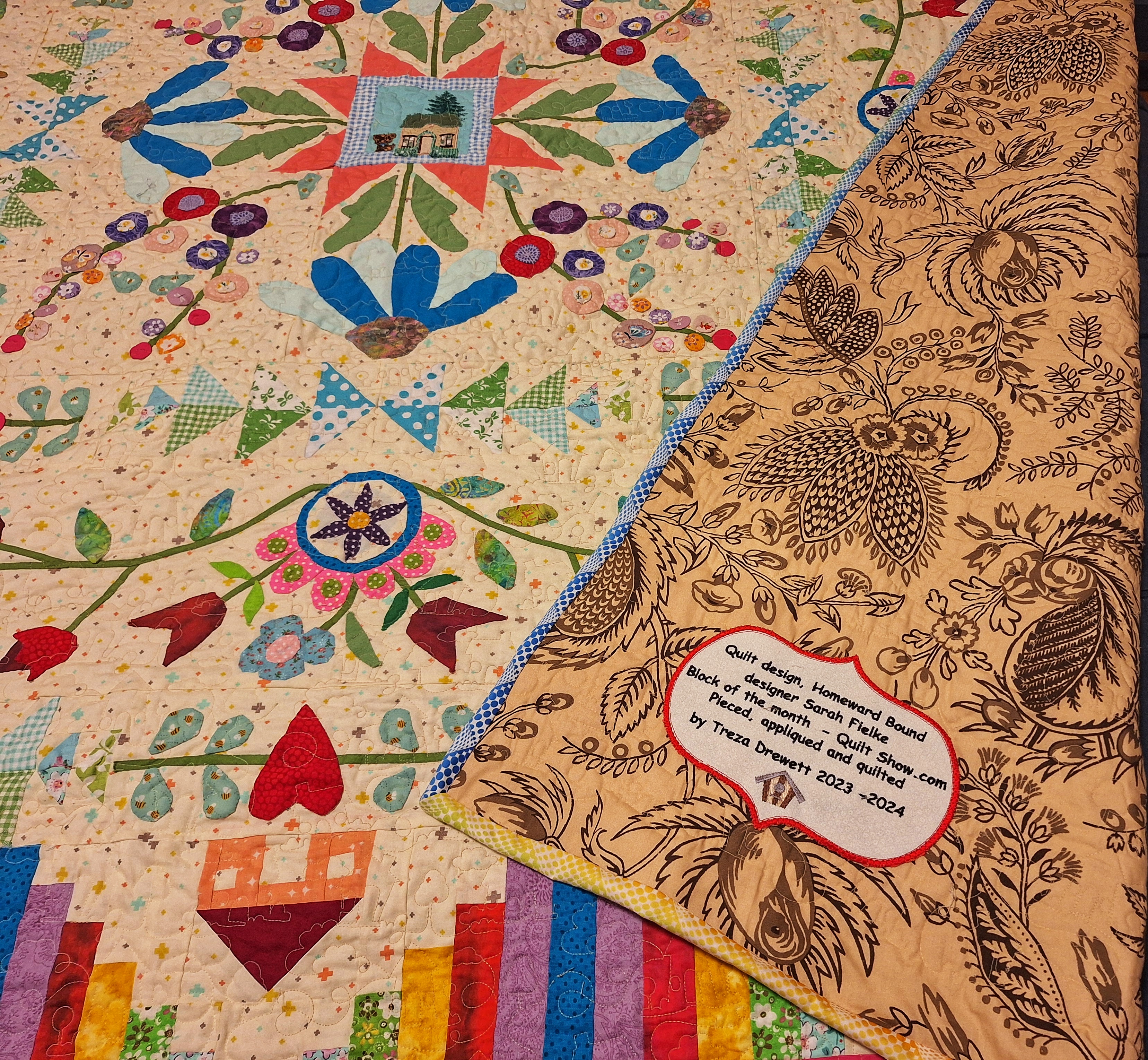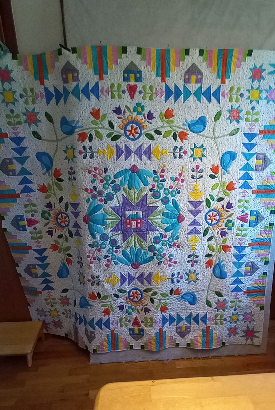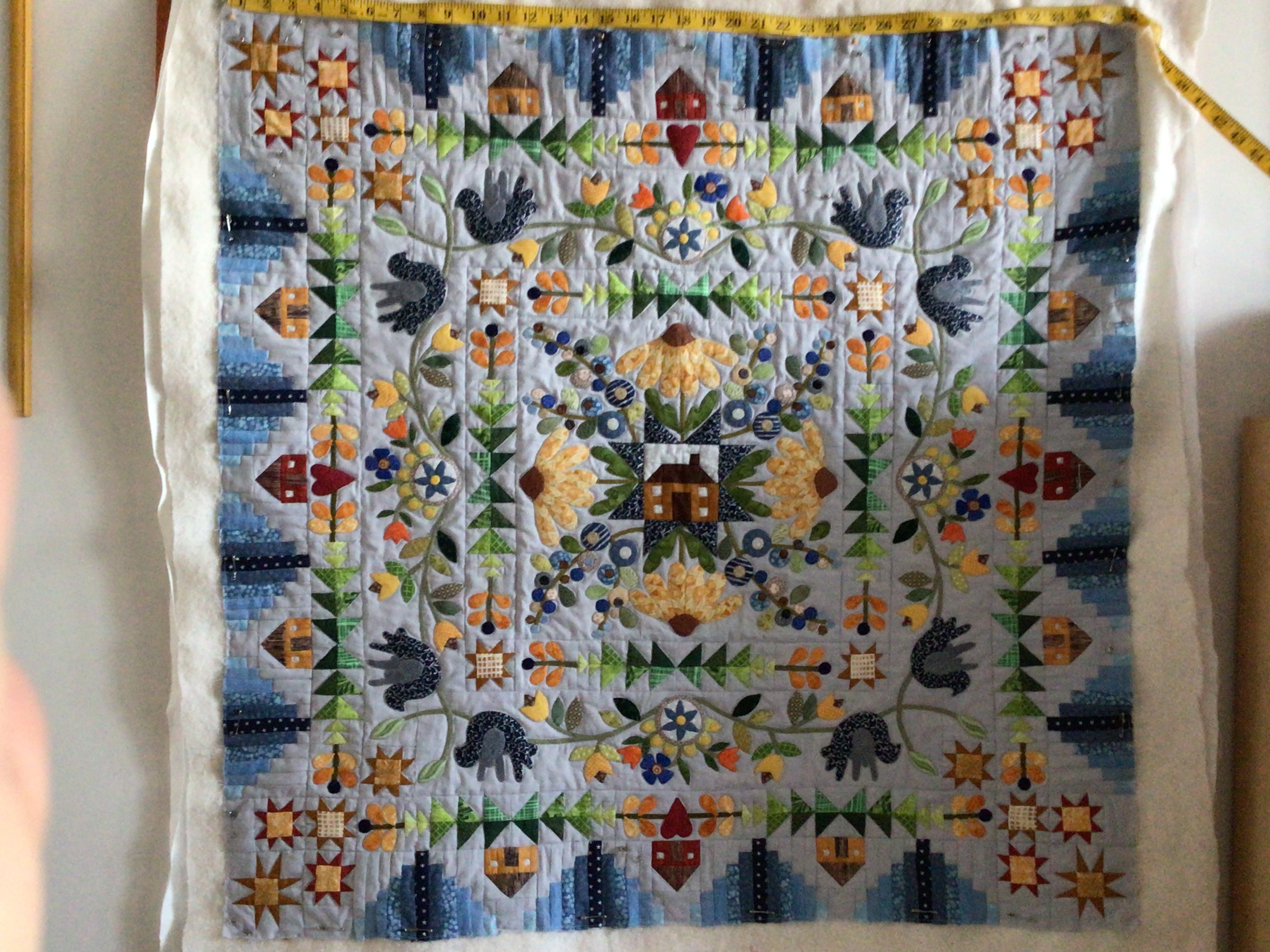 I finished my Homeward Bound top all in the last month because I want to get going on the next BOM. It’s actually 50% smaller,except for the center house, because I wanted to use my small scraps. I have stitched in the ditch around all of the appliqué. It needs more quilting in the background to flatten it. Does anyone have any suggestions on what to free motion on it?