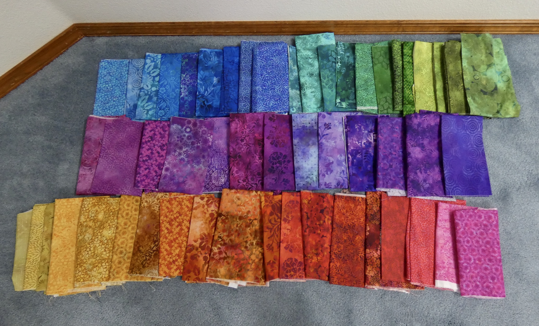 This quilt is so scrappy it’s perfect for using your scraps/leftovers. I have used photos to help plan a quilt fabric palette. I have a photo of a beautiful rooster from Kauai that I used for two quilts. Another good place for inspiration is the paint section at the hardware store. There are paint flyers showing complementary color themes. Once you settle on 2-4 colors, simply pull a wide variety of each. All greens go together. All reds work together. All purples, etc.