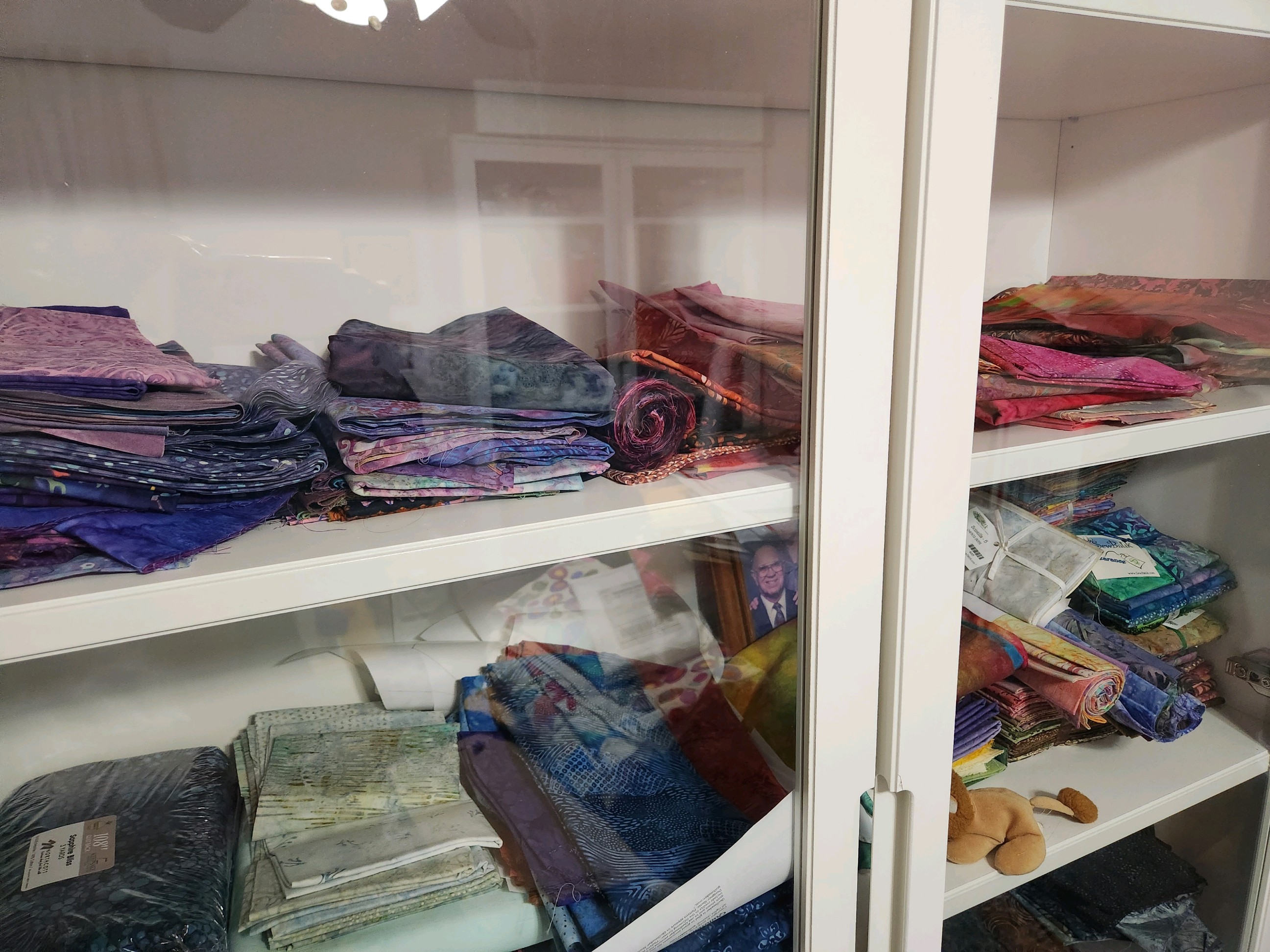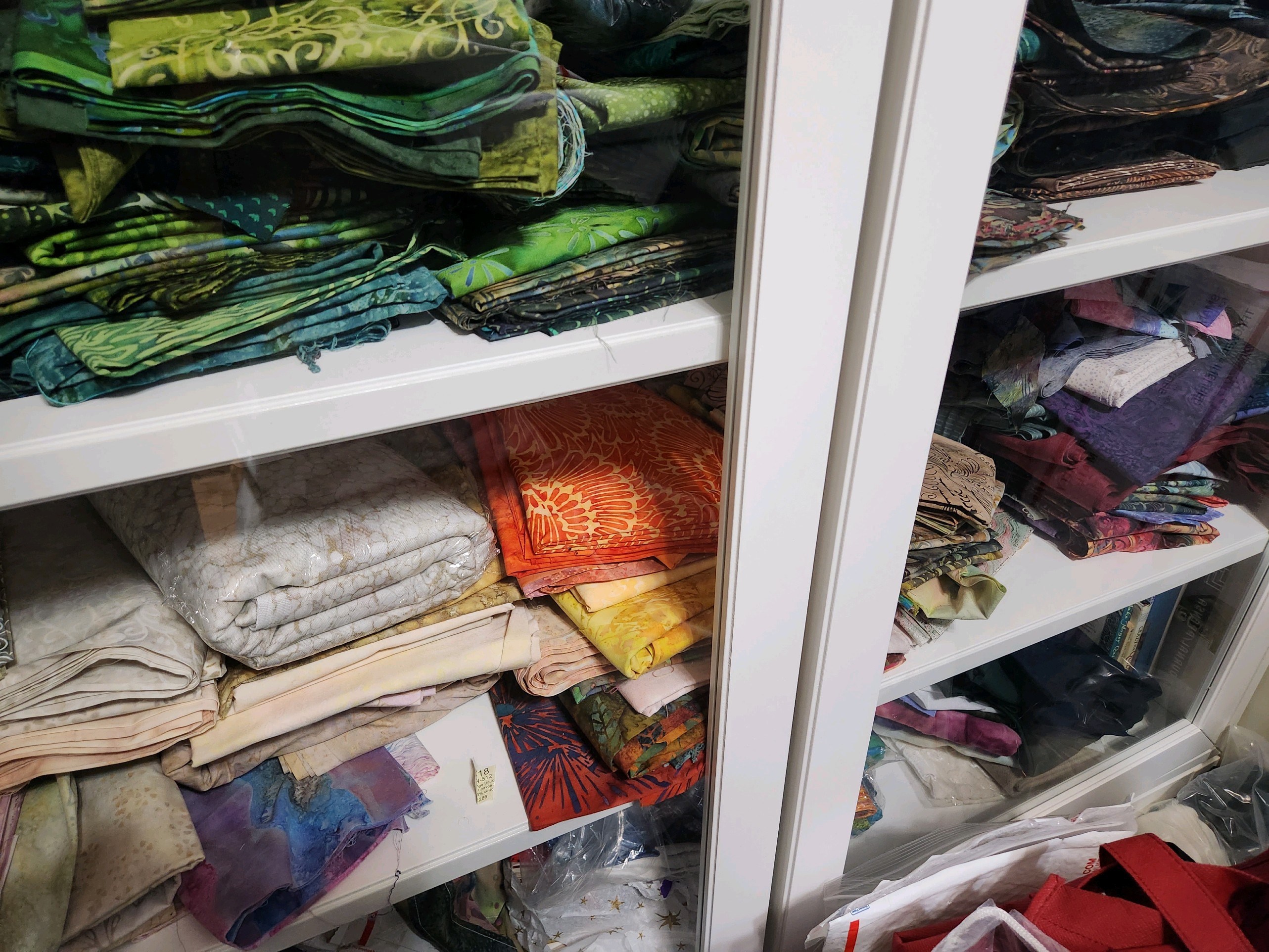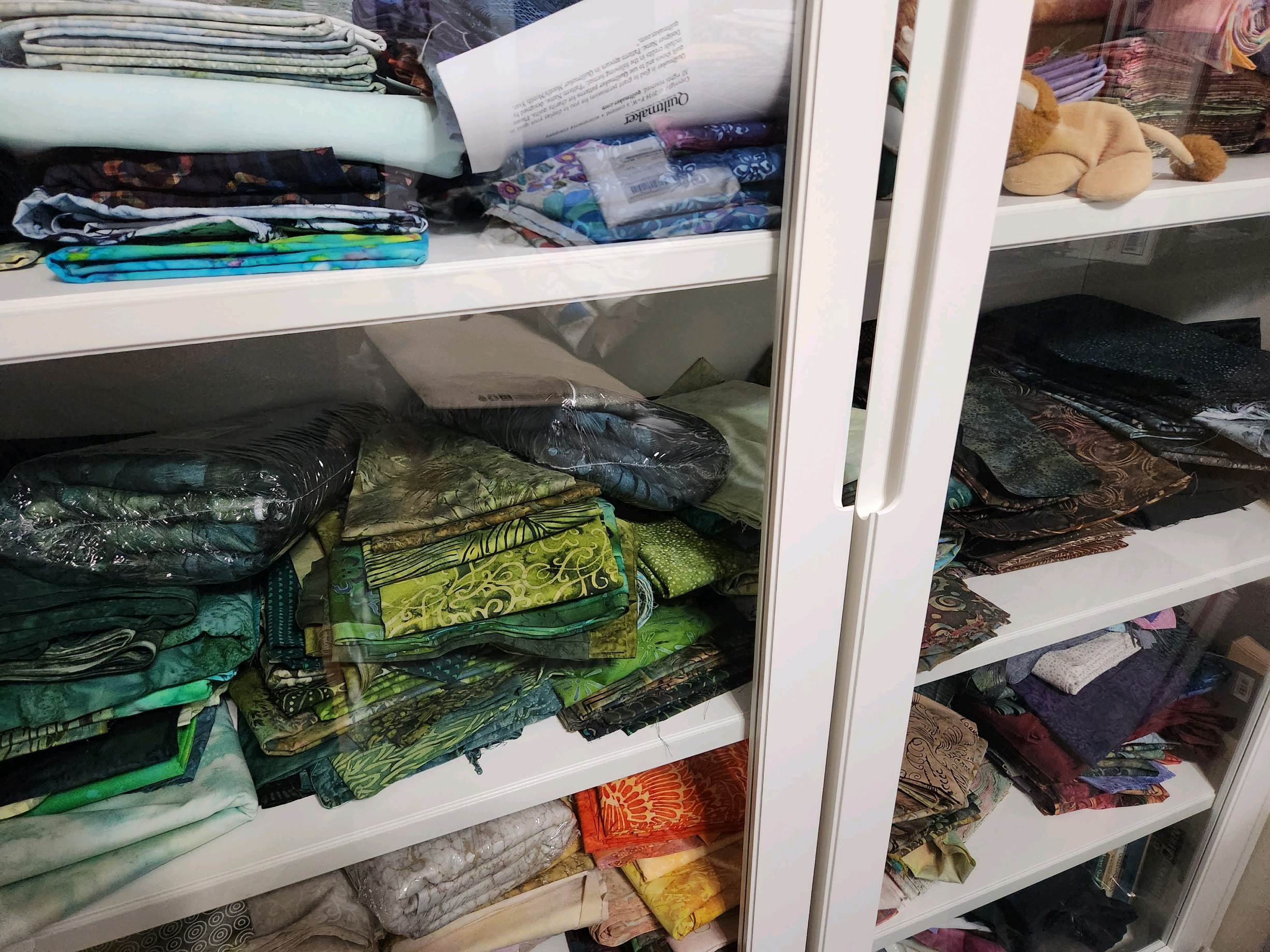 I took a photo of the new fabrics that I've picked up in the past month or so as well as my cabinet showing all the batiks that I already have tucked away. The 3 light pieces on the new fabric photo at the bottom are what I'm planning on using for the pale blocks in the new BOM. I was too lazy to move my serger out of the way of the cabinet so I took the photos through the glass which was probably not the best way to do it. I didn't realize that the cabinet on the other side of the room and an envelope with a pattern inside would show up like ghosts on the glass. I always thought I had lots of blues but when I started putting fabric in the cabinet it turned out I had more greens than anything else. I'm pretty sure I have more fabric in a pile somewhere from a couple quilts I did with Ricky Tims that never made it back to the cabinet. I'll have to dig those out as well.