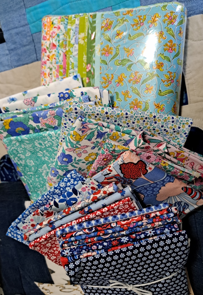 I am not at home right now so I can not take a picture. I have a whole dresser drawer filled with Kaffe and Tula fabrics, mostly fat quarters but some scraps. (My "studio" is a bedroom with the machines in a large walk in closet.) I am looking forward to this project.