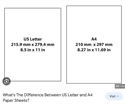 Troube with printing sizes... I asked Mr Google for some clarification of A4 and US Letter, often just called letter.