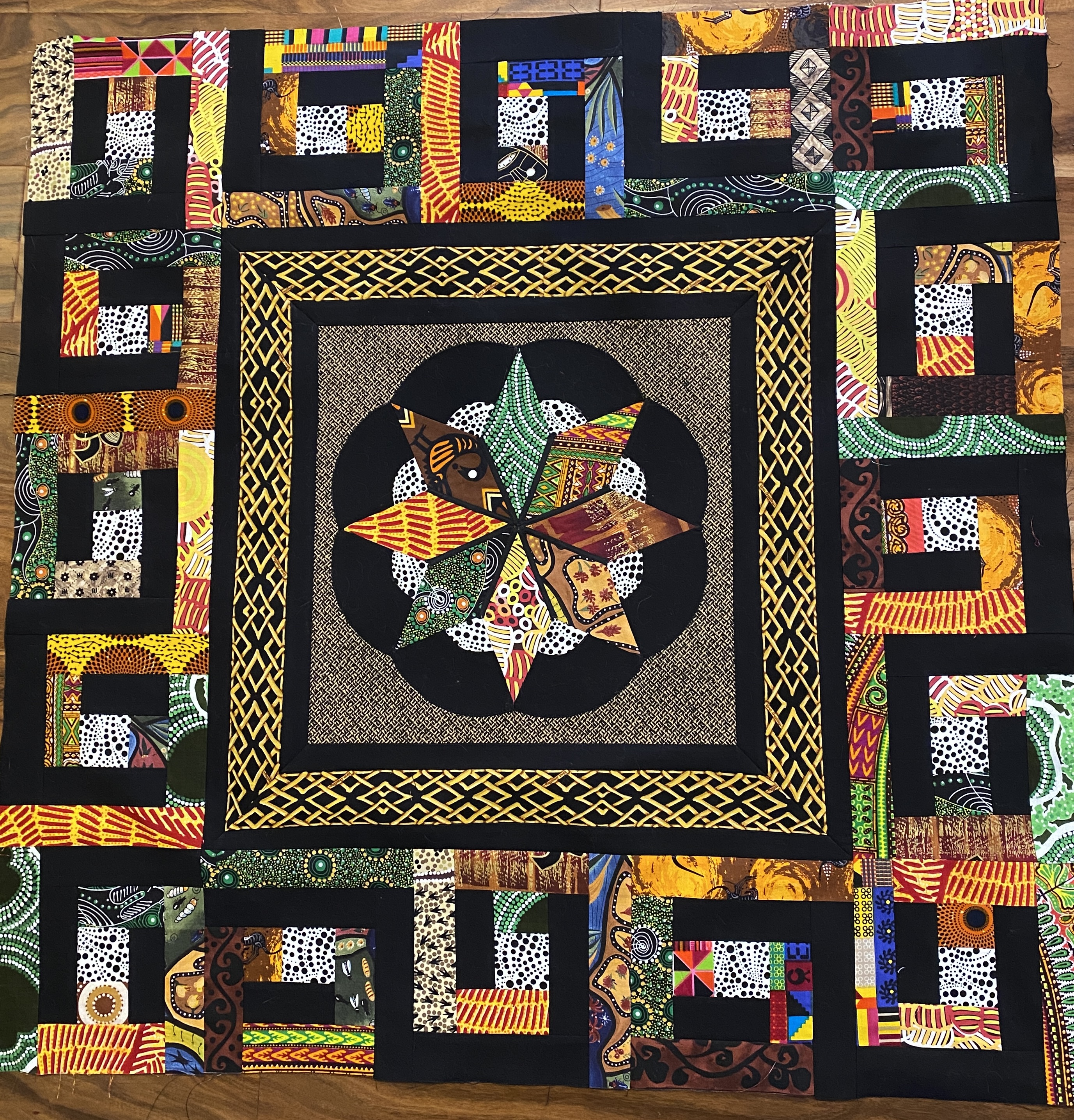 I tried encircling the centre with the proposed block but it didn't look right. . . .I think I'll save it for the outer border. This block seem to give the quilt a more African look. I believe this block is the one used for the embroidery block, so I'm going to have to give this a lot of thought on what to do next. This baby certainly has a mind of its own.