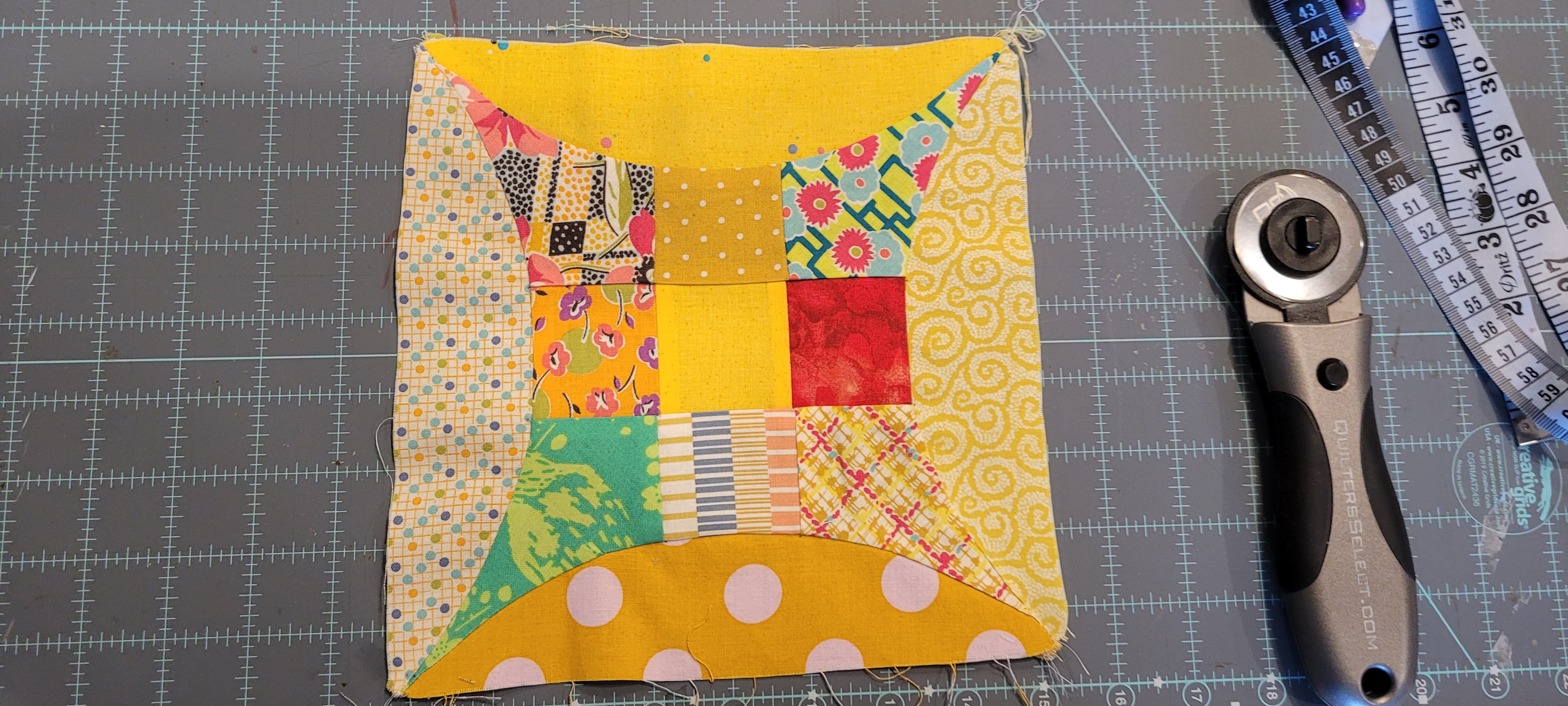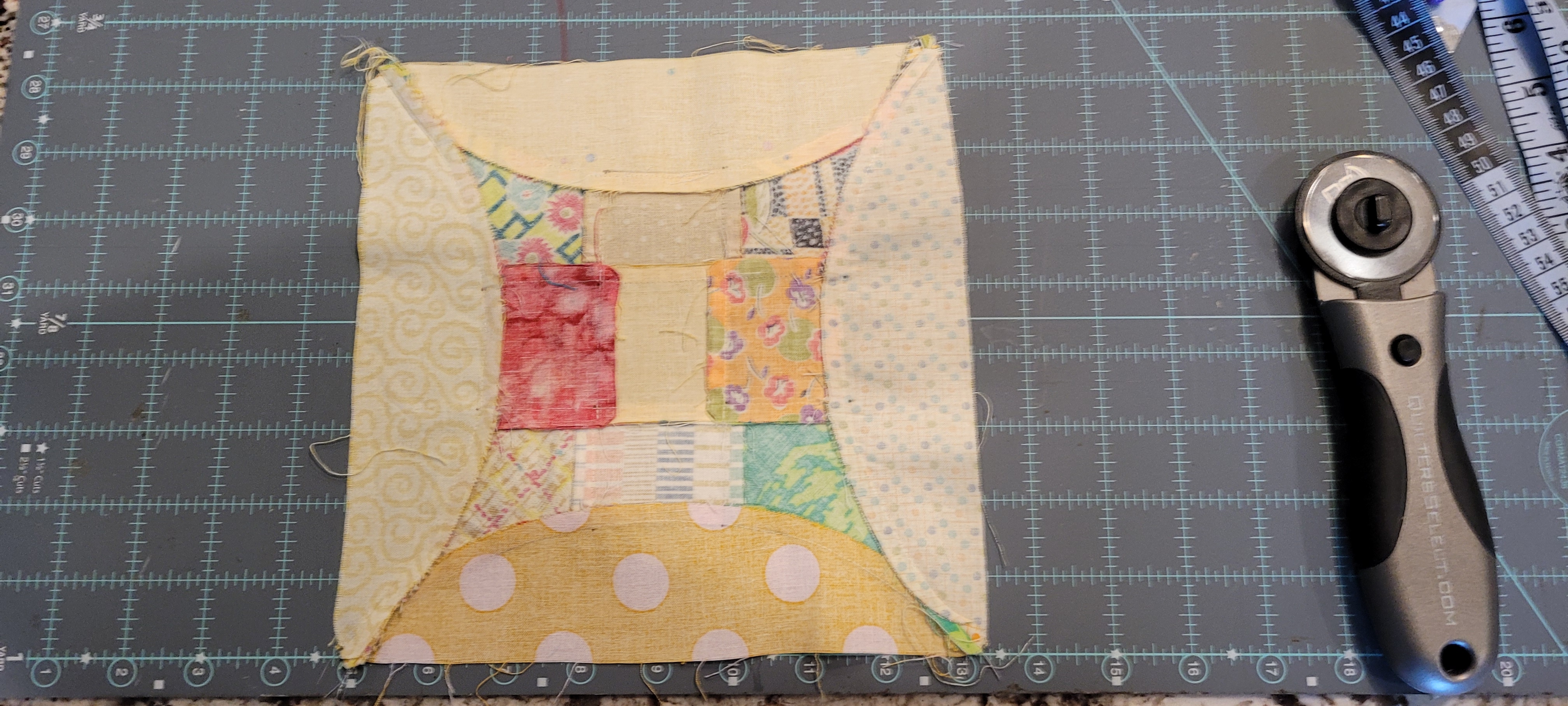 Here's my first try at preparing the block by using the templates and sewing by machine. I was reminded of my past garment sewing days. When sewing curves I usually stay stitched the curve first (not on this block) -- maybe that would help. Also I think I cut two of the curves on the cross grain and not the straight grain which caused the seam to pucker or roll. I am wondering if I should have ironed the seams differently--maybe the corners would have come out better. When I first finished it the puckers were worse so I sprayed it with Best Press, let it dry and pressed again. Much better but not perfect -- a little wonky? It is within a 1/16" of the 8-1/2 size. I'd appreciate any feedback. I'm going to try Barbara's method next and use the suggestion about putting interfacing on the curve before attaching. Learning a lot! Thanks everyone.