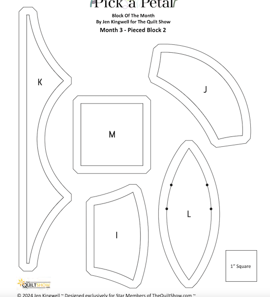 Robin, If I were you I would download the pattern to your computer, then print the shapes page. Make a plastic template or a couple layers of freezer paper for you J shape. Are you asking if you can use theOriginally posted by kram20 View PostI need some help. My template set didn't come with the letter J shape. Can I use the L Template in its place? It seems to fit the K & I seam line on those templates. Iam eagerly awaiting to here back.