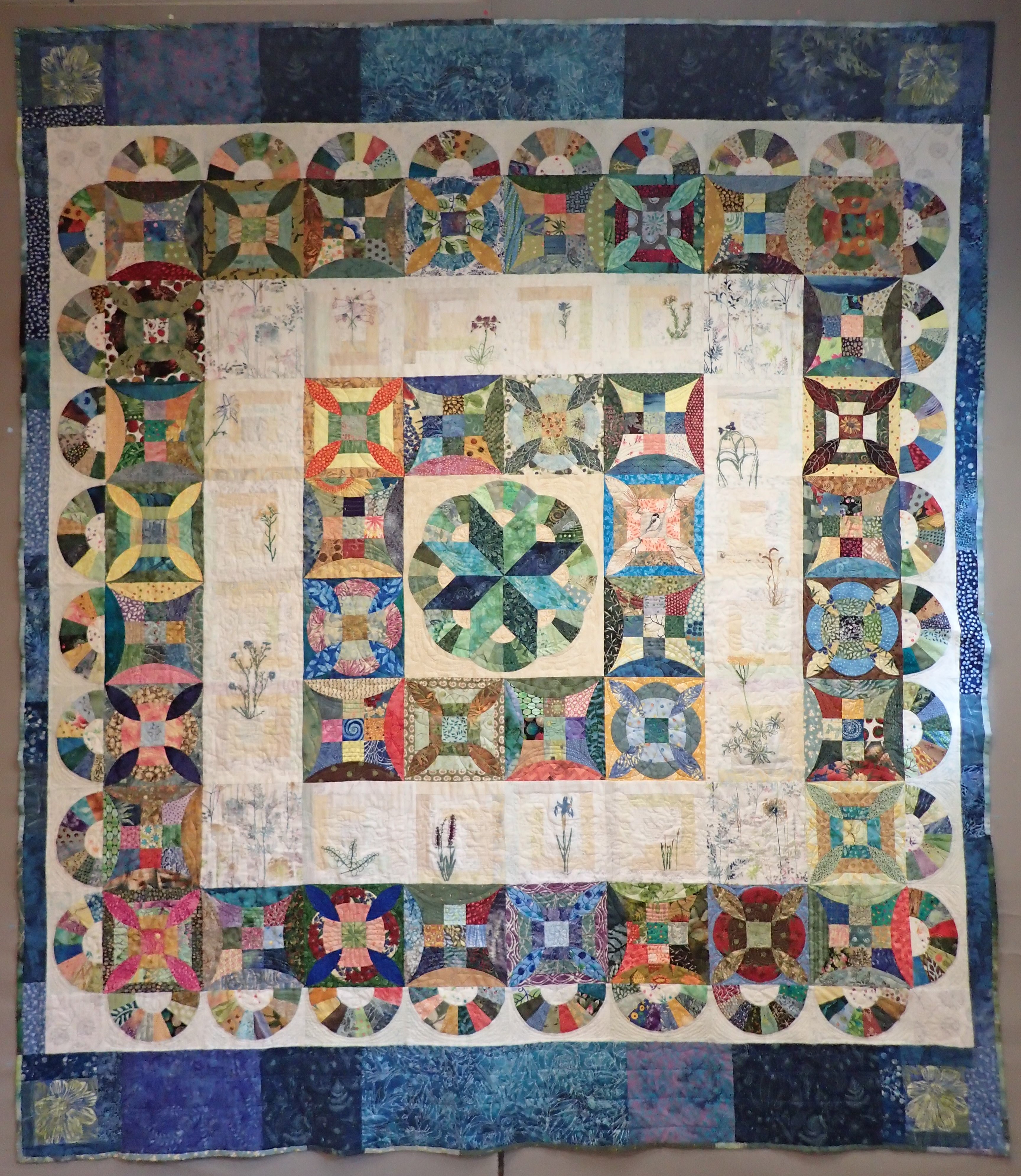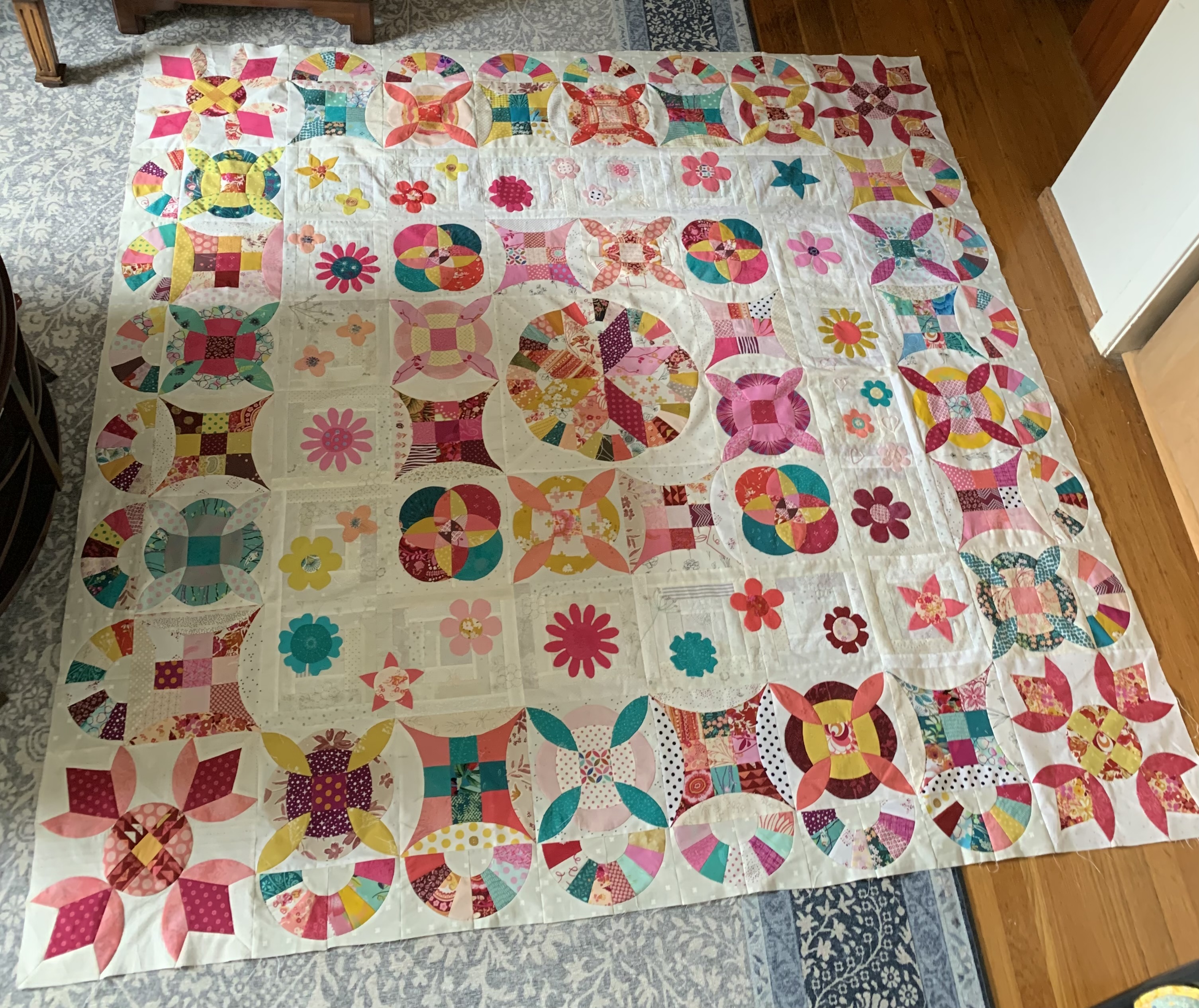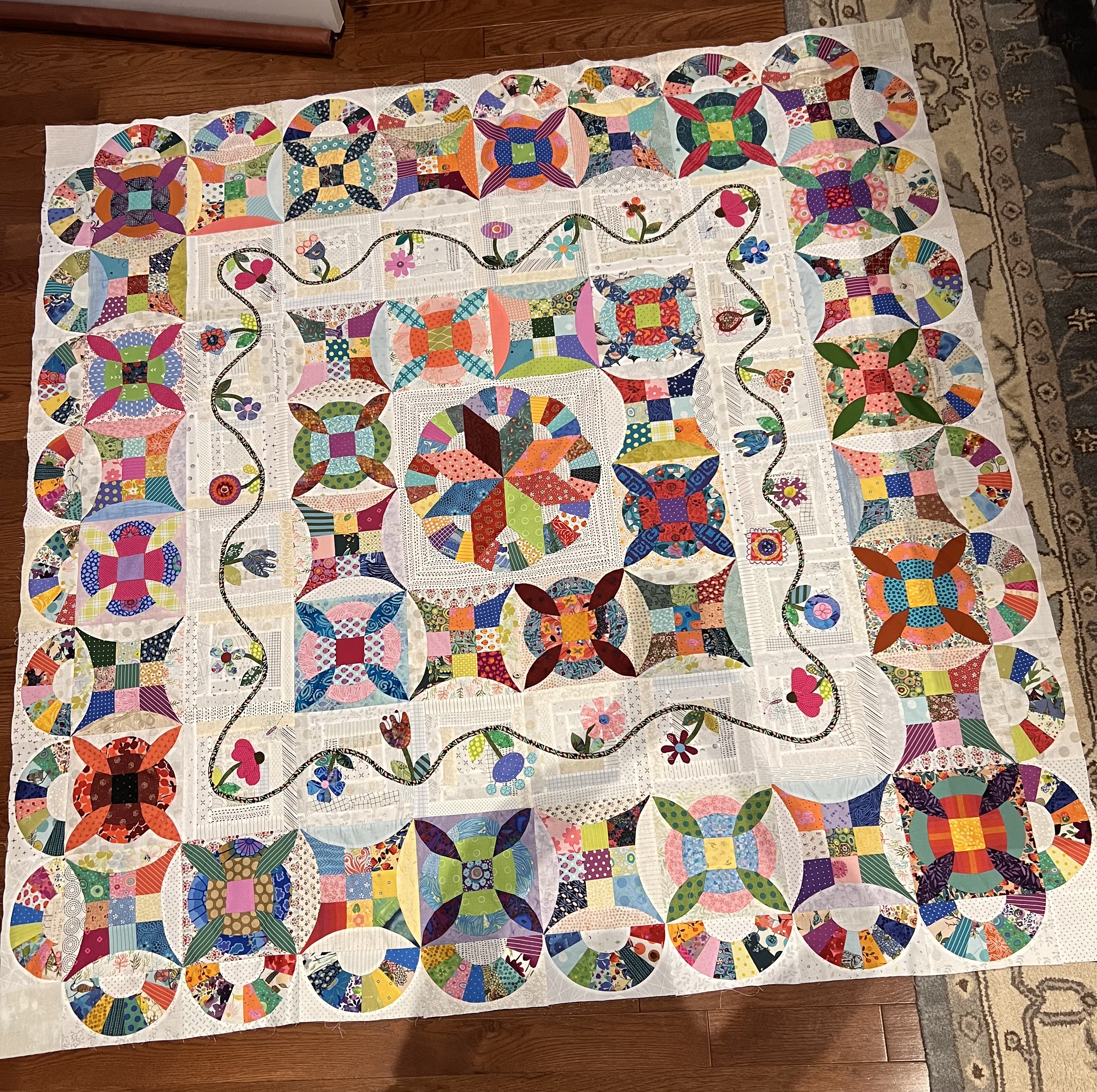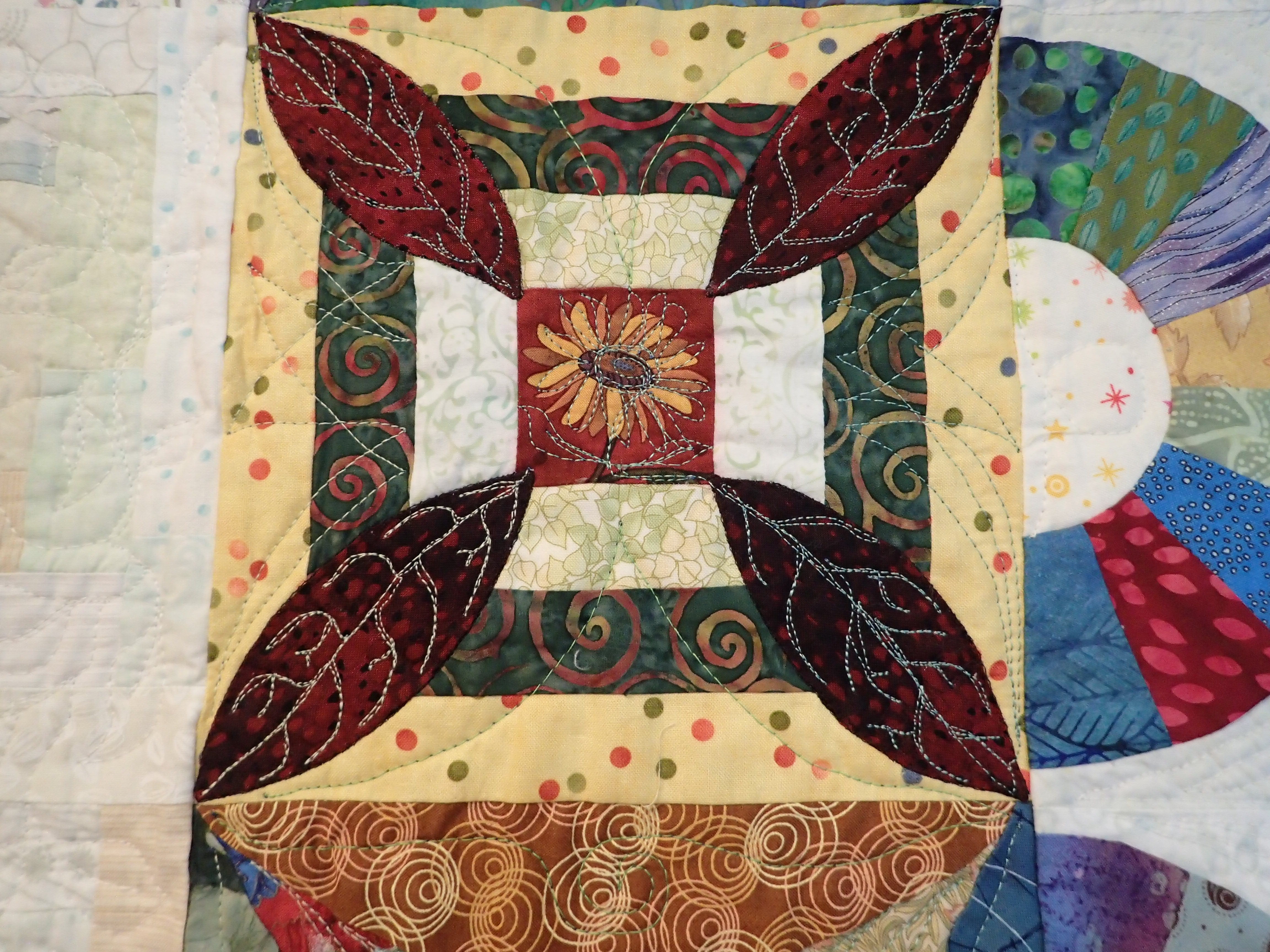 Finished quilting yesterday! This was my first time to use spray baste. I sprayed each layer outside and then assembled it on my design wall. I quilted it on my domestic machine. I changed thread colors often. I quilted leaf veins on all the petal pieces but kept all the other motifs simple using mostly swirls and leaves. The binding is a faux binding brought over from the back (which is scrappy as well). I just trimmed the back to 1" larger than the front and then folded half an inch twice towards the front (to end up with a scant half inch binding). Thank you Barbara, for all your wonderful blog information and video posts. Thank you also to Helen W and other forum participants for your kind encouragement.