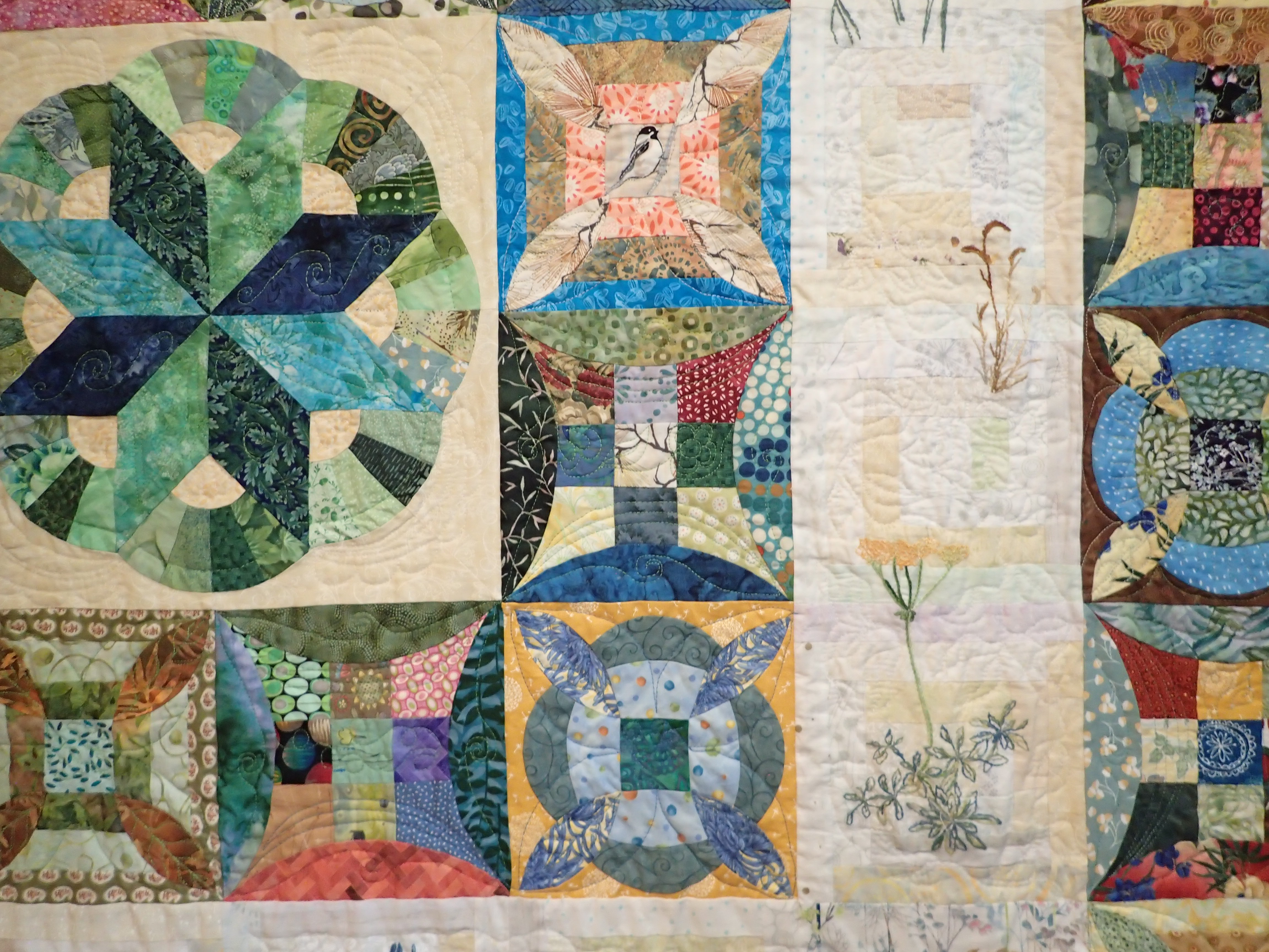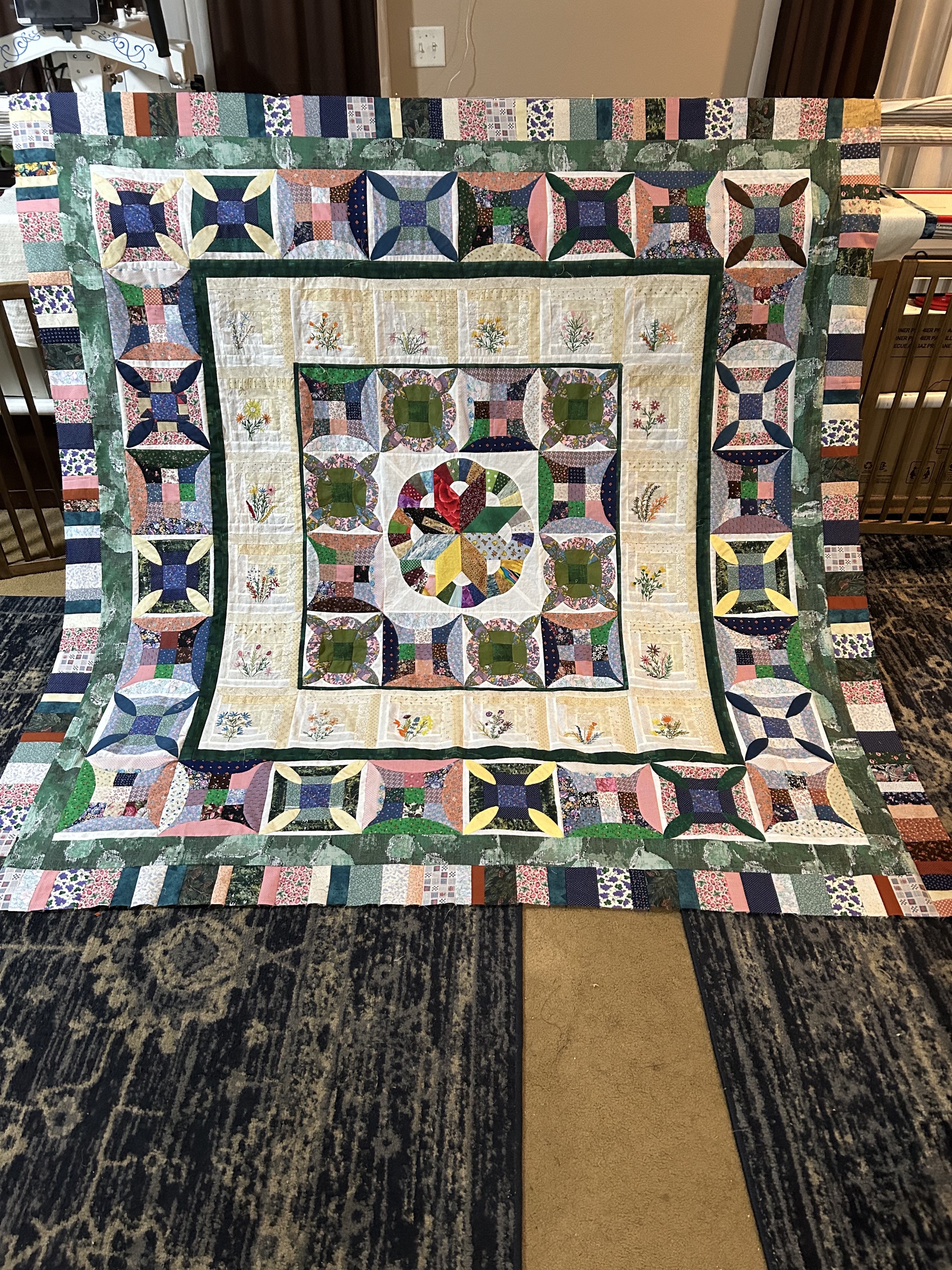 Originally posted by dsherman View PostI like the Block of the Month for 2024. I hand stitched the 2 center sections but machine sewed the rest. I'm not to into doing appliqué so I embroidered flowers on each log cabin block.After I was all done with the embroidery I noticed I had forgotten to turn the log cabin block so the embroidery was on the side that would have the darker fabric on the outside. Oh we'll I still think it is unique. I added the dark green stripes between the sections because my eyes just saw something else was needed. I just added a stripped border to finish the design. I just need to quilt on the longerm!