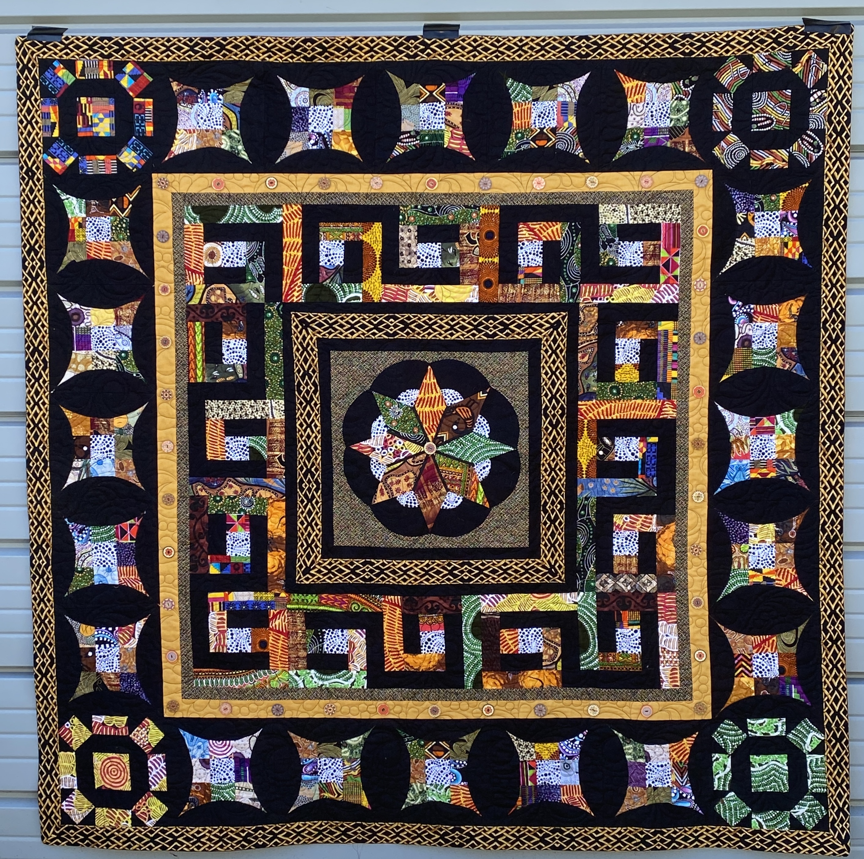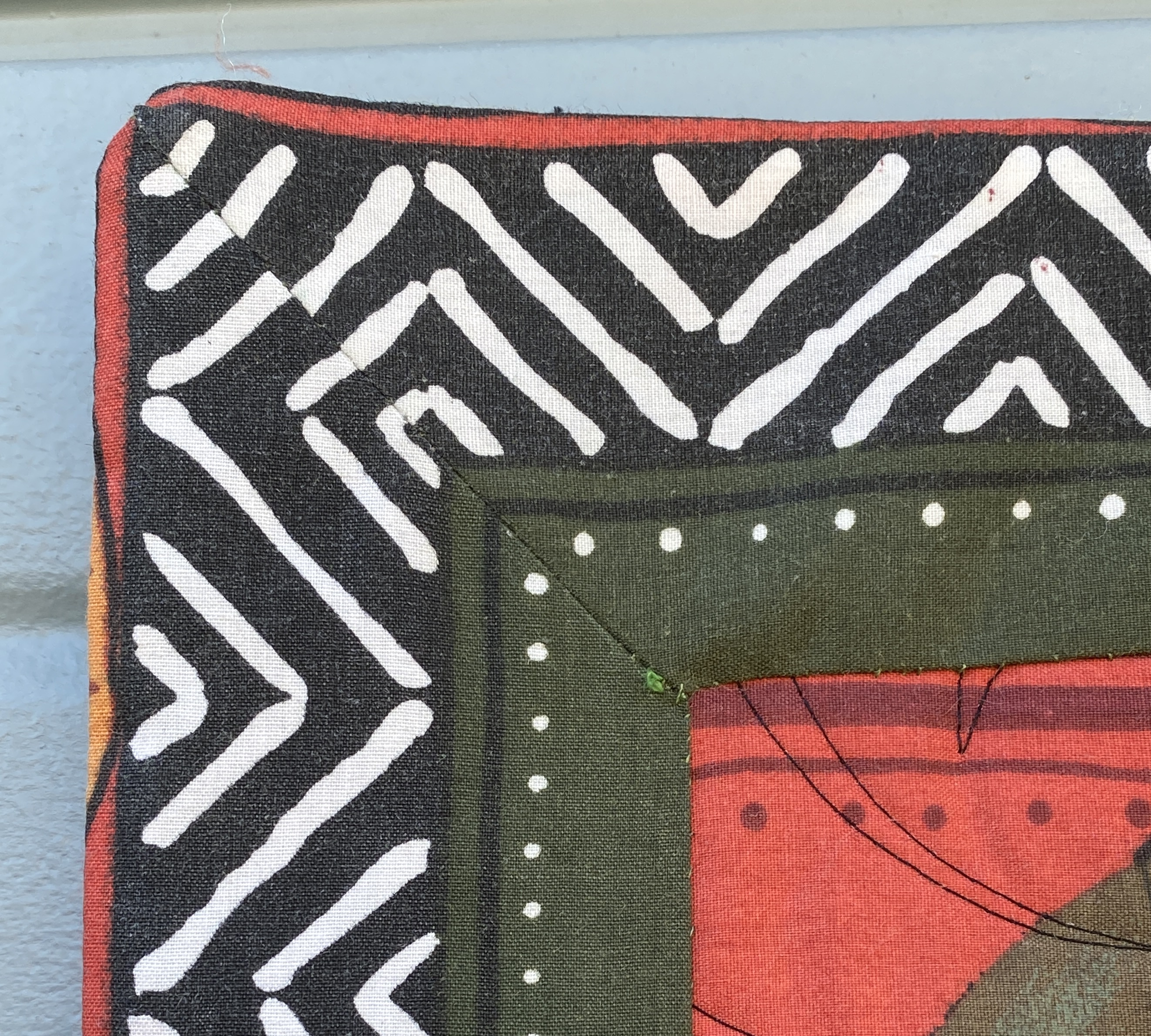 I decided that my quilt was ready to be quilted. The fabrics just didn't speak to me to continue another round. In the yellow section of the quilt I found decorative wooden buttons to tie the look together. I also watched the recent "Master Class" and really liked Patricia Belyea's way of Facing her quilts. So I decided to try this. I used a single layer (instead of double) and I mitered the corners. I loved the overall look at the back of the quilt with this idea. I found that the design of the fabric I choose was probably not the best for this project, but the fabric truly spoke to me in terms of what was going to work and what wasn't. I'm glad to have started this quilt project but I glad it is also done.
